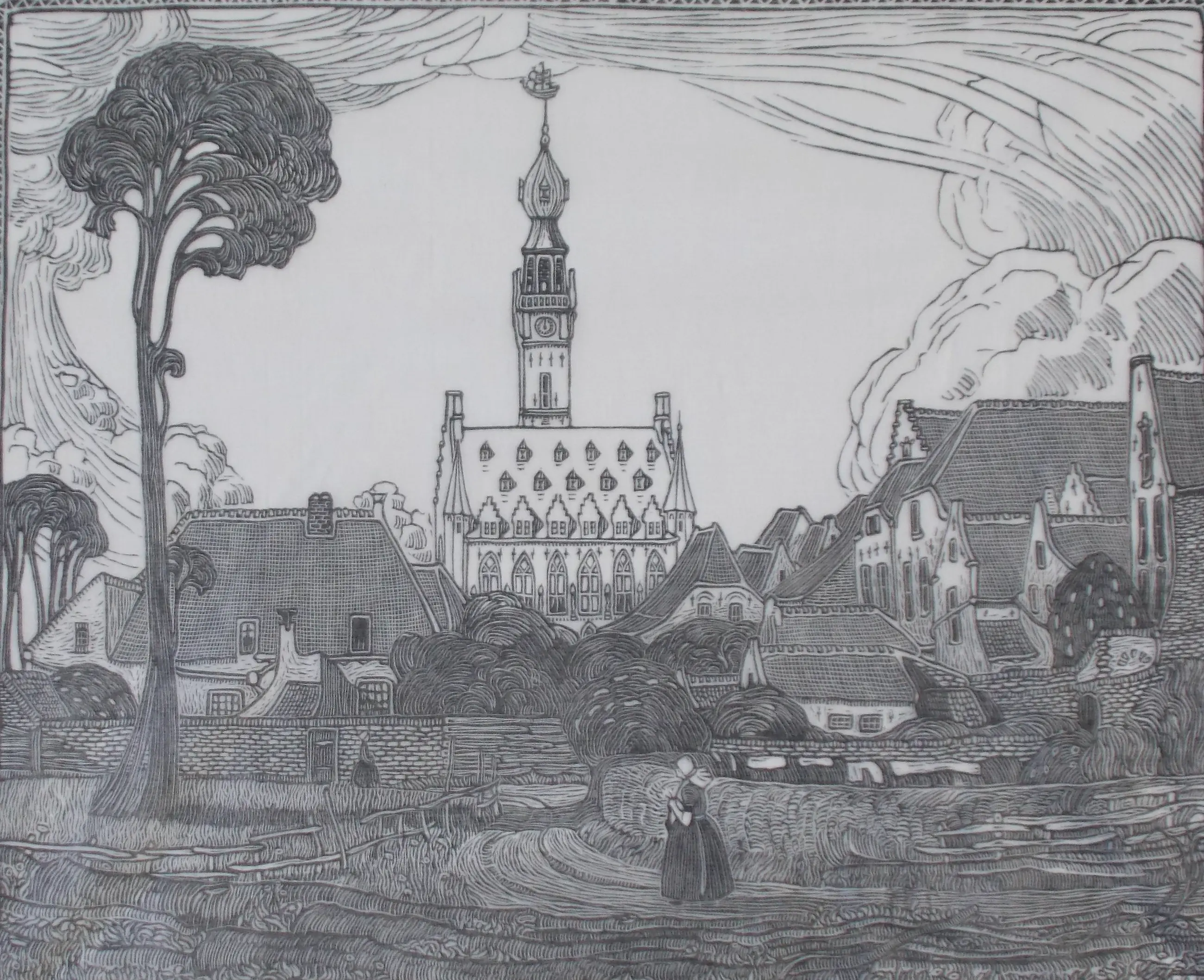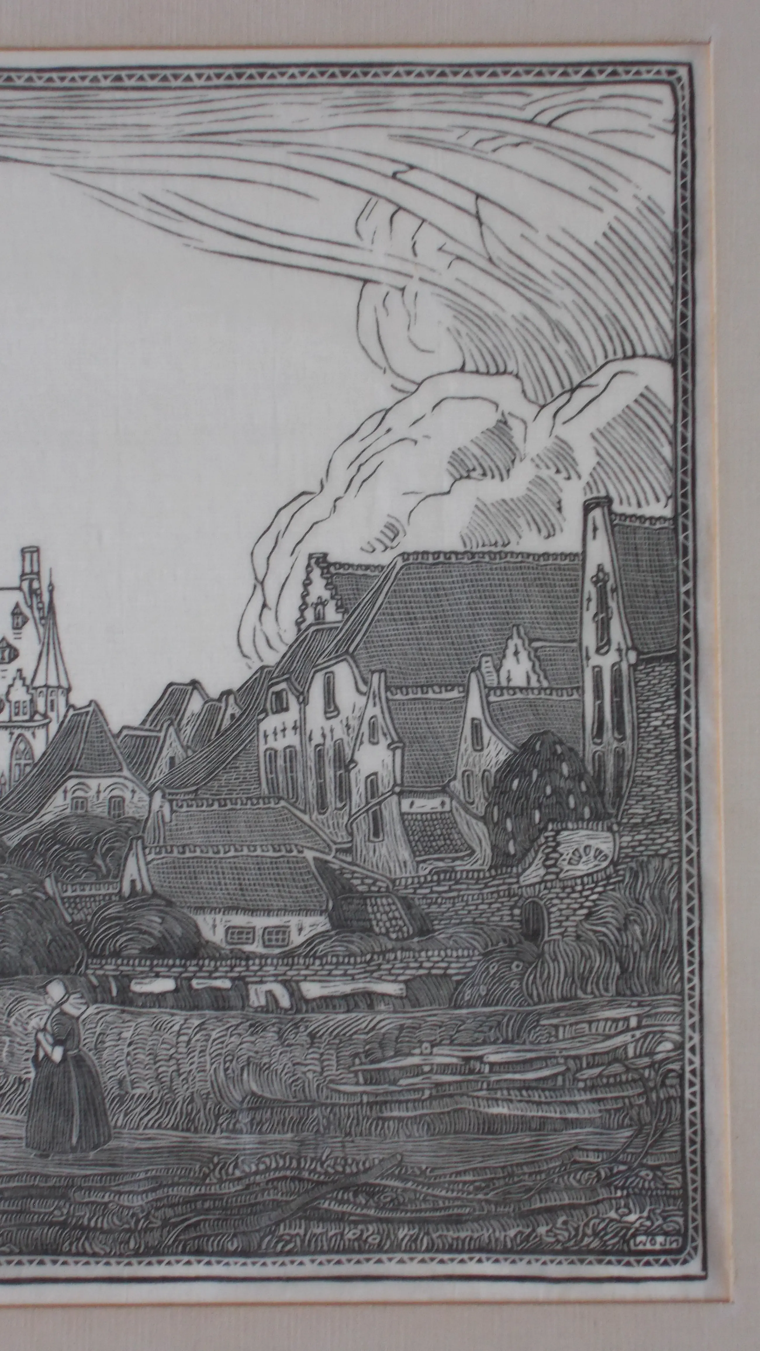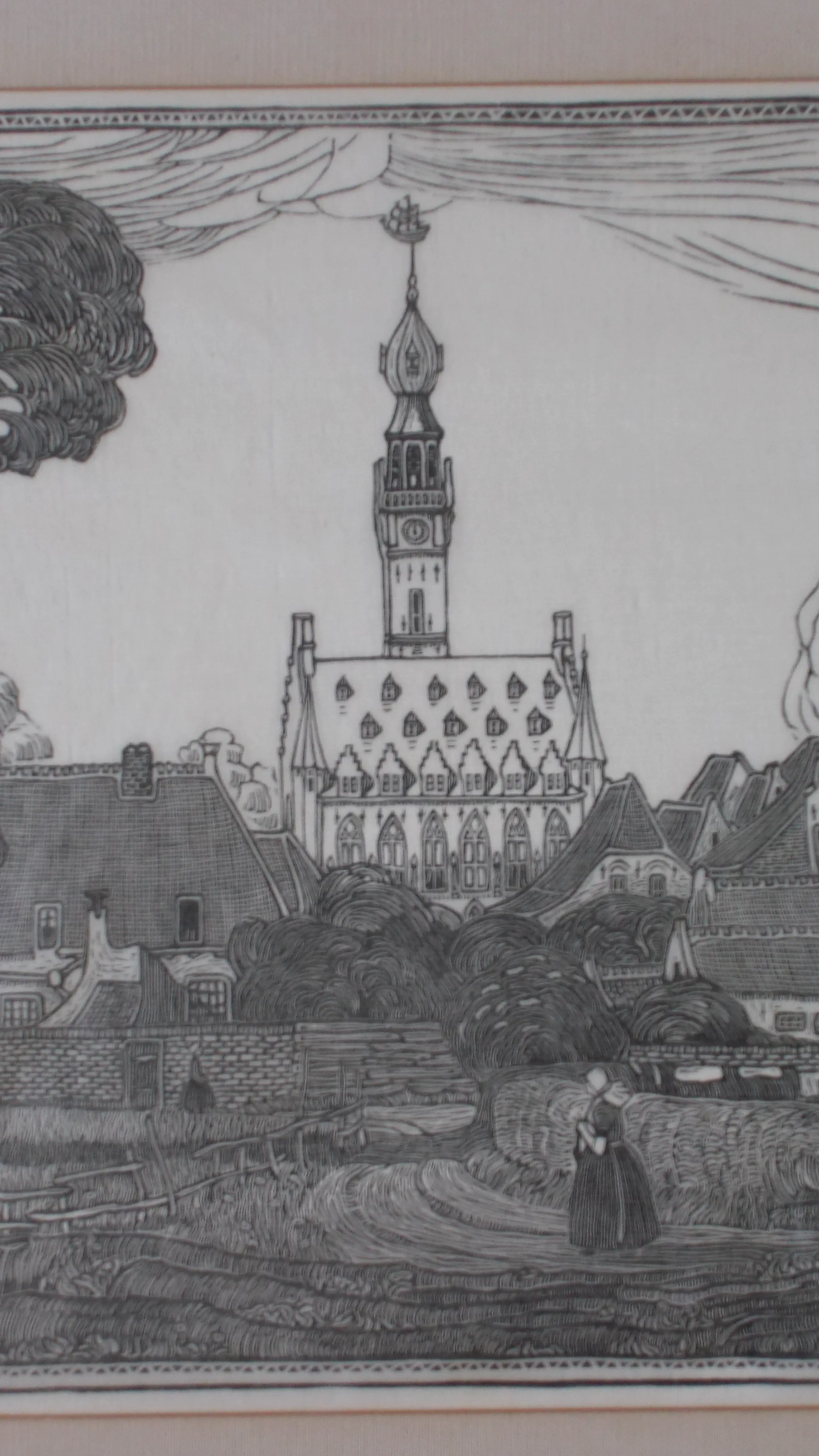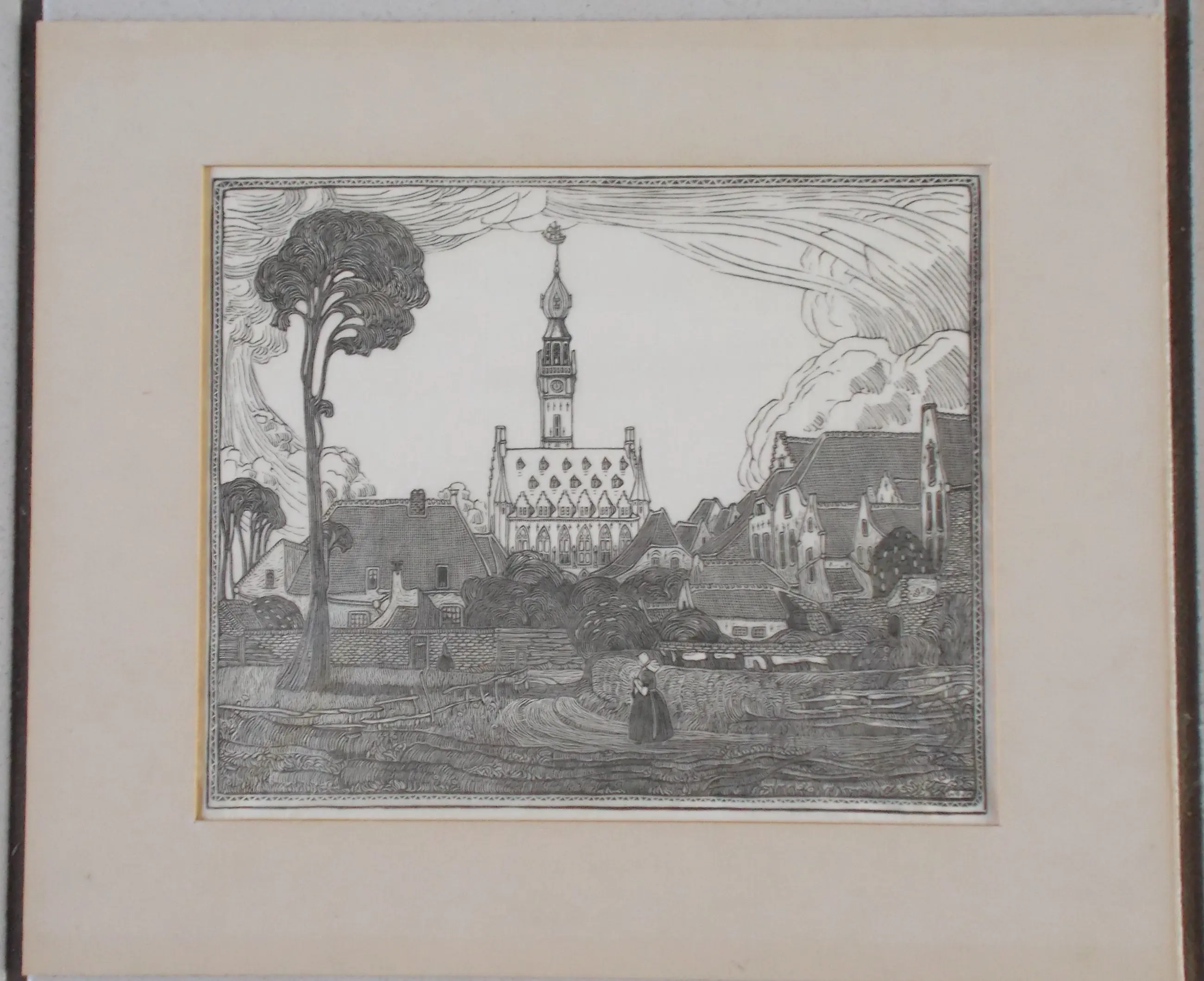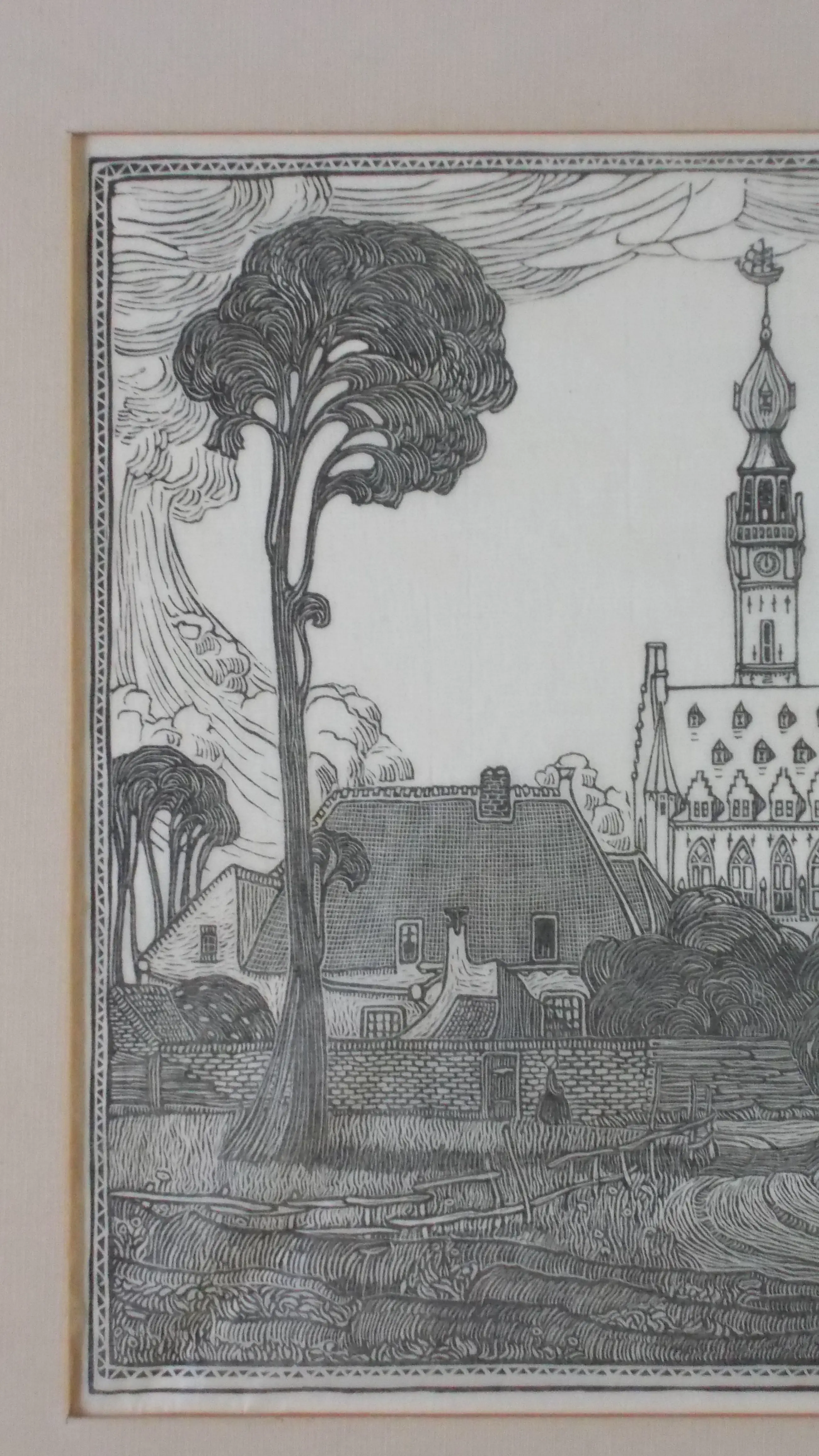 Houtsnede uit 1902 met een kijkje op Veere met in het midden het stadhuis.Gecatalogiseerd onder nummer H 35.Onder passe partout maar niet opgeplakt.Beeldmaat 18,5 x 22,5 cm.Initialen in het blok rechtsonder.
