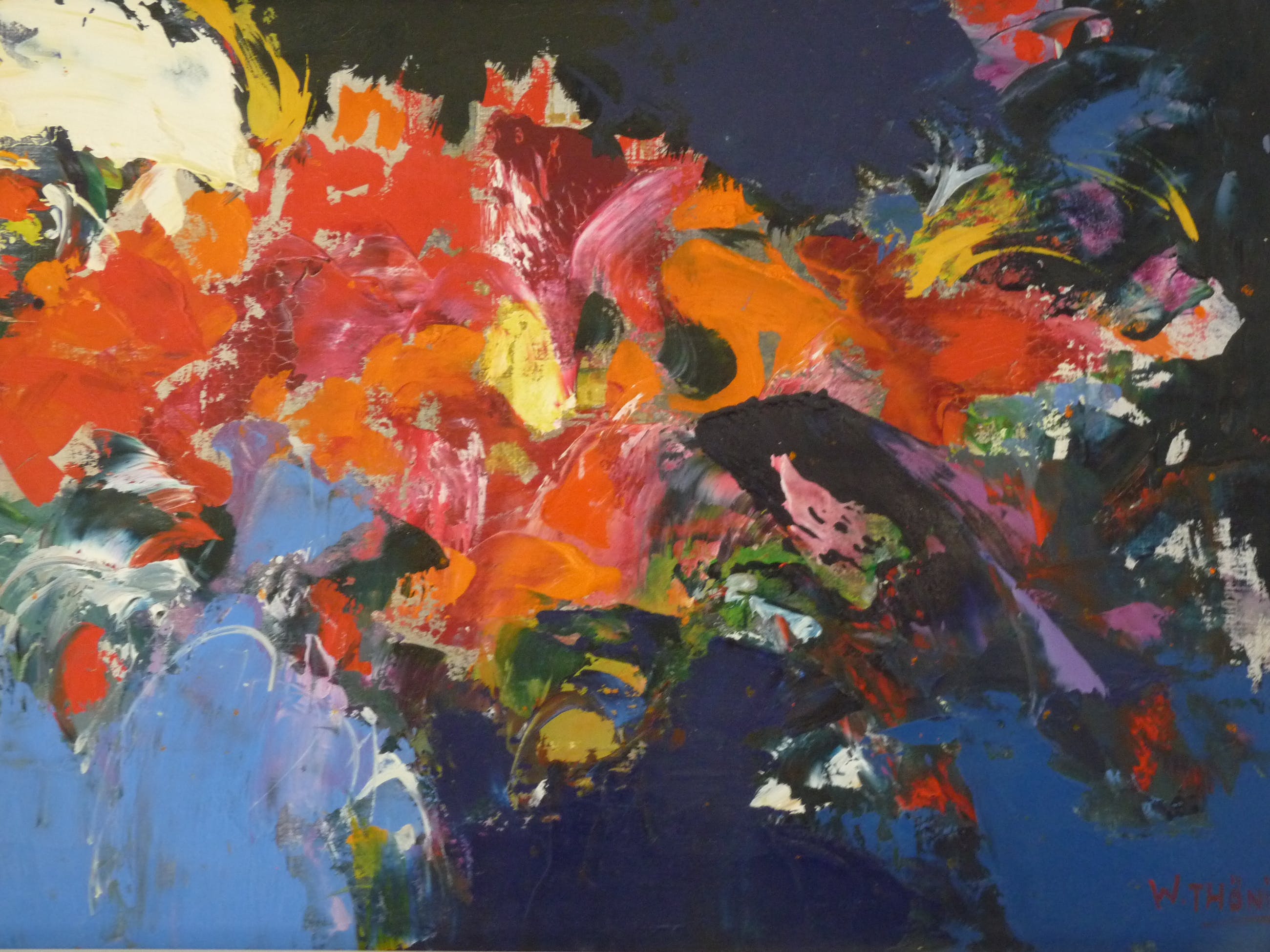 Fraai kleurrijk schilderij met als onderwerp een geabstraheerd bloemenboeket in vaas. Jaartal onbekend.