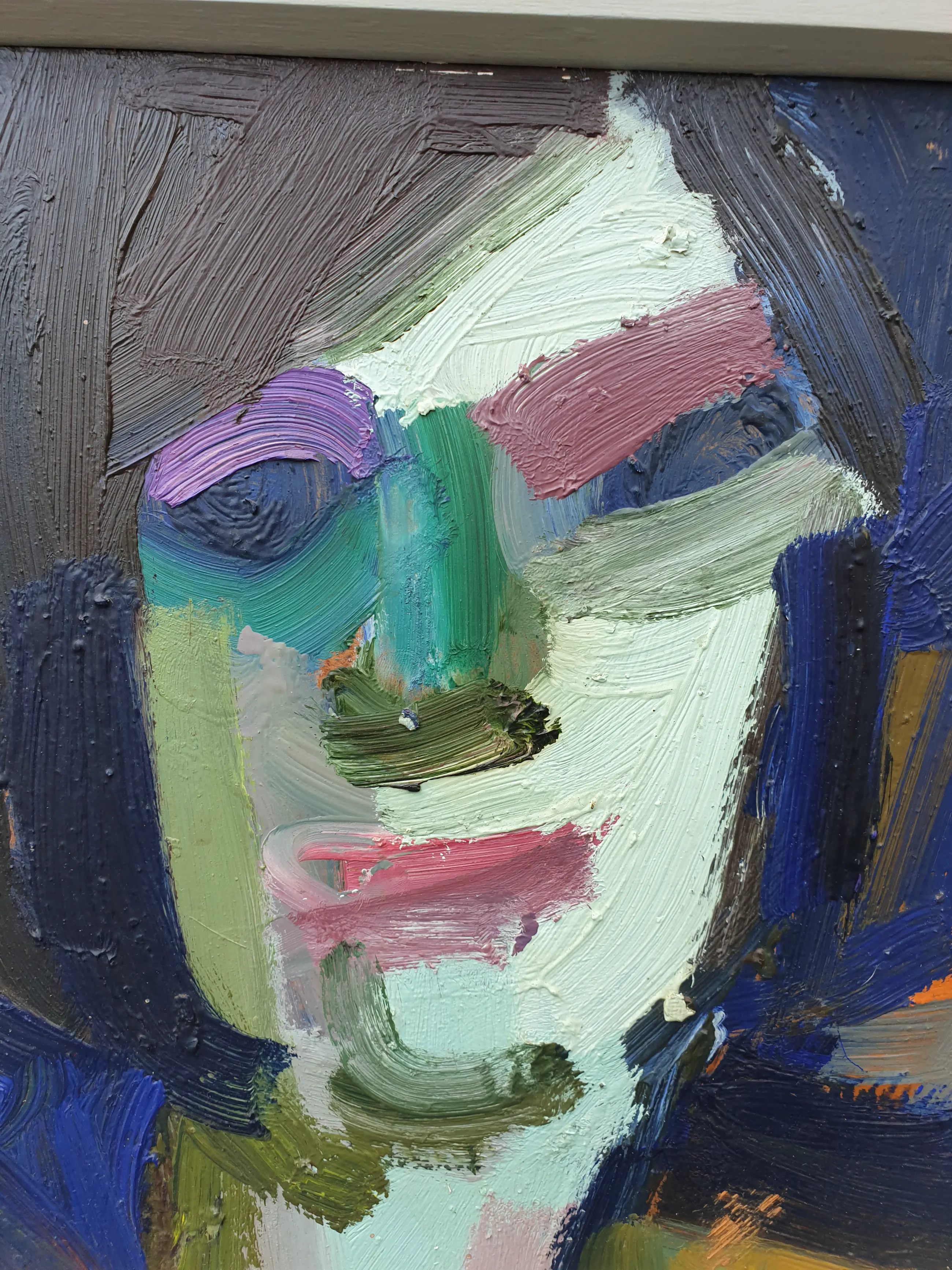 Olieverf op paneel van Wijnand van Lieshout. Portret van een gezicht. Dit item komt uit de collectie van kunstschilder Frans van Riel (1943-2019)