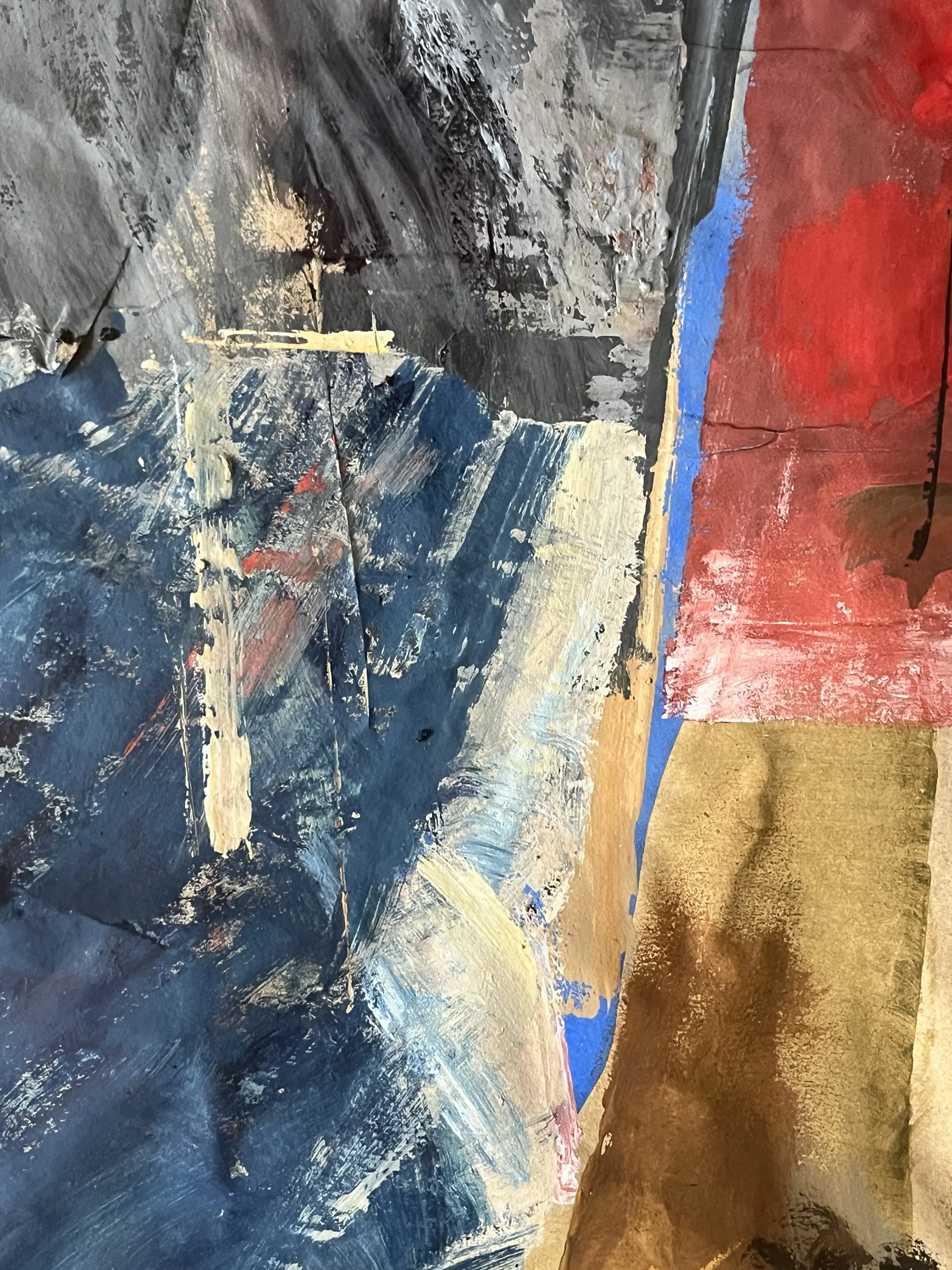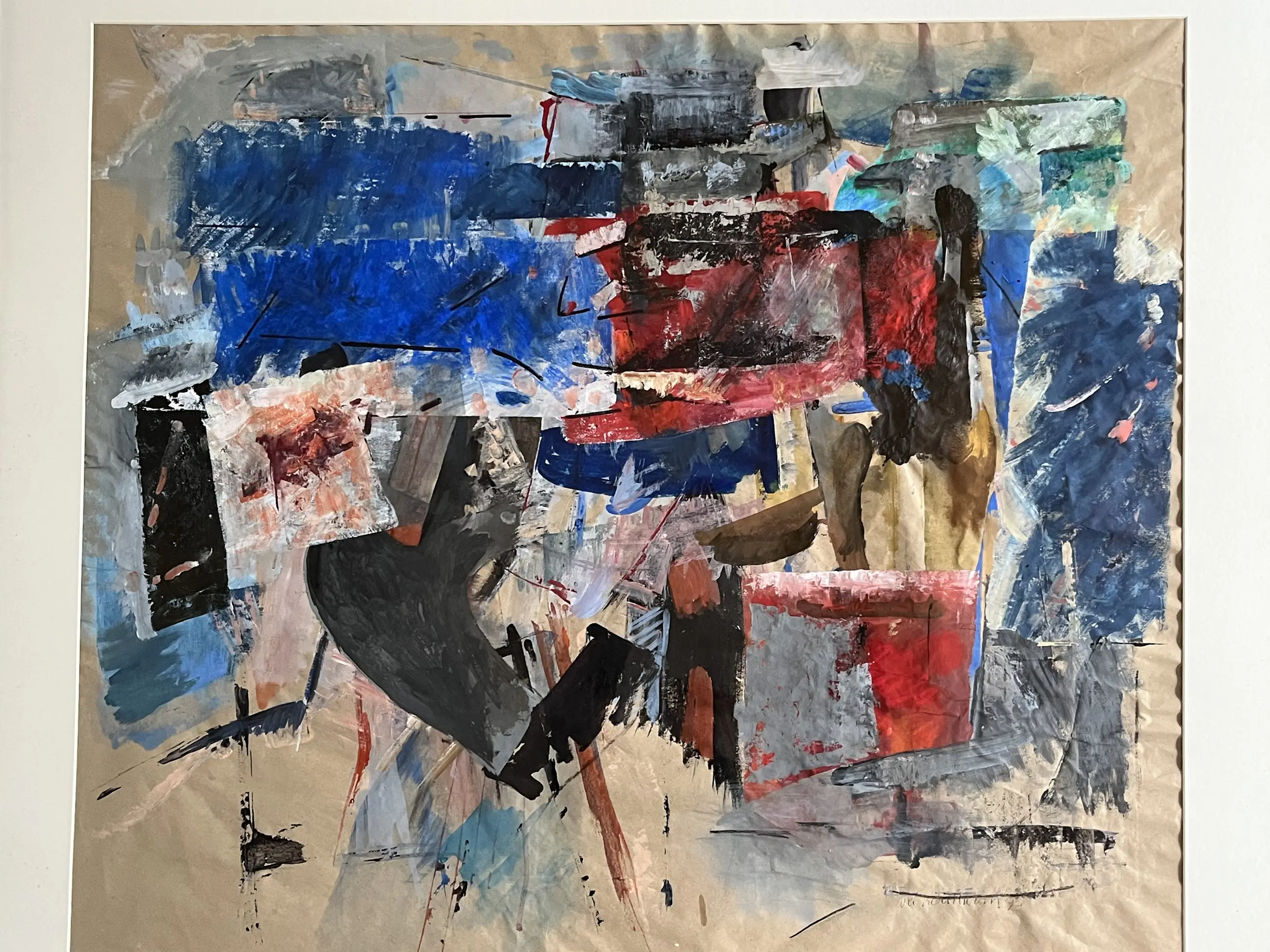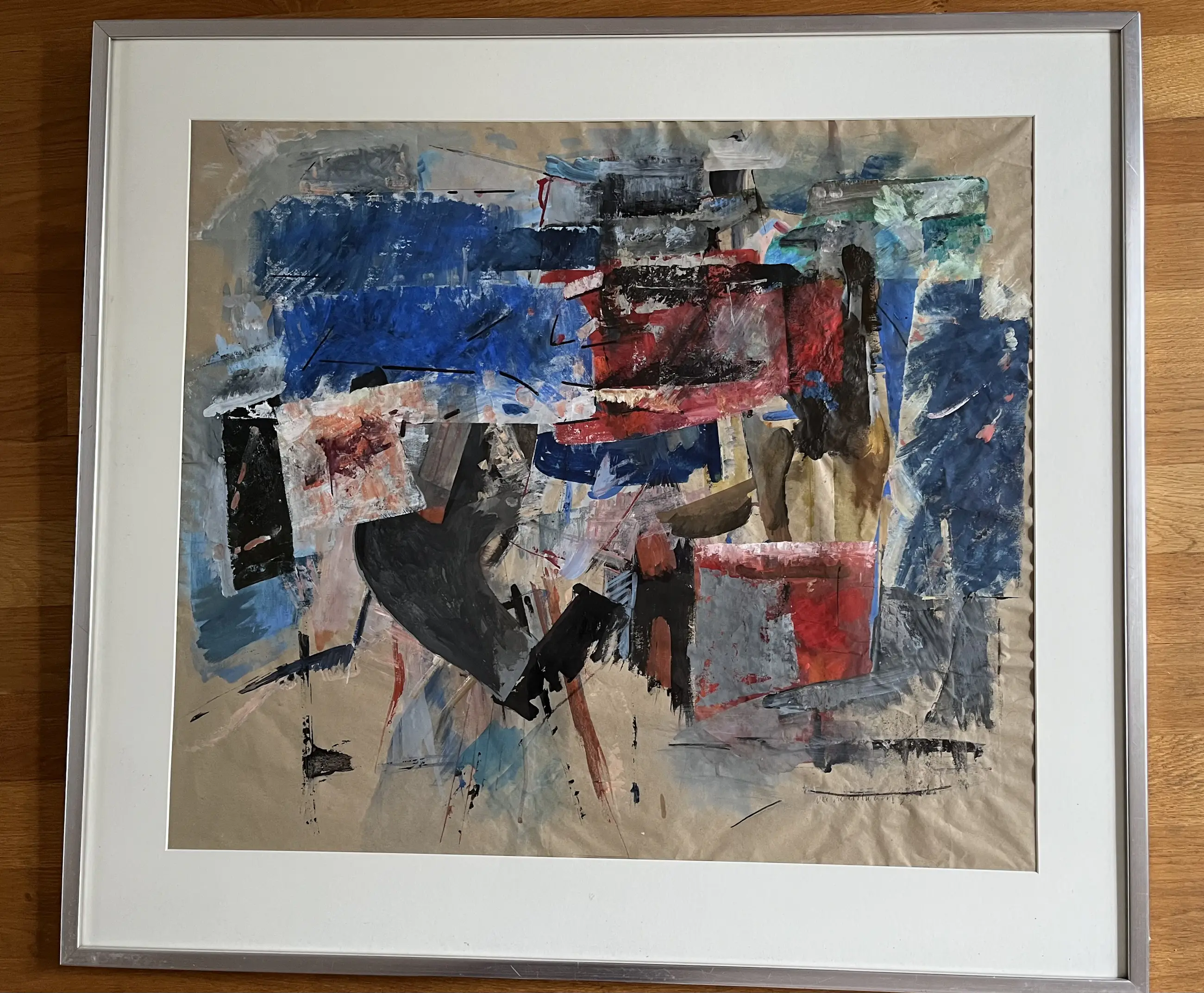 Karakteristiek werk uit 1995. Gouache is gelijst in zilverkleurige lijst met lichte gebruikssporen. (Detailfoto’s) Blad is wat gebobbeld. Is niet storend. Afmeting gouache 75 x 87 cm. Inclusief lijst 98 x 109 cm.