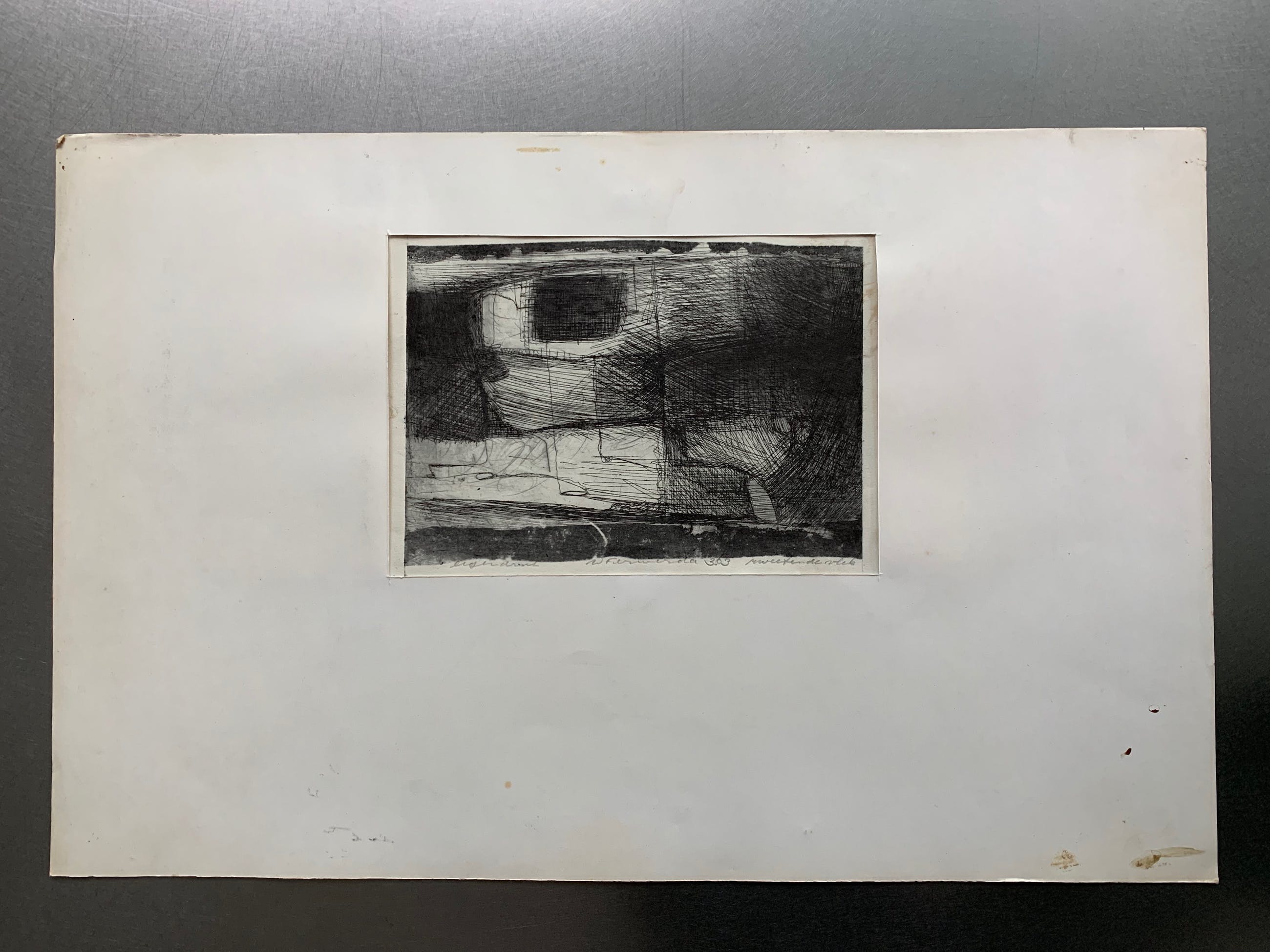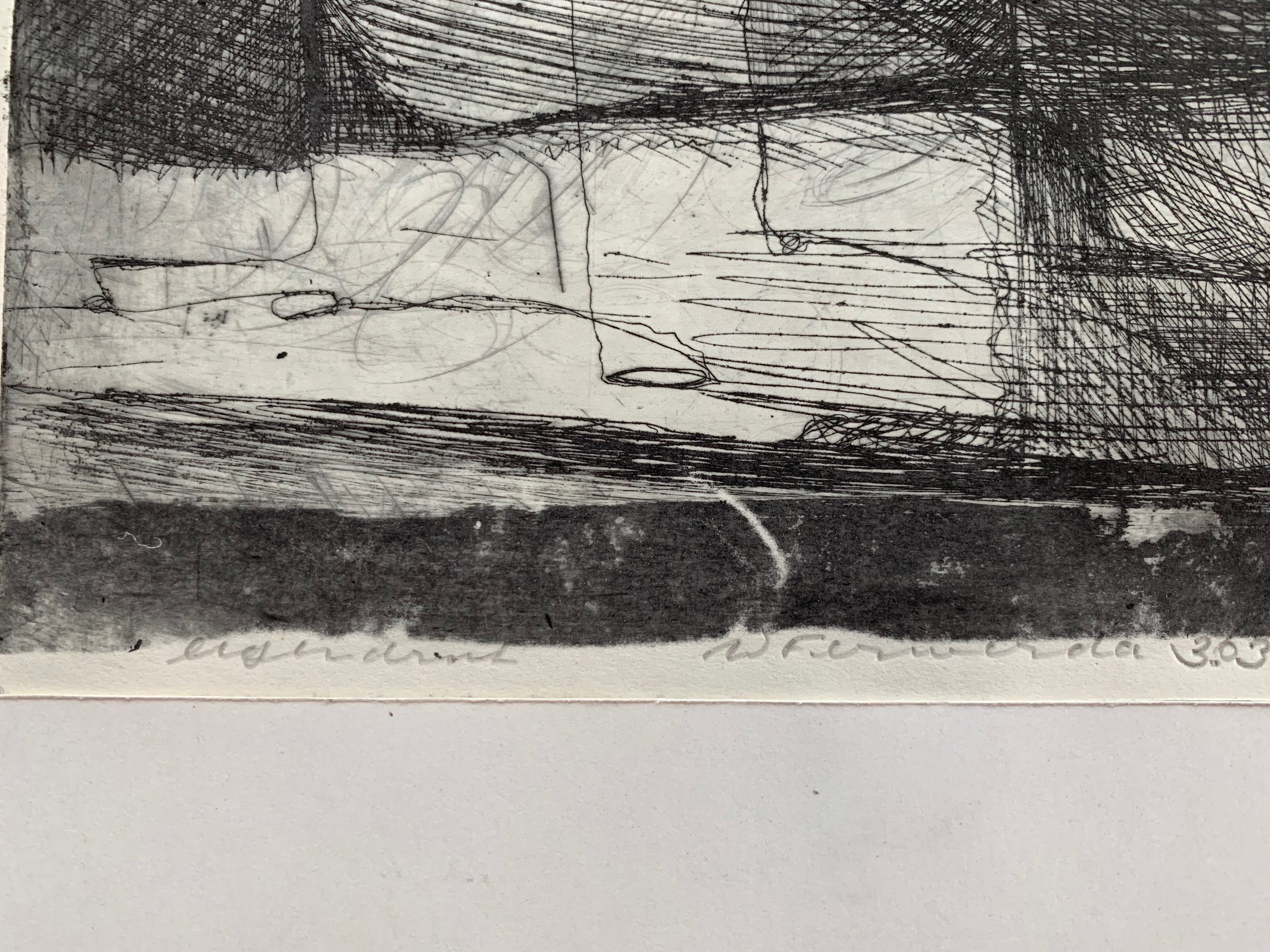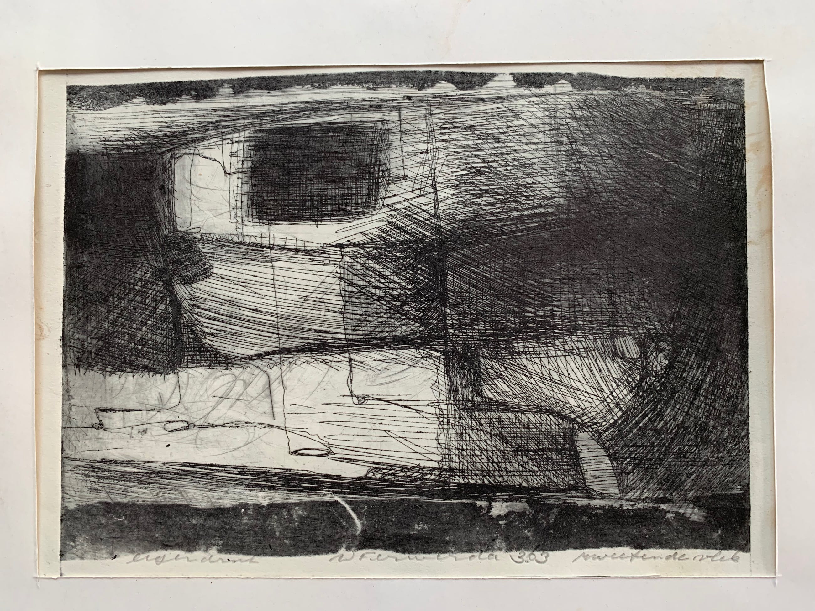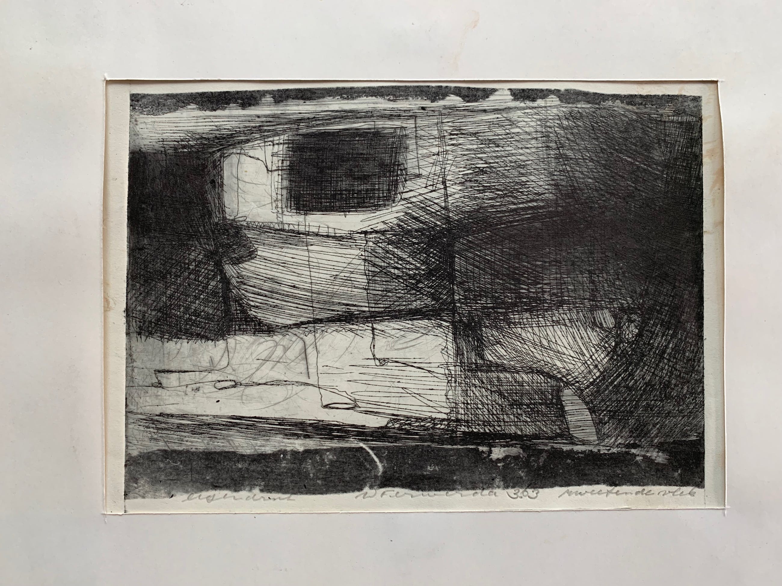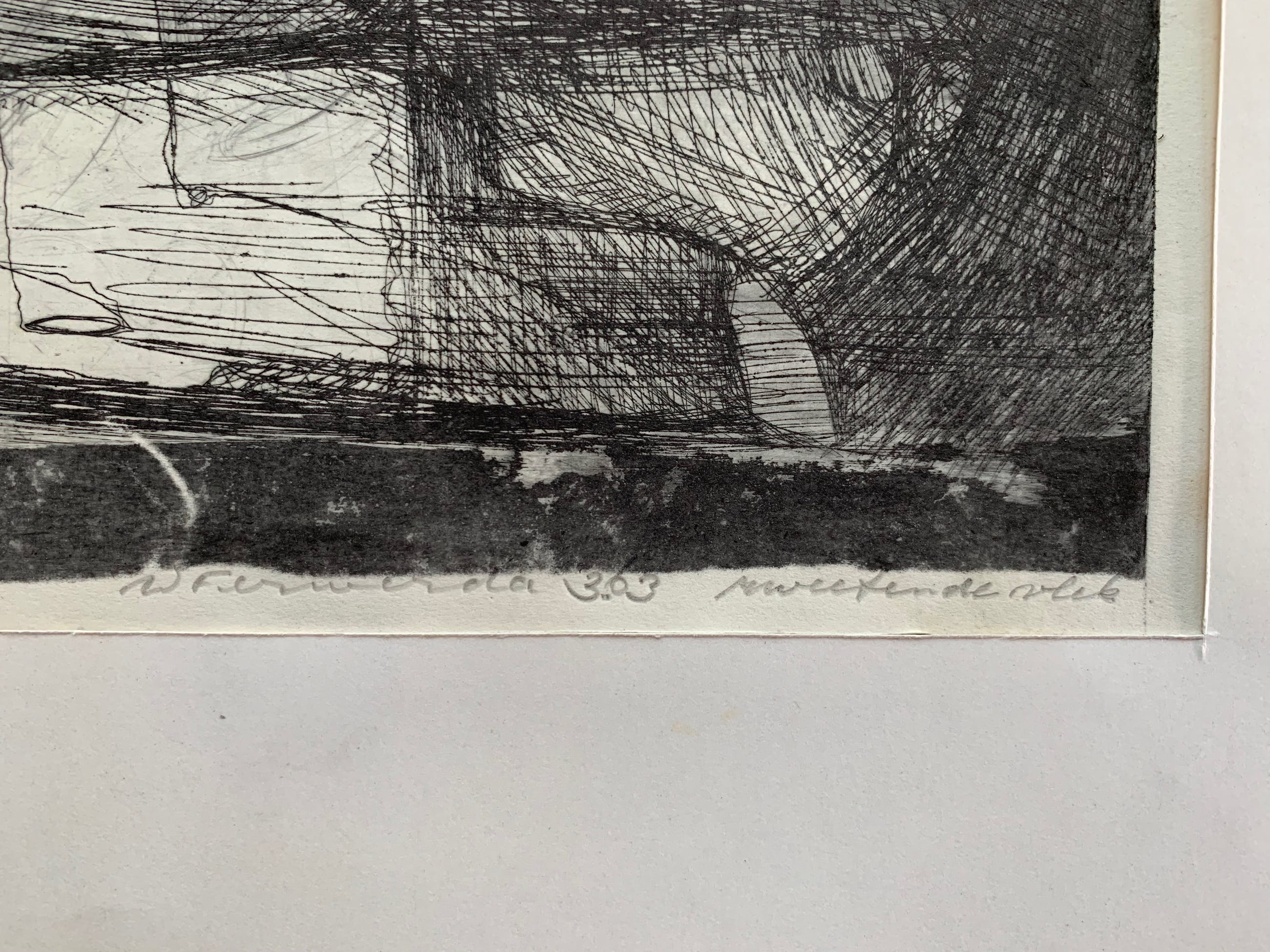 Aangeboden wordt een ets van Ferwerda uit 1963. De titel is niet helemaal duidelijk. Kan eventueel ook Zweetende Vlek zijn ? De eenvoudige passe partout is van papier 32,5 cm hoog X 50 cm breed.