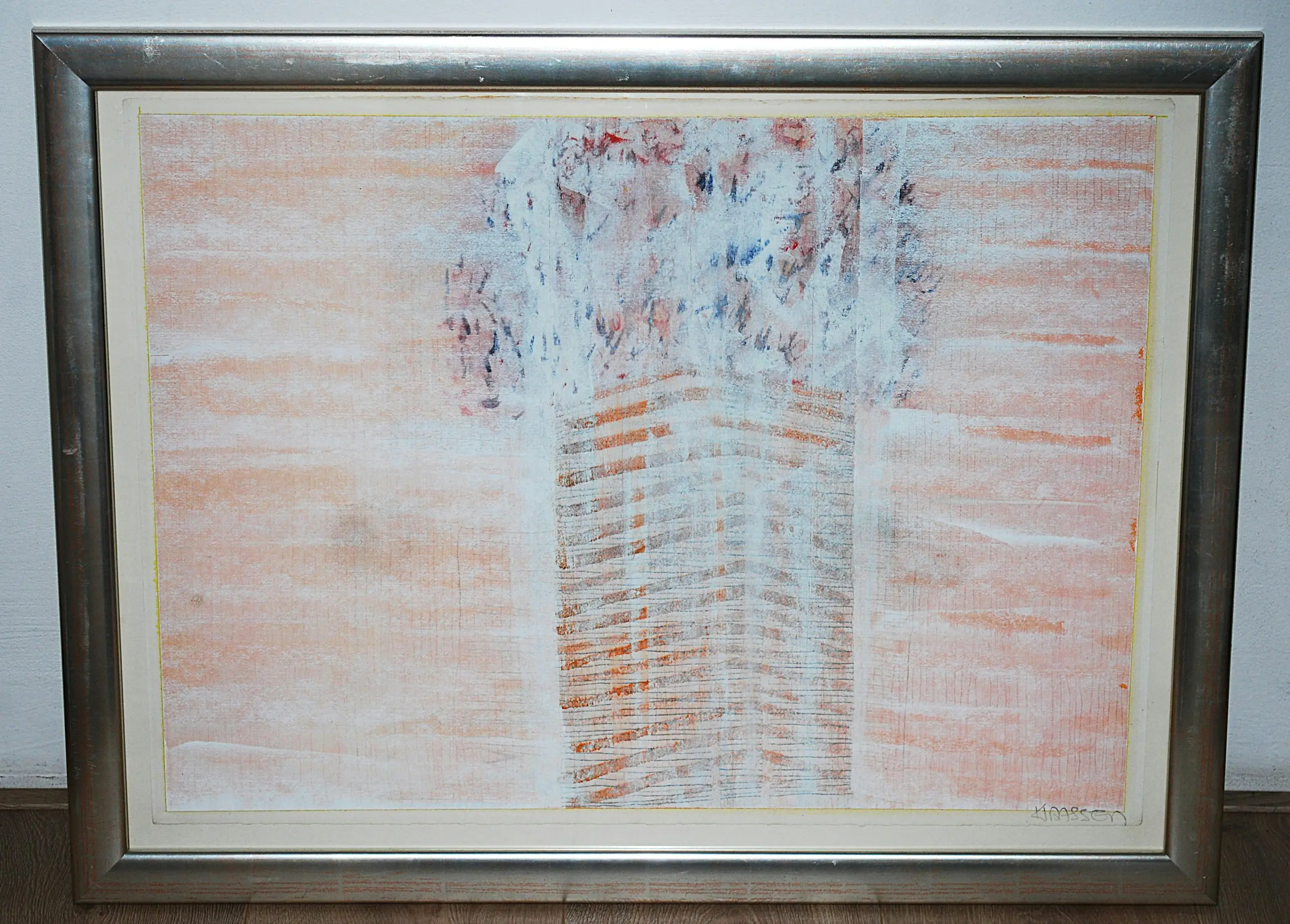 Gemengde techniek (met name gouache) op papier. Het blad is licht geplaatst op karton, achter glas. In een fraaie houten lijst. Voormalig deel van de CBK collectie. Let op: