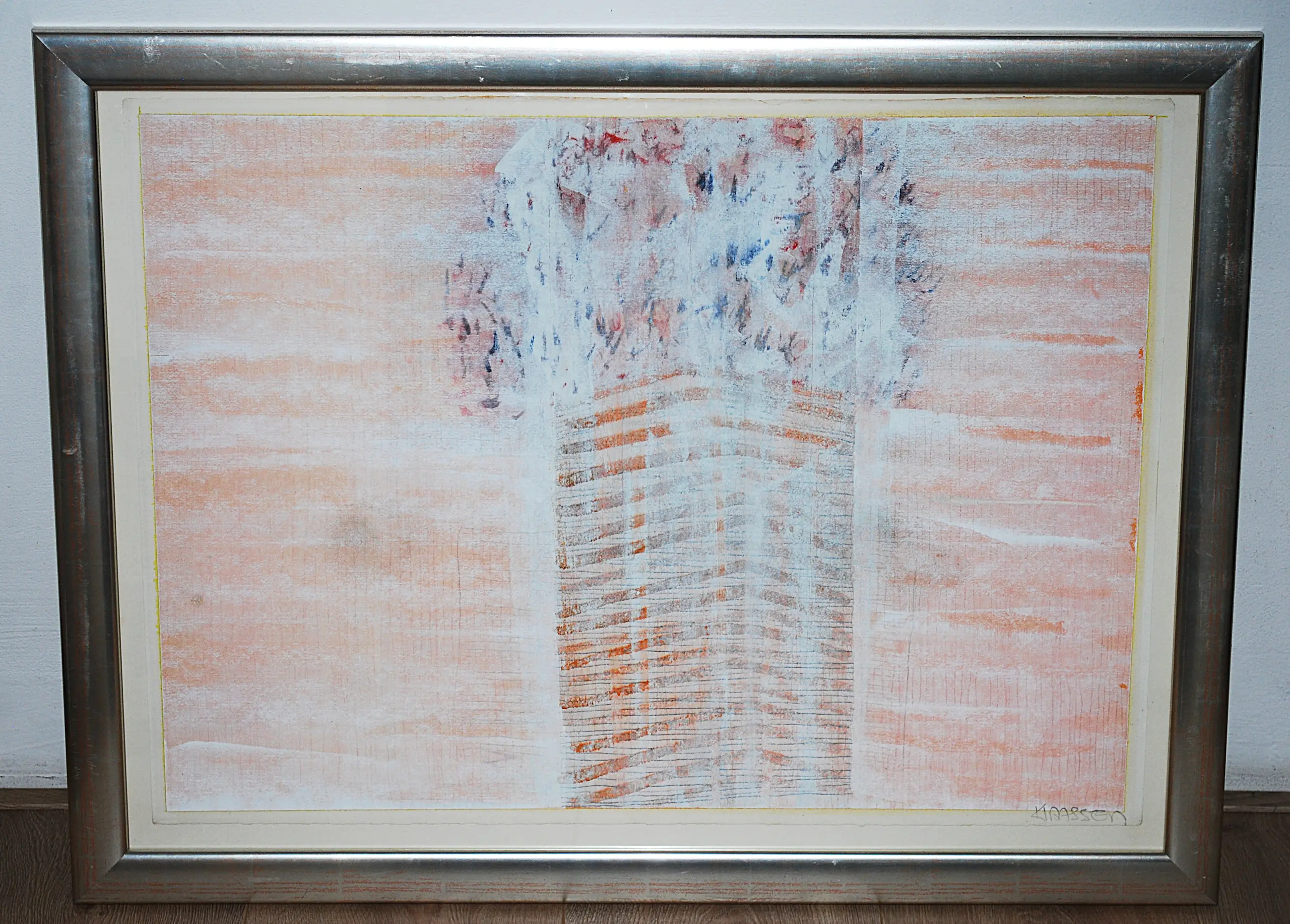 Gemengde techniek (met name gouache) op papier. Het blad is licht geplaatst op karton, achter glas. In een fraaie houten lijst. Let op: