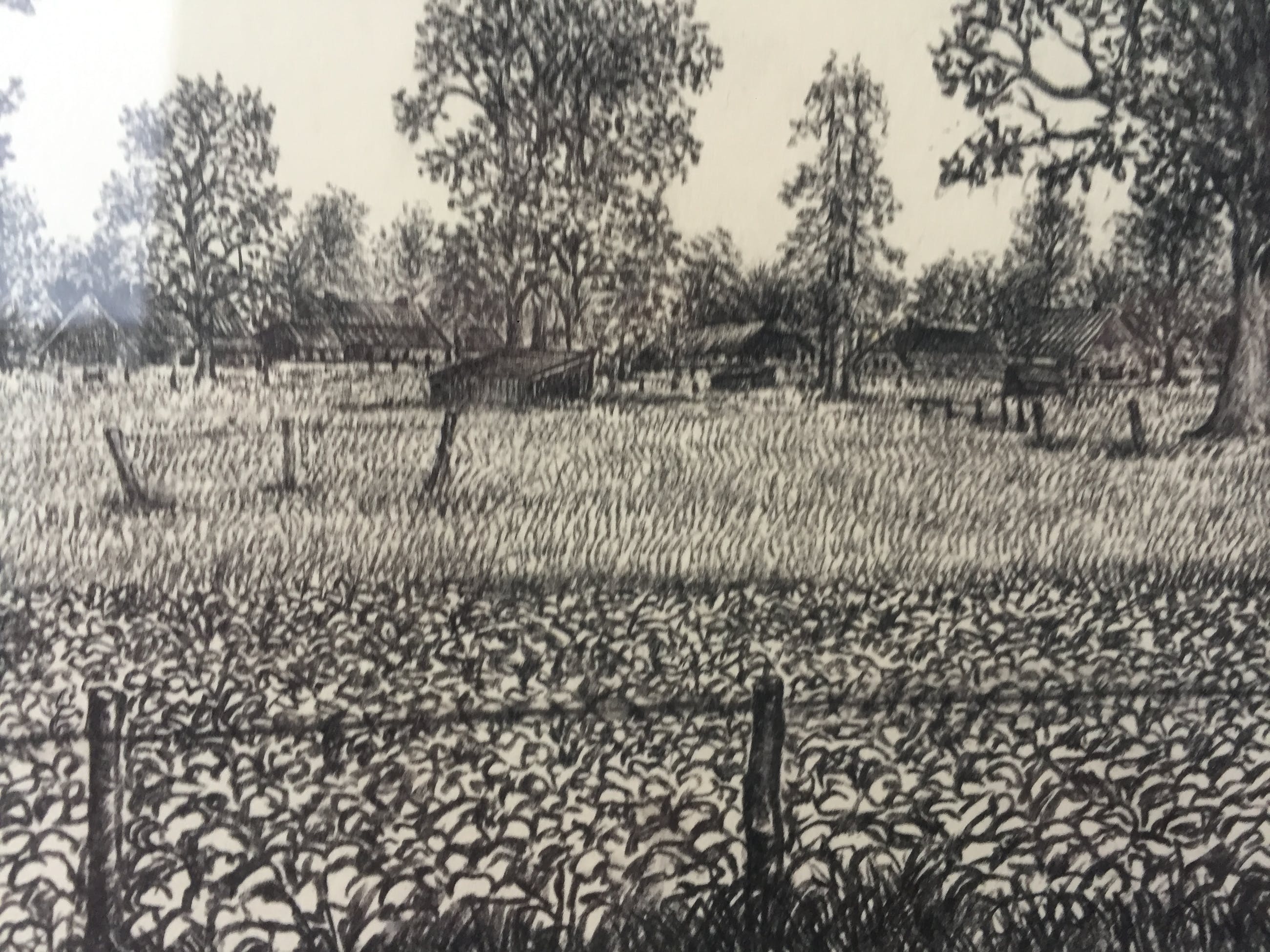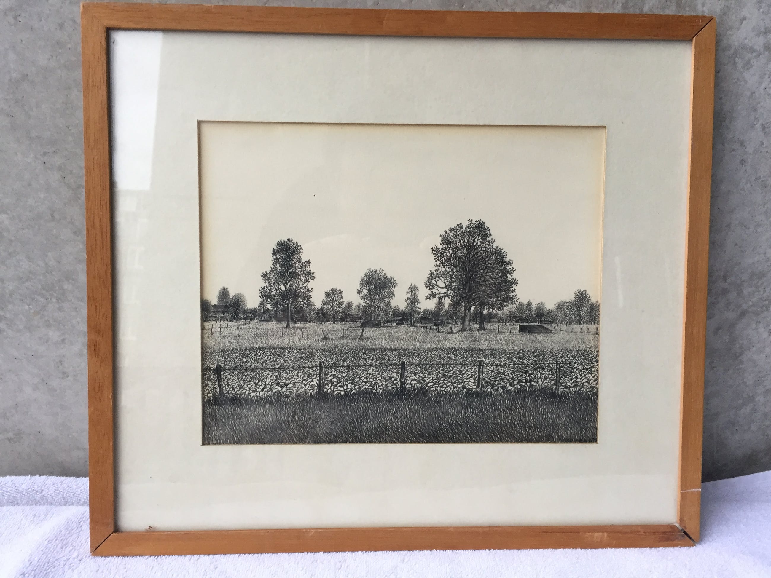 Ingelijst achter glas, buitenmaat lijst 38 x 33 cm