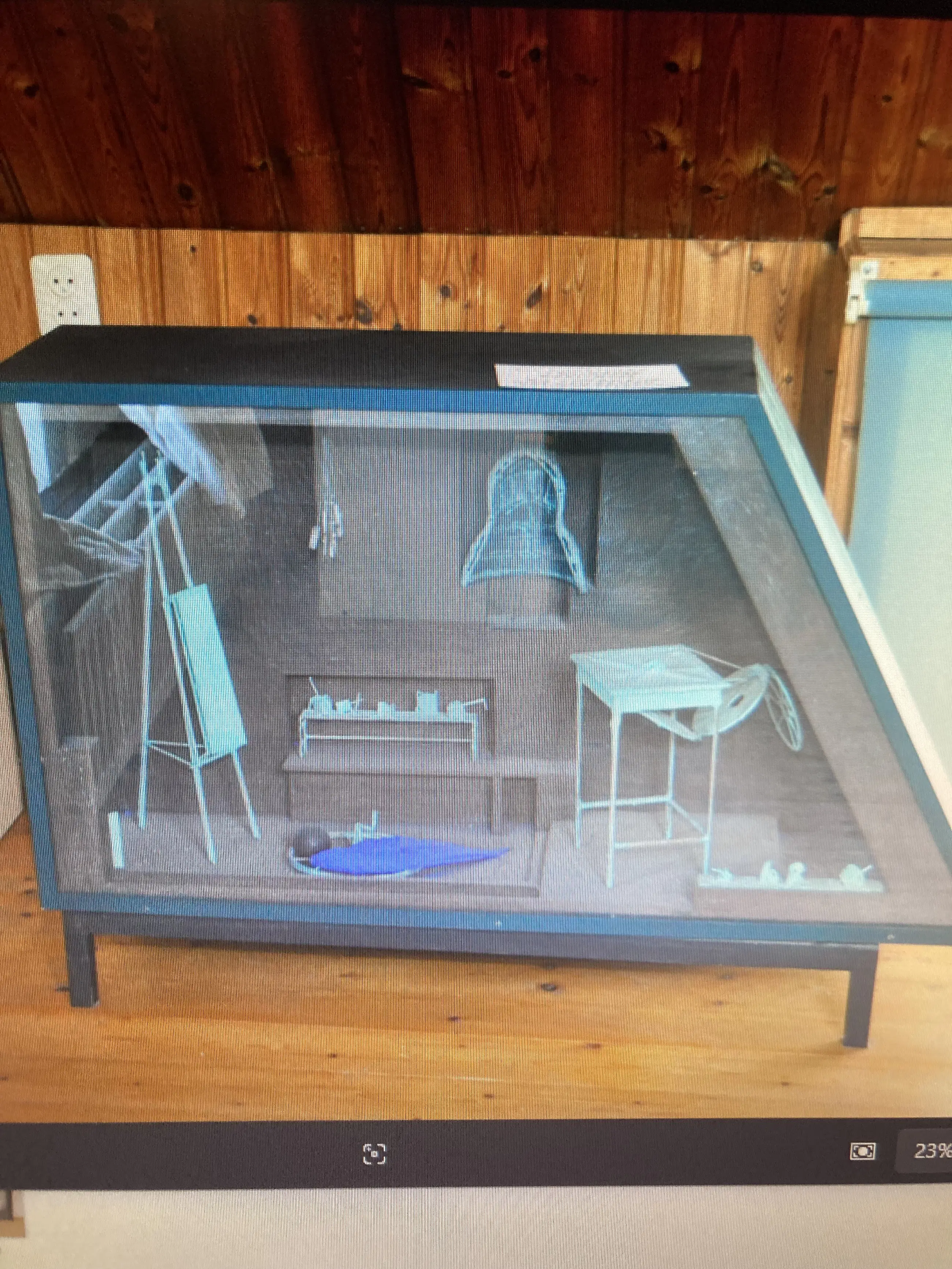 Kast met glazen voorruit (kan eruit) op los onderstel met vier pootjes. Aankoopbon bij foto,s. Buitenkast geschilderd met waterverf dus niet met nat schoonmaken.