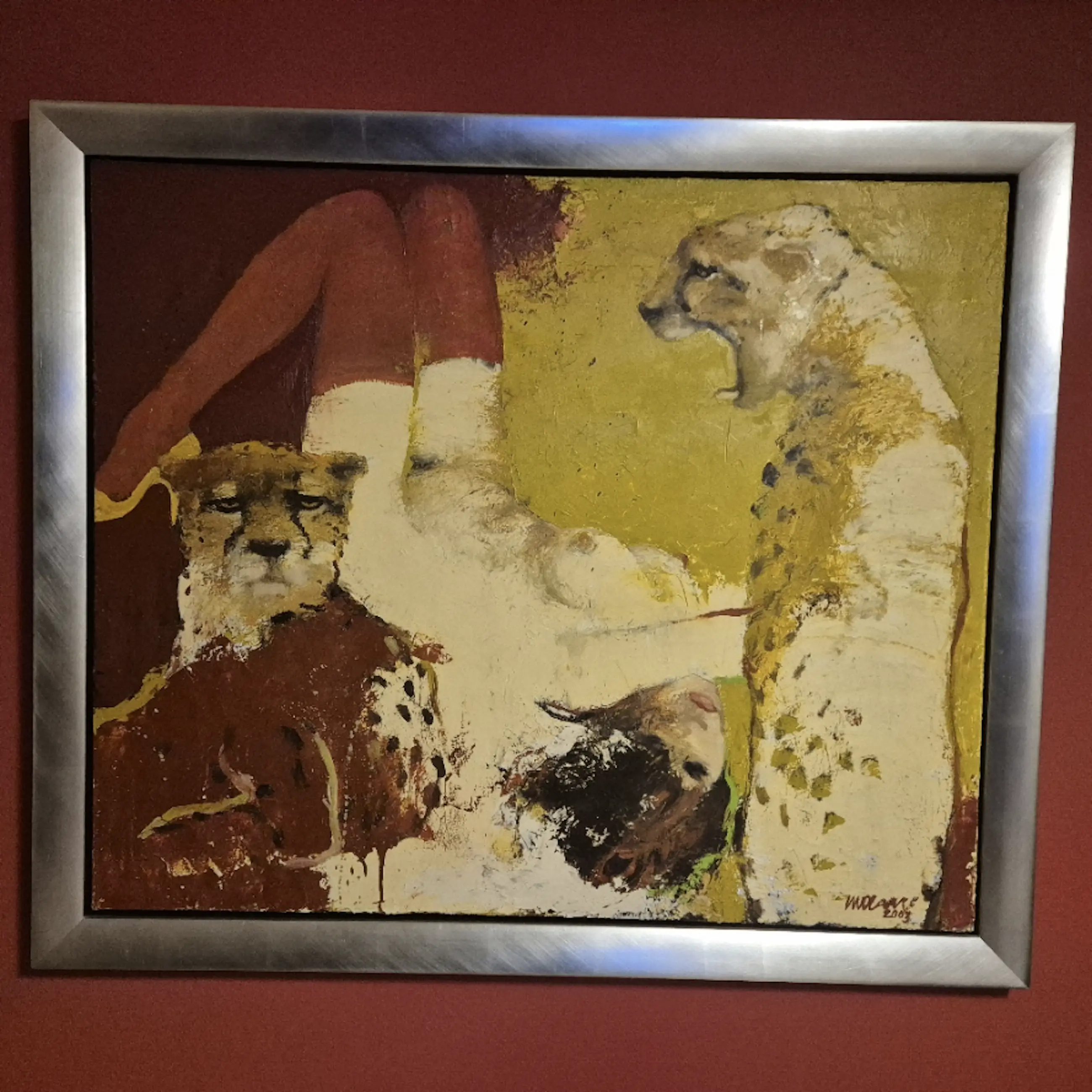 Mooi expressief werk van Wil van der Laan met liggende vrouw en twee cheetahs.