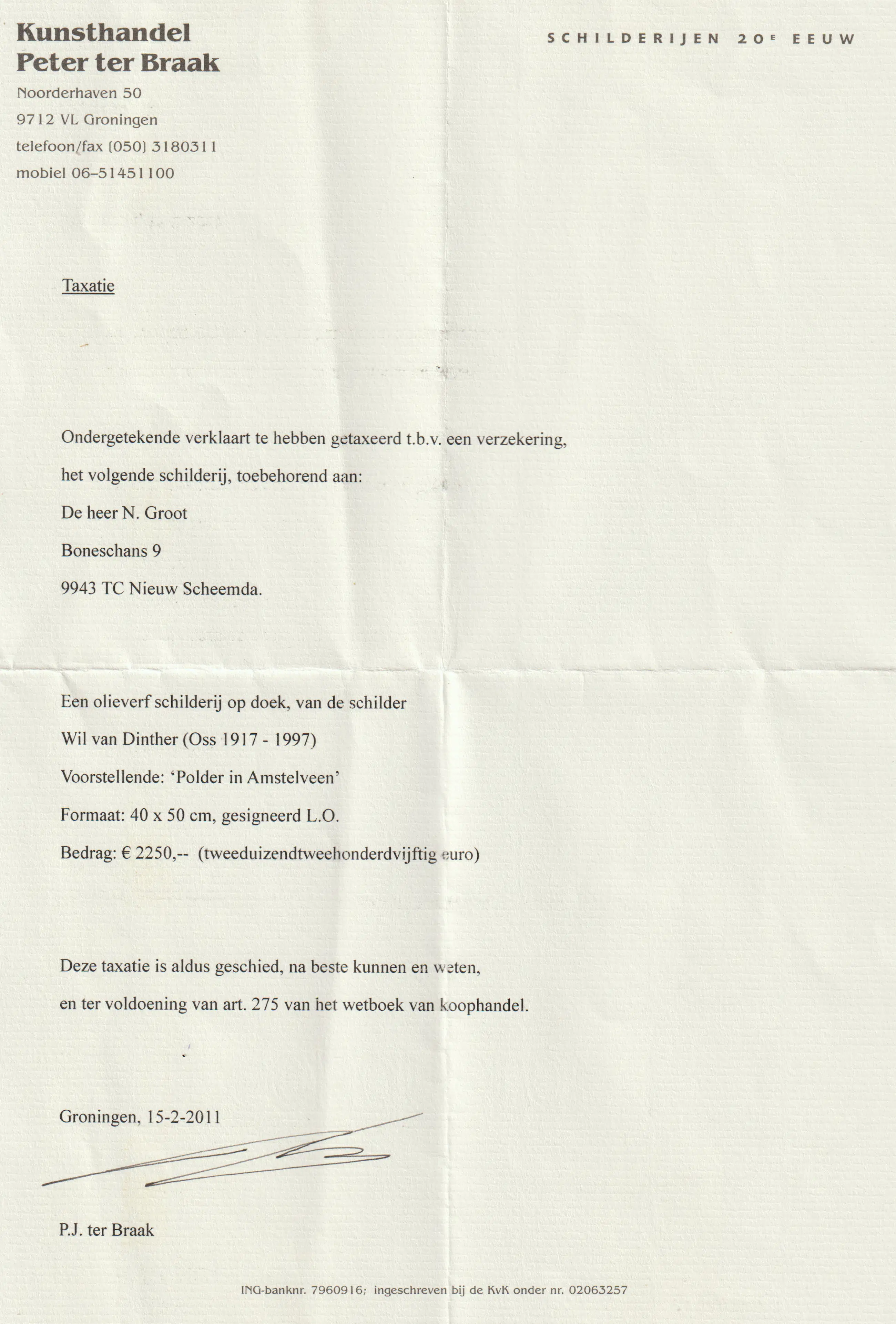 Olieverfschilderij op doek. schilder: Wil van Dinther(Oss 1917-1997) Voorstellende: polder in Amstelveen Gesigneerd: linksonder Taxatiewaarde ten behoeve van verzekering: € 2.250,--