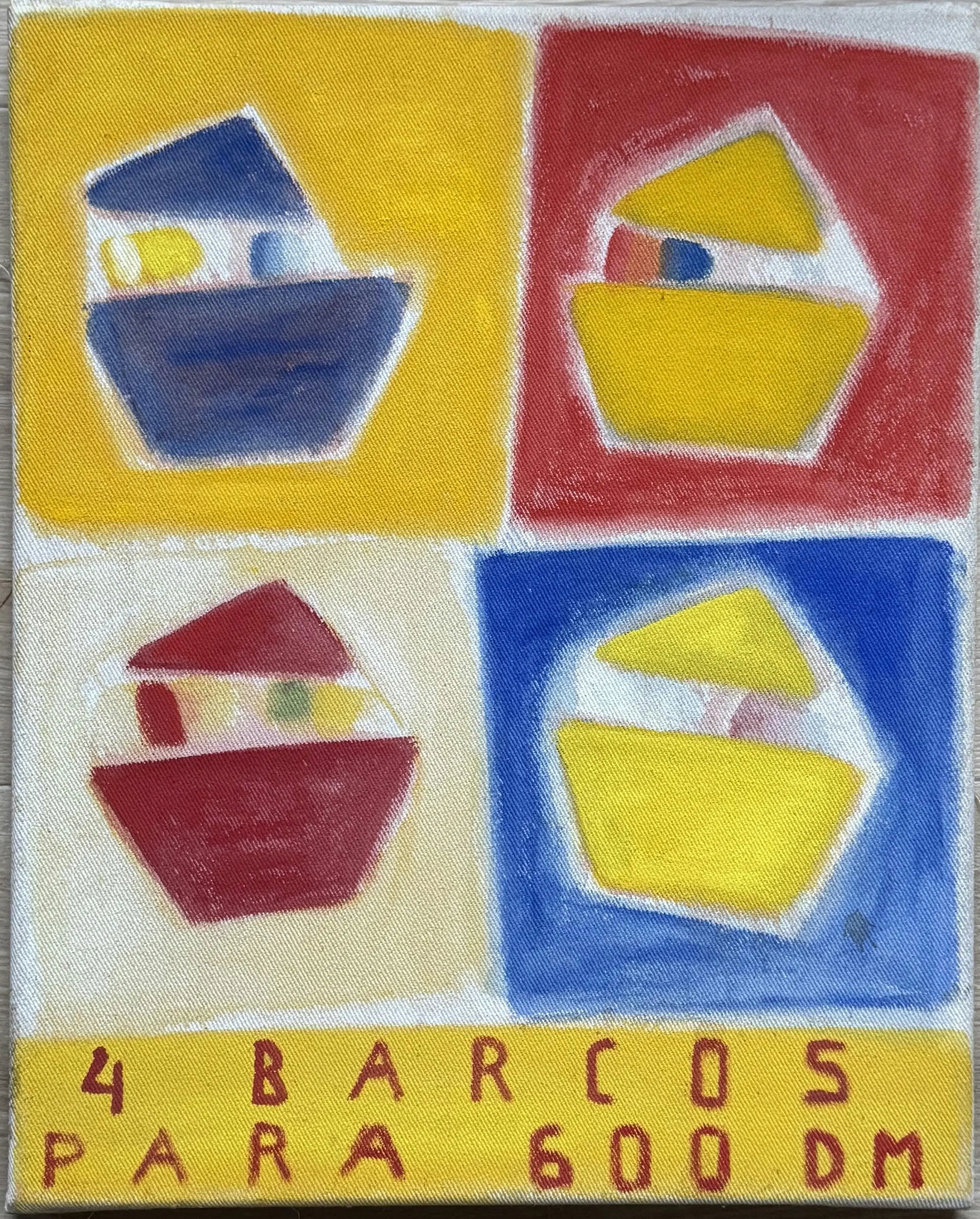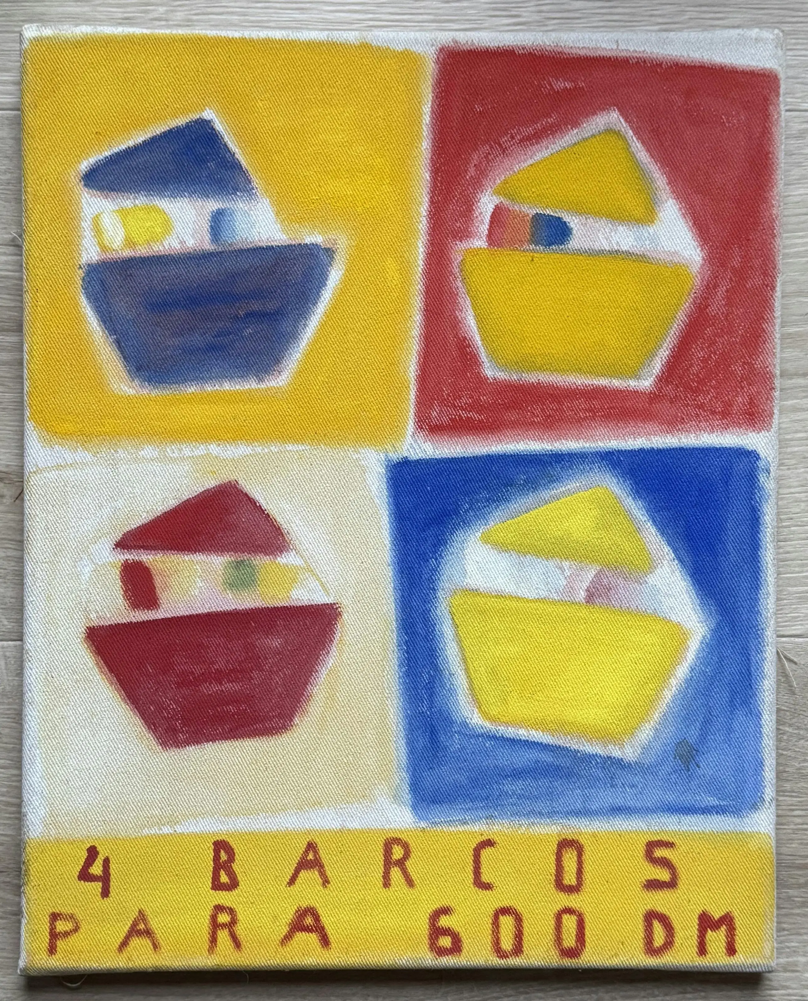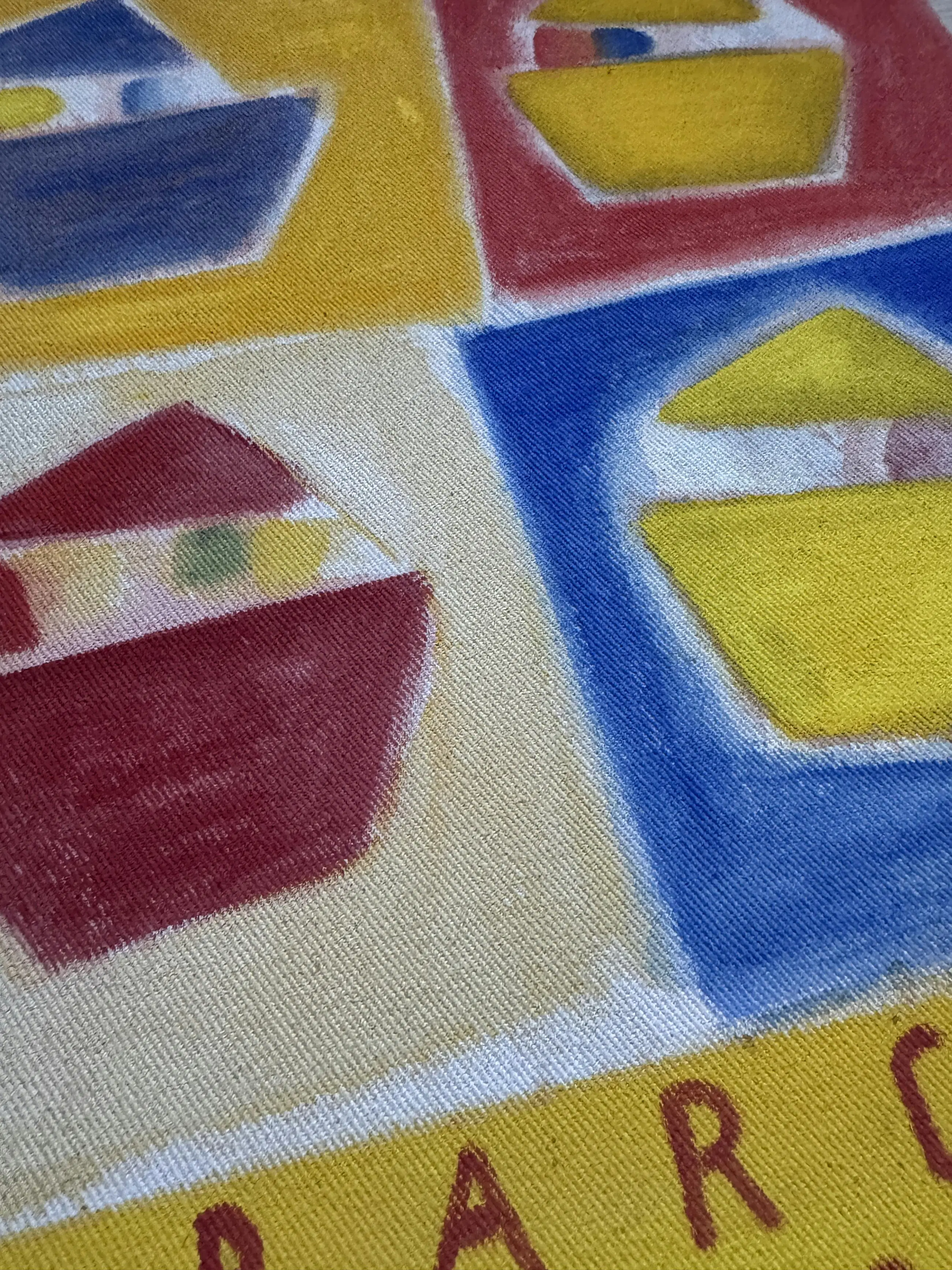 Vrolijk en kleurrijk werk van Wil Wiegant, uitgevoerd in olieverf op katoen.