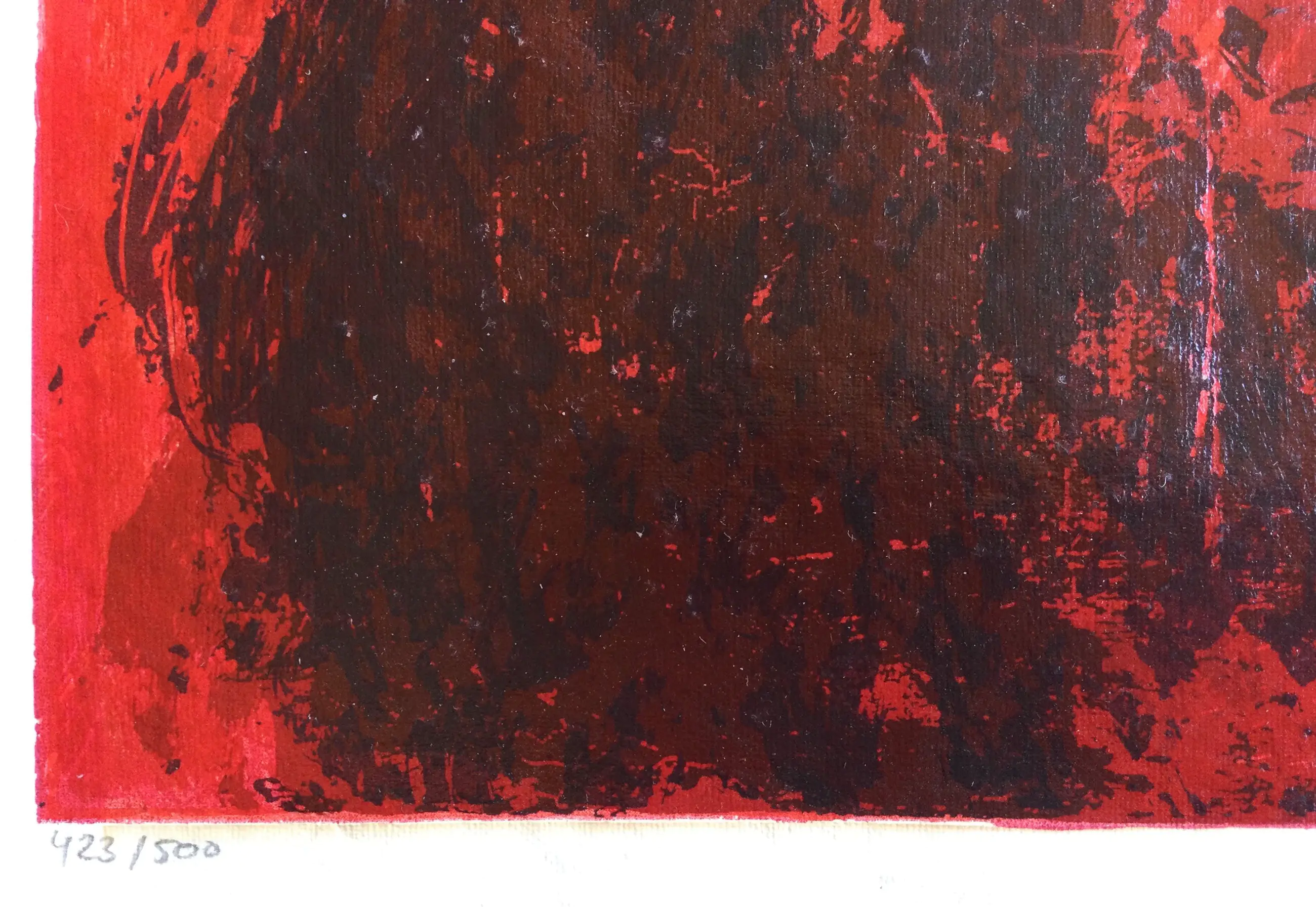 Het typerende van veel van haar zeefdrukken is dat ze de uitstraling van een schilderij hebben. Dat geldt ook voor dit item.