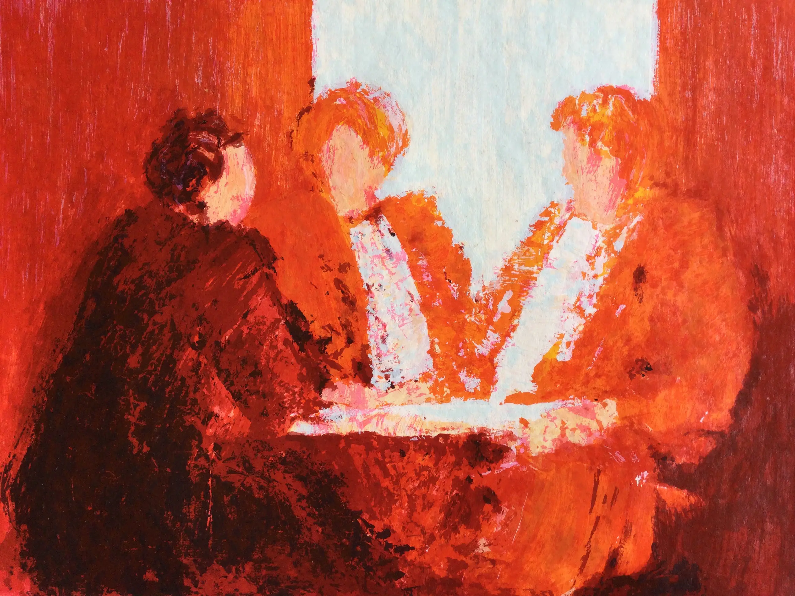 Deze kleuren zeefdruk draagt de titel 'At the coffeetable'.