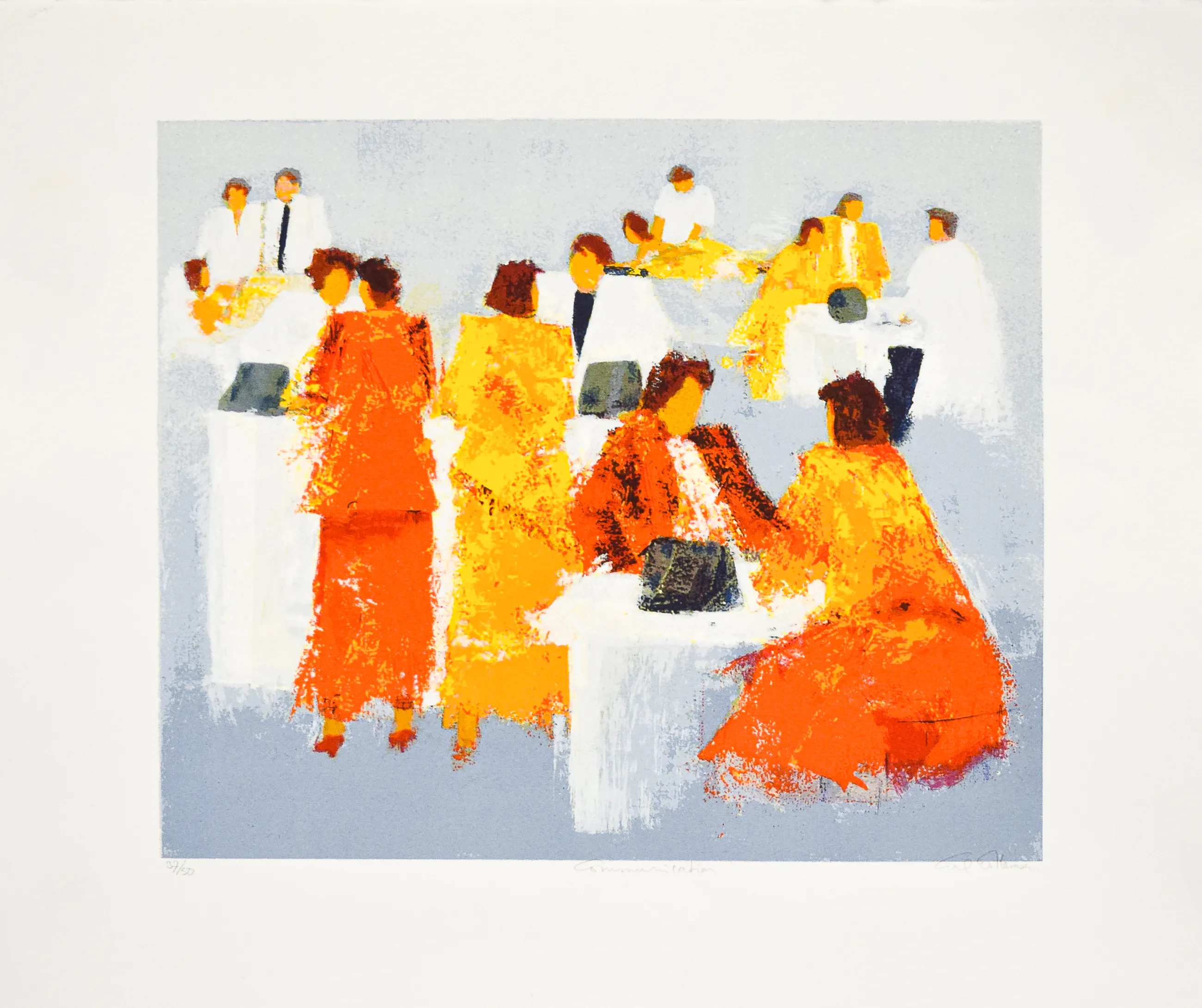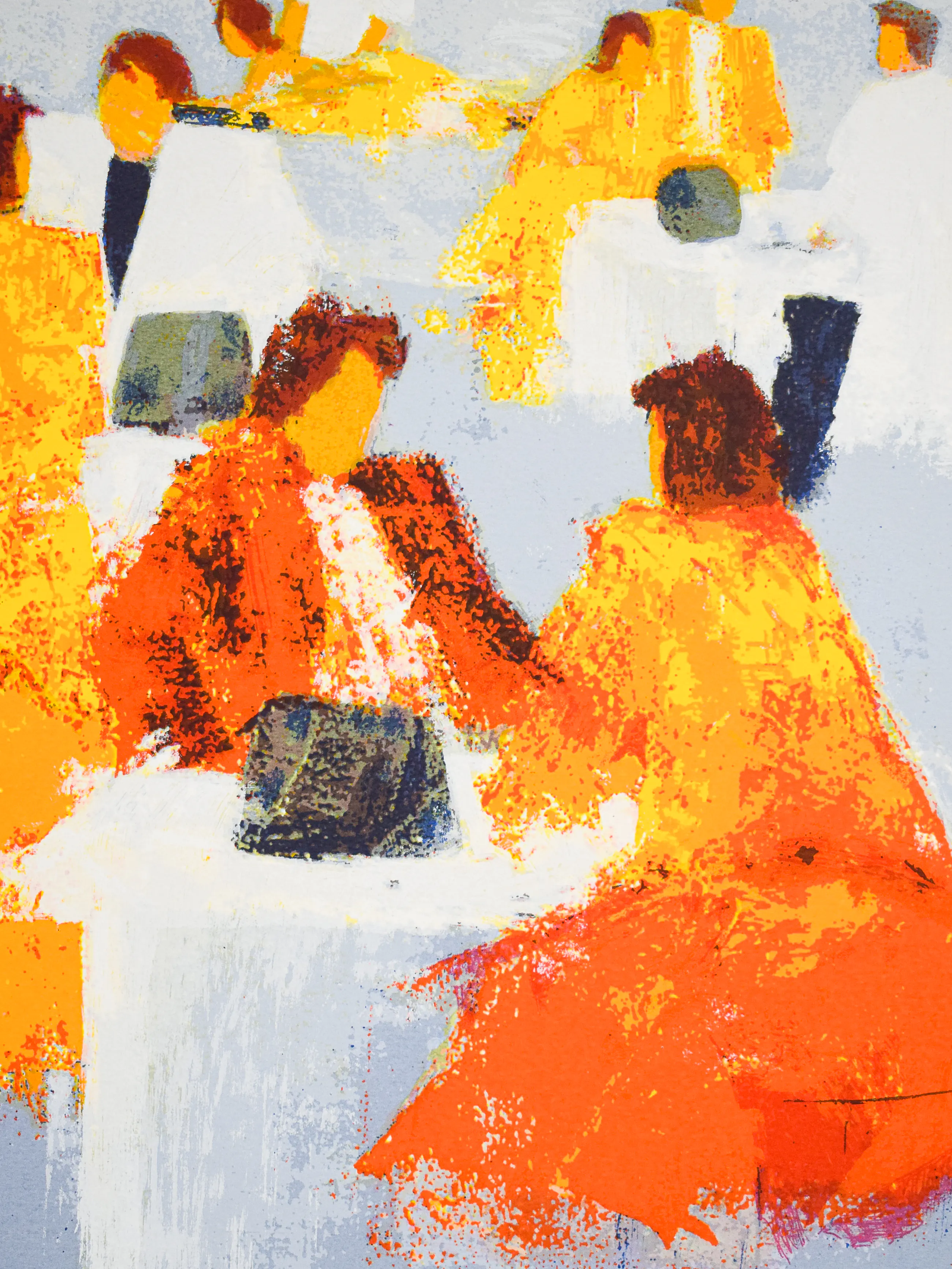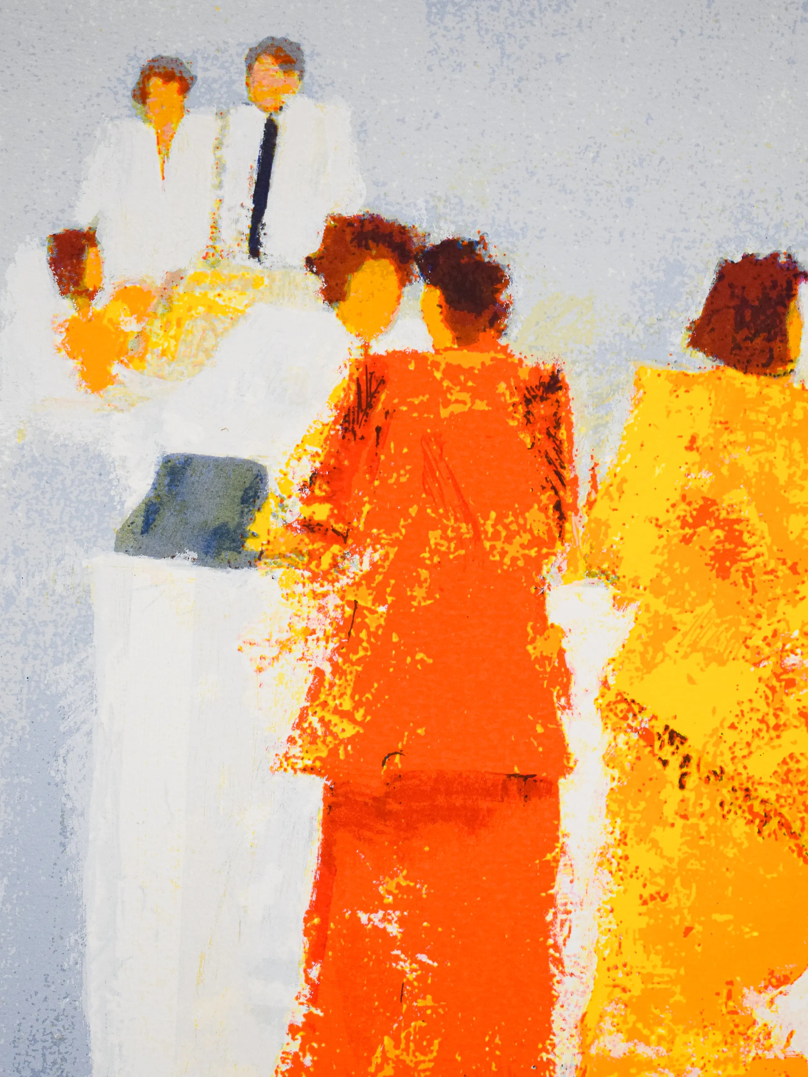"Wil Willemsen (1943) is gefascineerd door mensen. Mensen op straat, op hun werk en tijdens het sporten. Ook in dit werk heeft Willemsen de samenkomst tussen personen centraal gezet, wat gezien de huidige tijd direct een diepere lading met zich meebrengt. Dit alles maakt dit imposante kleurrijke originele werk tot een waar spektakel stuk voor elke woonkamer.