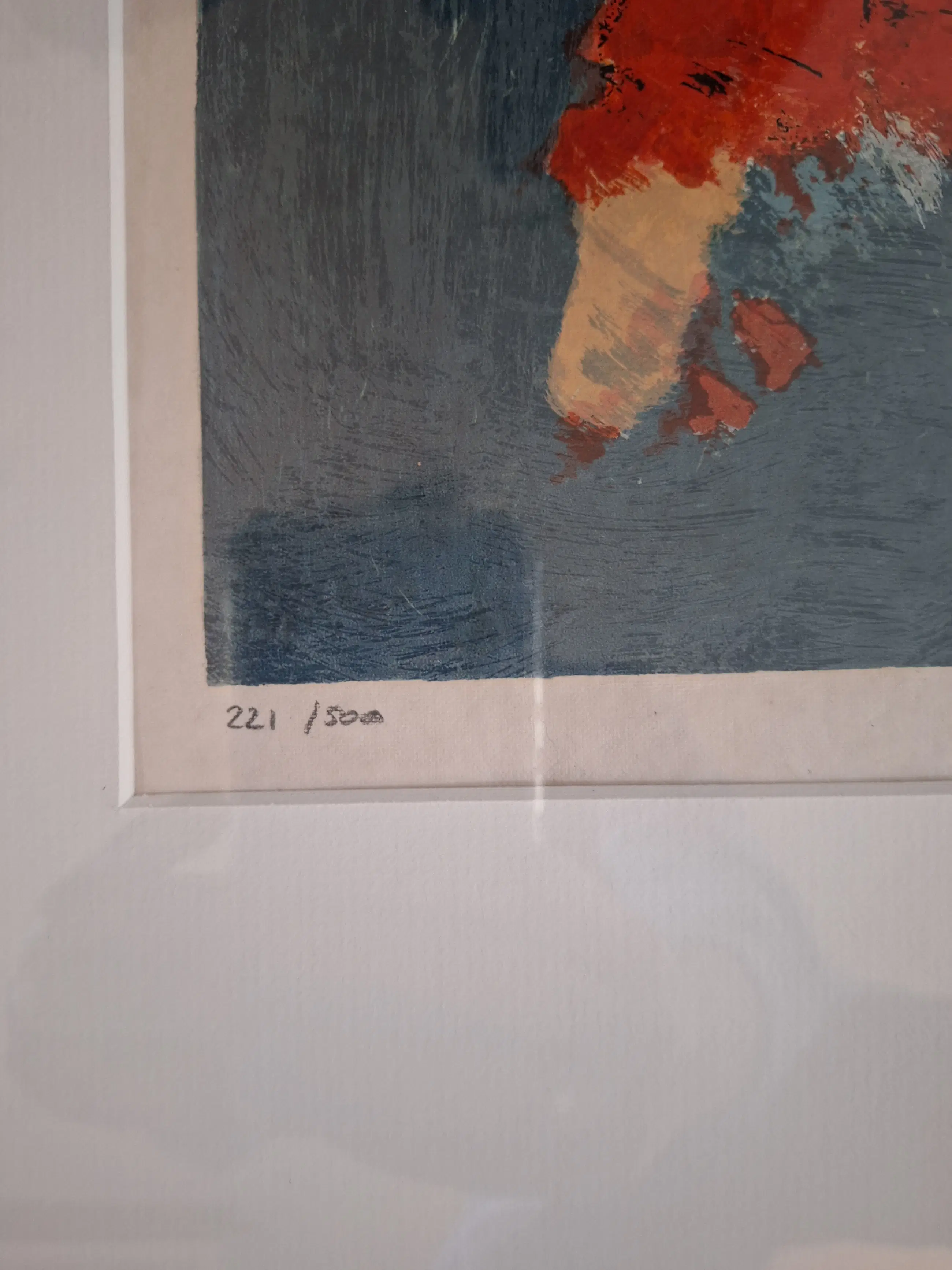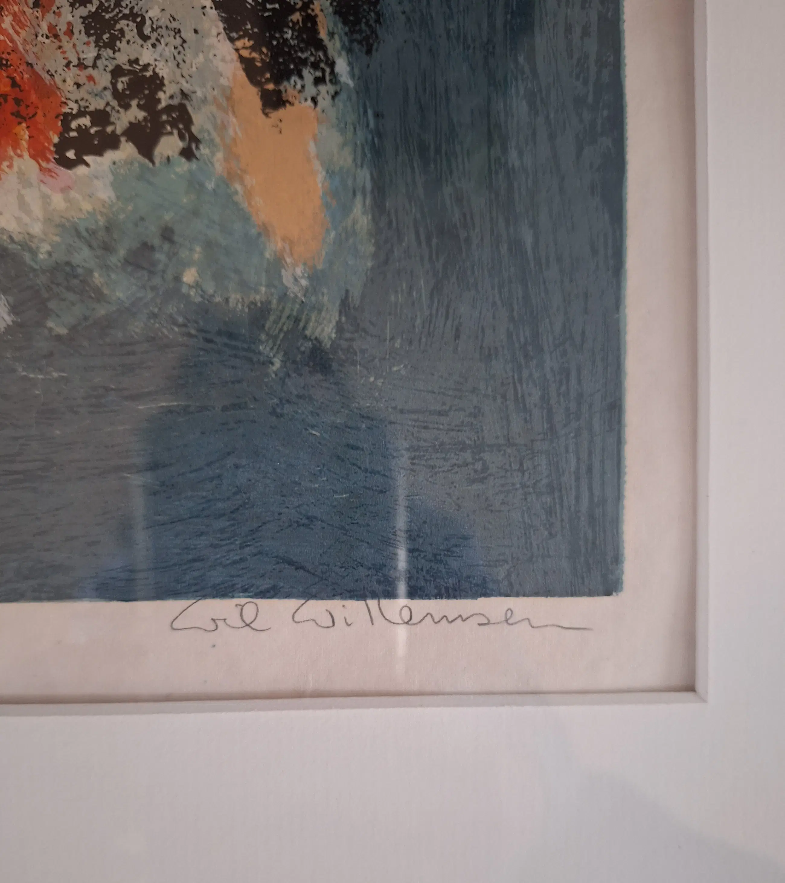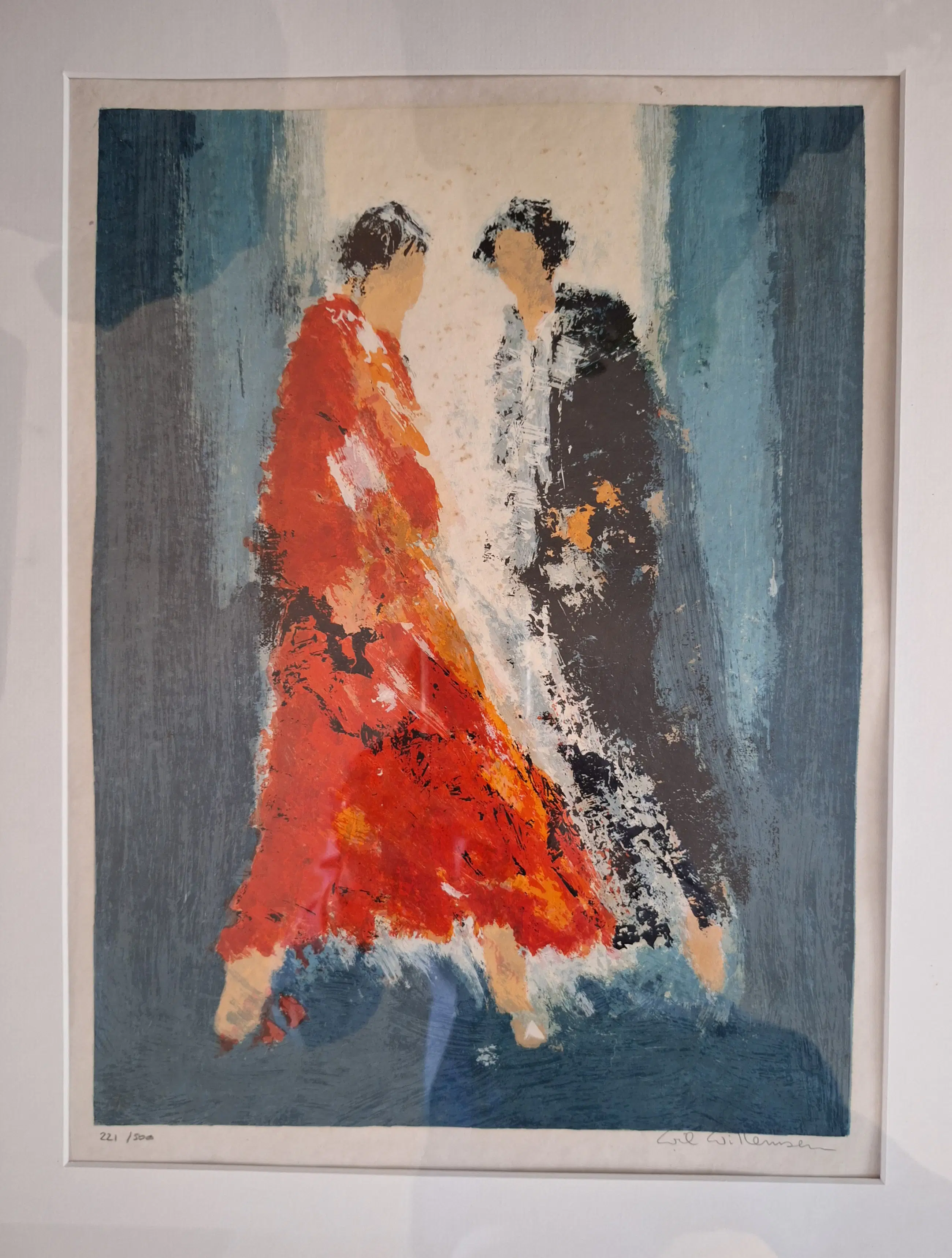 Prachtige ingelijste zeefdruk van kunstenaar Wil Willemsen. Titel van het kunstwerk; Red Dress Het betreft een mooie scène van 2 vrouwen. 43 x 32 cm