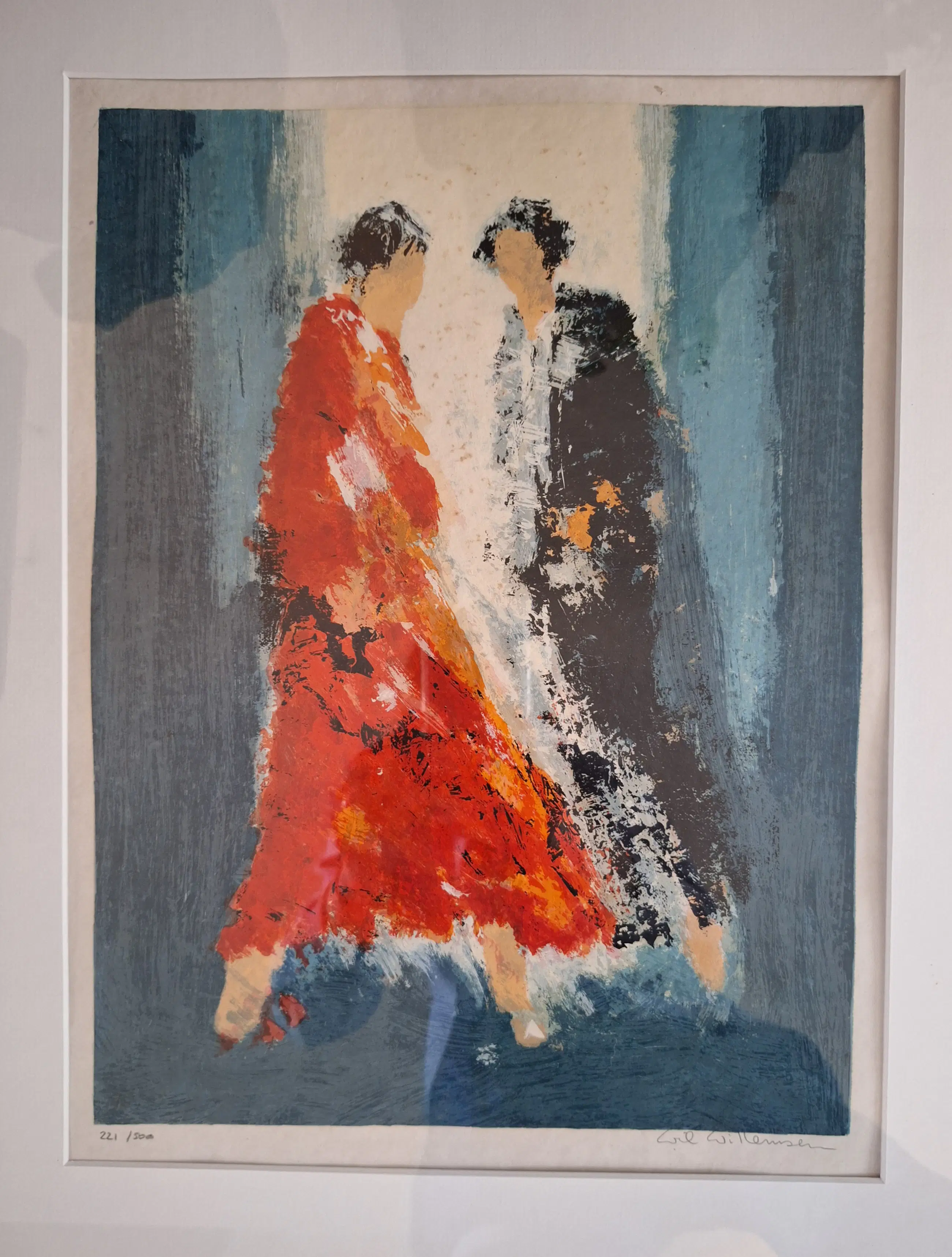 Prachtige ingelijste zeefdruk van kunstenaar Wil Willemsen. Titel van het kunstwerk; Red Dress Het betreft een mooie scène van 2 vrouwen. 66 x 50,5 cm