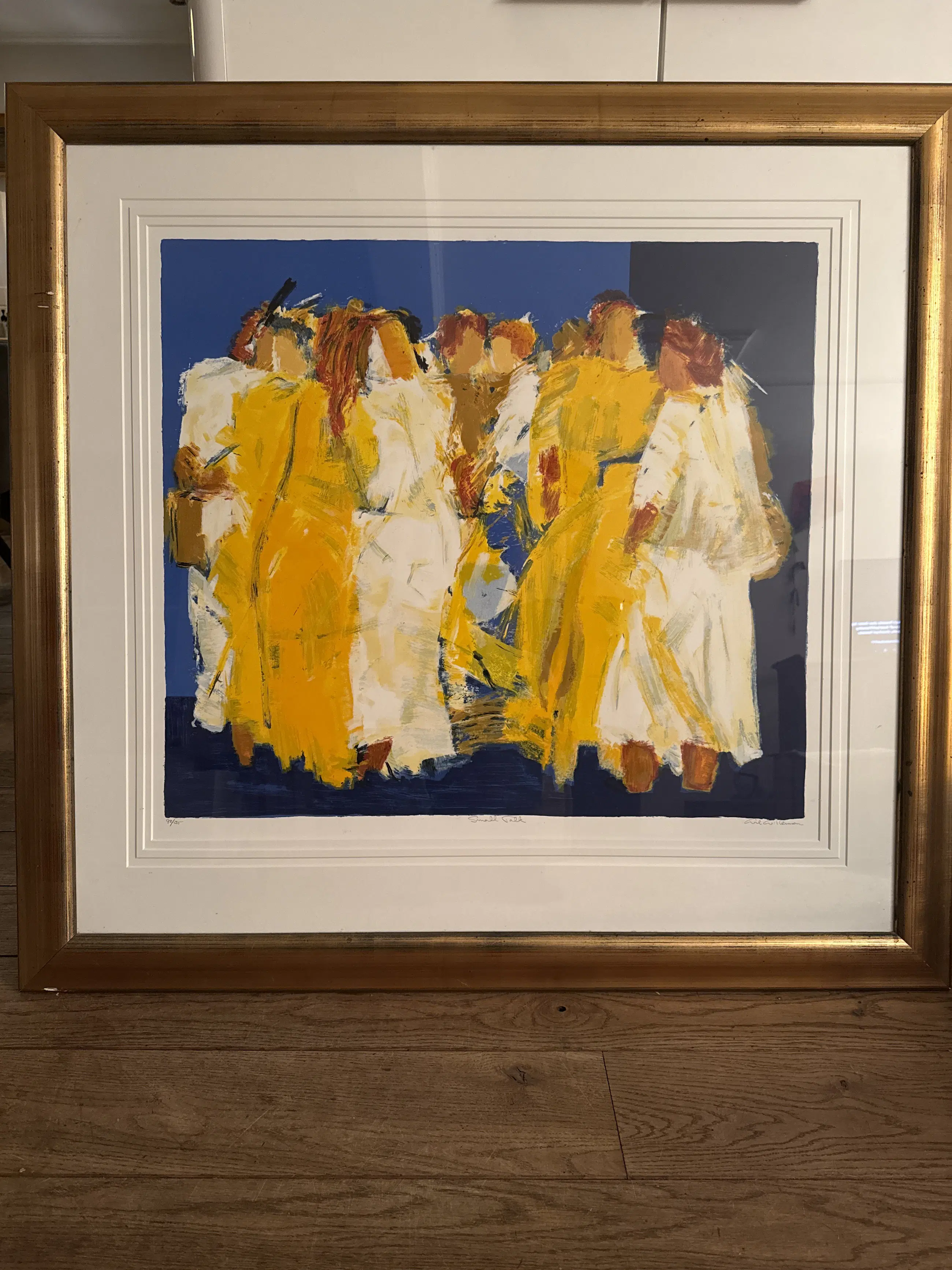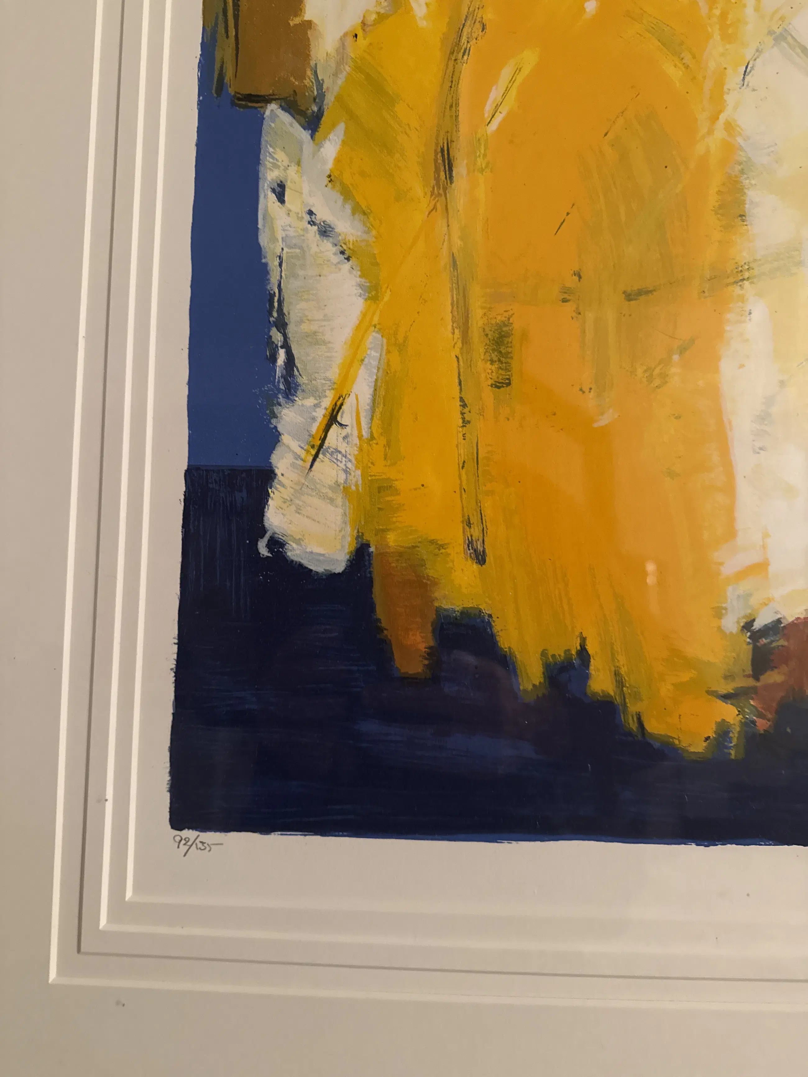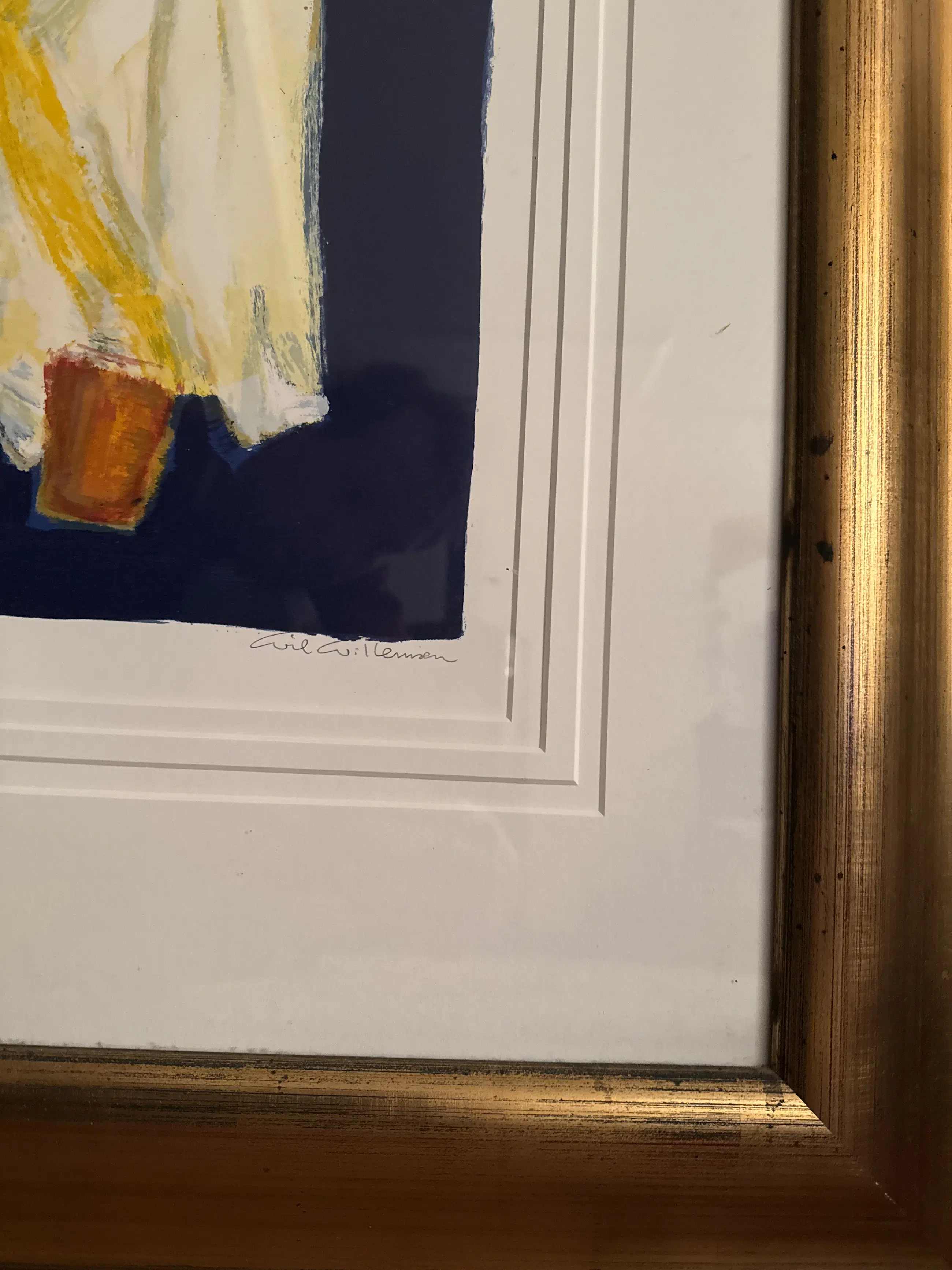 Het betreft een handgesigneerde zeefdruk in een beperkte oplage (nummer 92 van 135). Het werk is professioneel ingelijst in een brede, goudkleurige houten lijst met passe-partout, wat het geheel een luxe en stijlvolle uitstraling geeft. De conditie is zeer goed, met slechts lichte gebruikssporen aan de lijst.