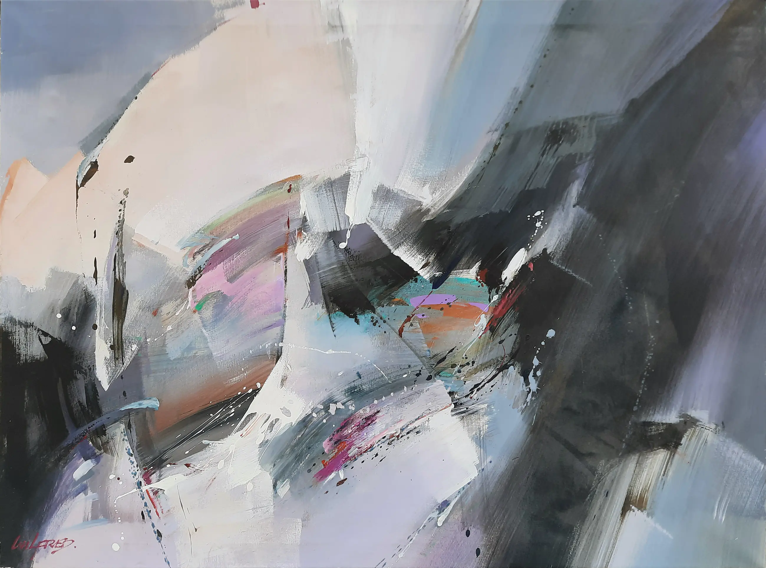 Abstract kunstwerk van Wilfred Lang. Acryl op doek. Beetje verfverlies aan de randen.