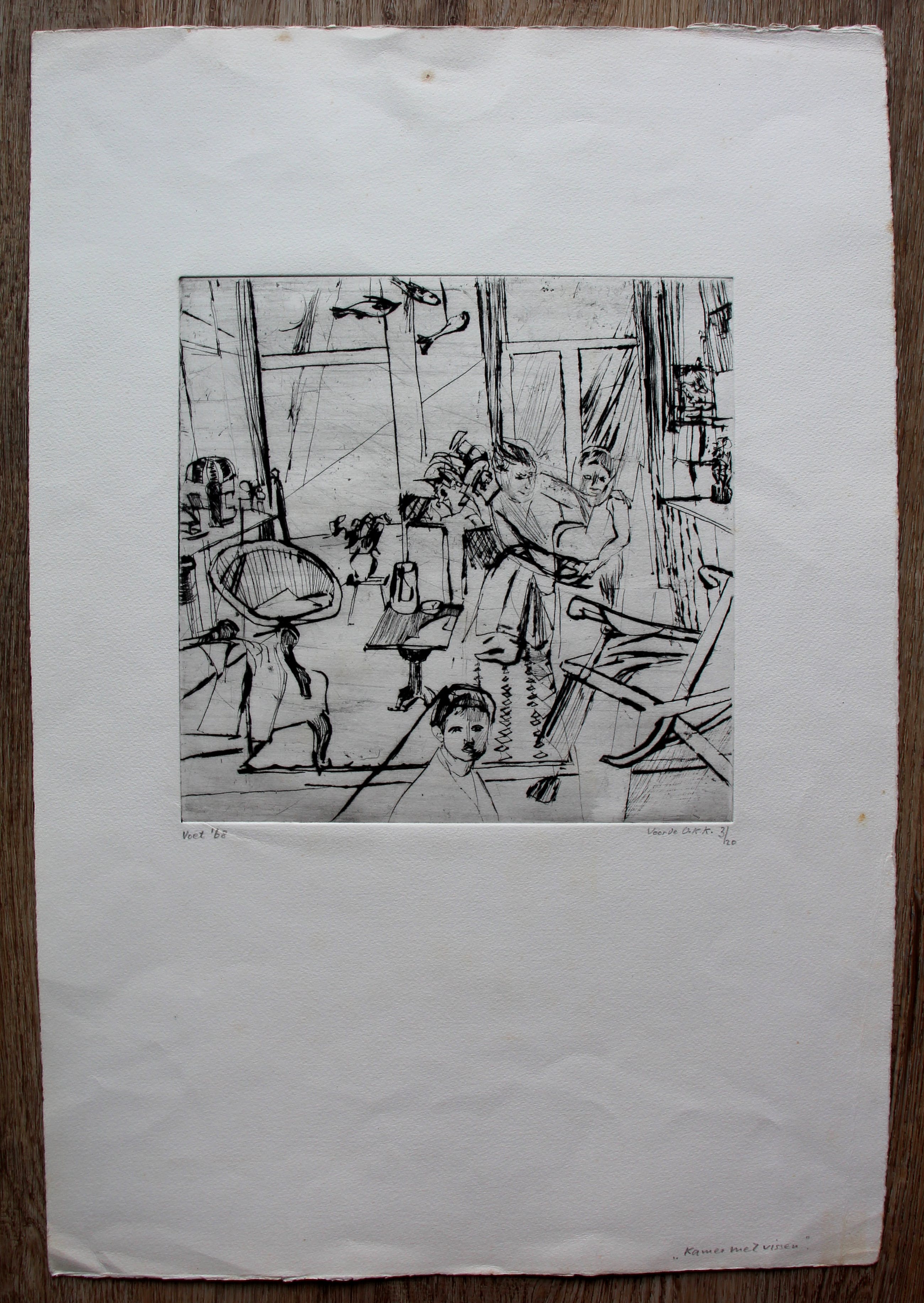 Ets van Wilfred Voet. Titel: "kamer met vissen". Jaar: 1968. Oplage: Voor de O.K.K, 3/20. Afmetingen blad: H56 x b38cm. Afmetingen voorstelling ca: H24.5 x b24.5cm. Het werk is links onderaan, met potlood, gesigneerd door de kunstenaar. De authenticiteit van het aangeboden werk wordt volledig gegarandeerd. Een certificaat van echtheid kan, op aanvraag, worden gemaild.