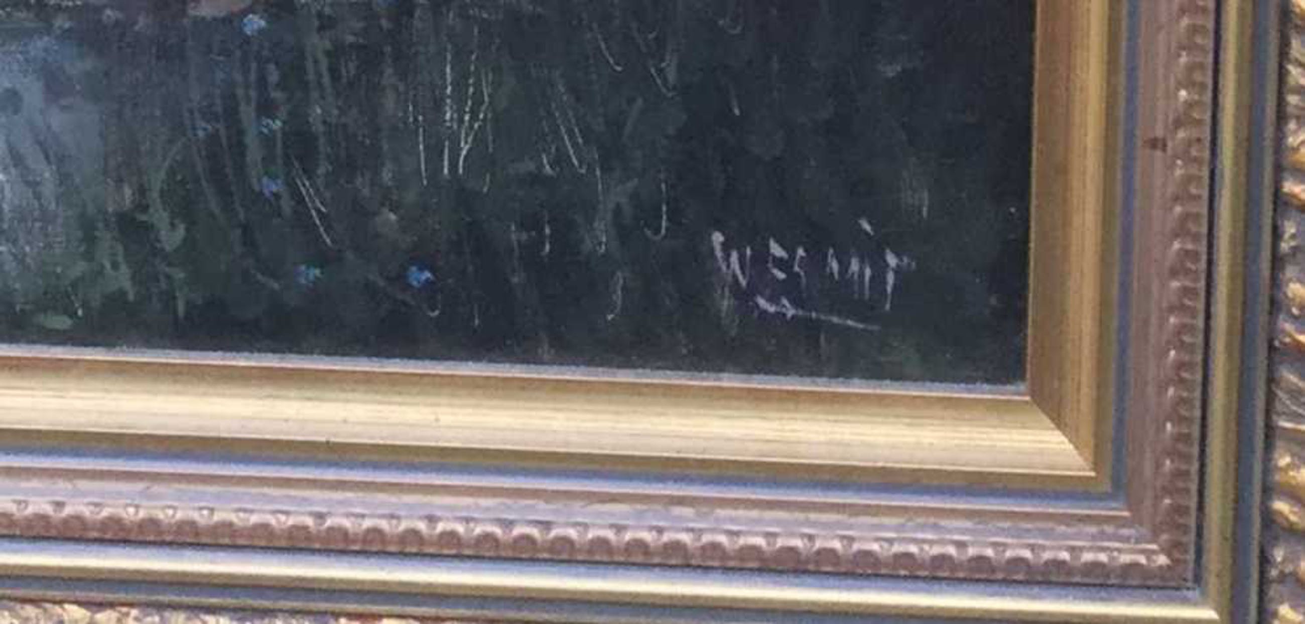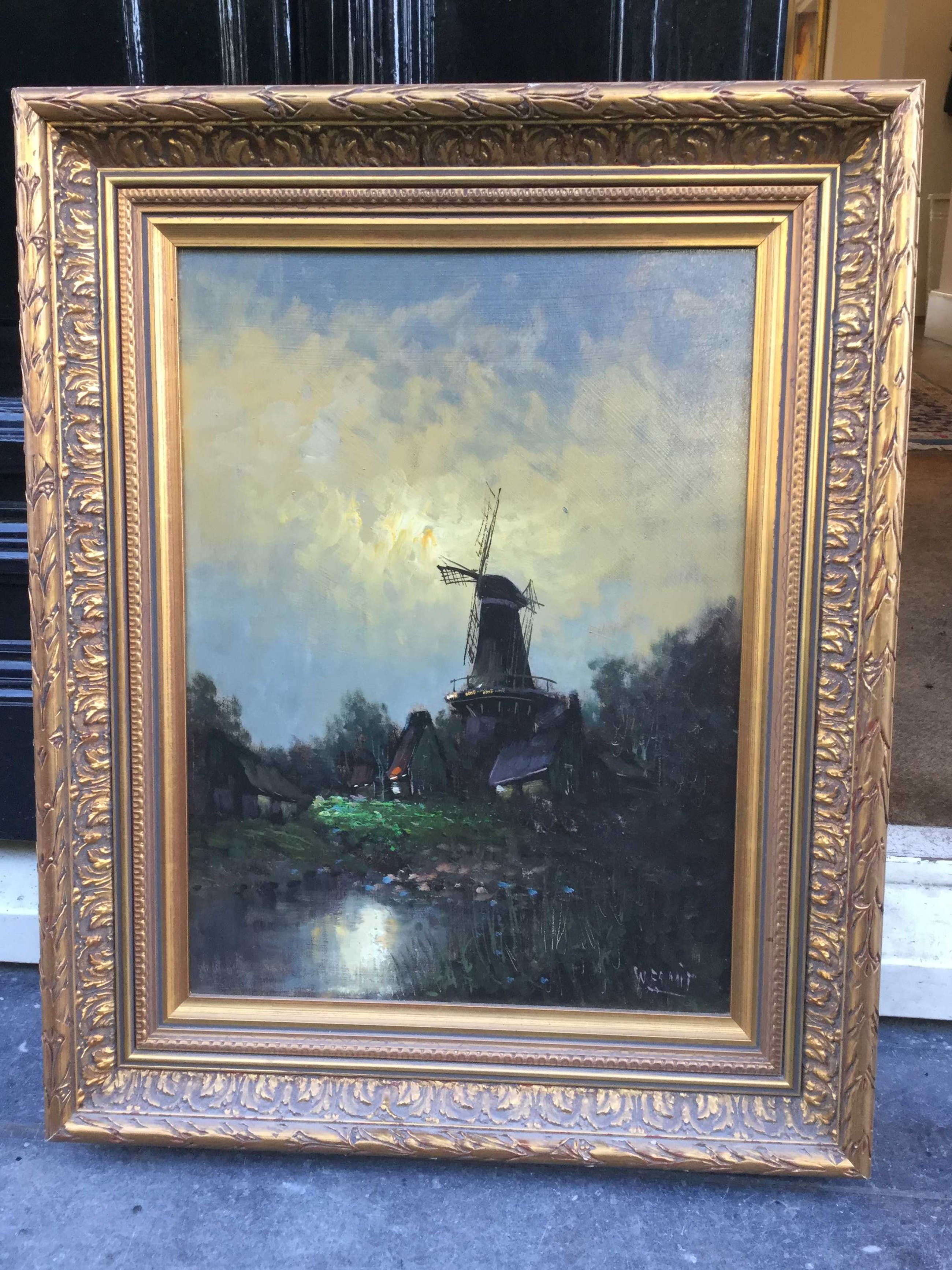 C2505 Kunstenaar: W.F. Smit Voorstelling: Dorpsgezicht met molen (mogelijk omgeving Den Haag) Techniek: Olieverf op paneel Rechtsonder gesigneerd