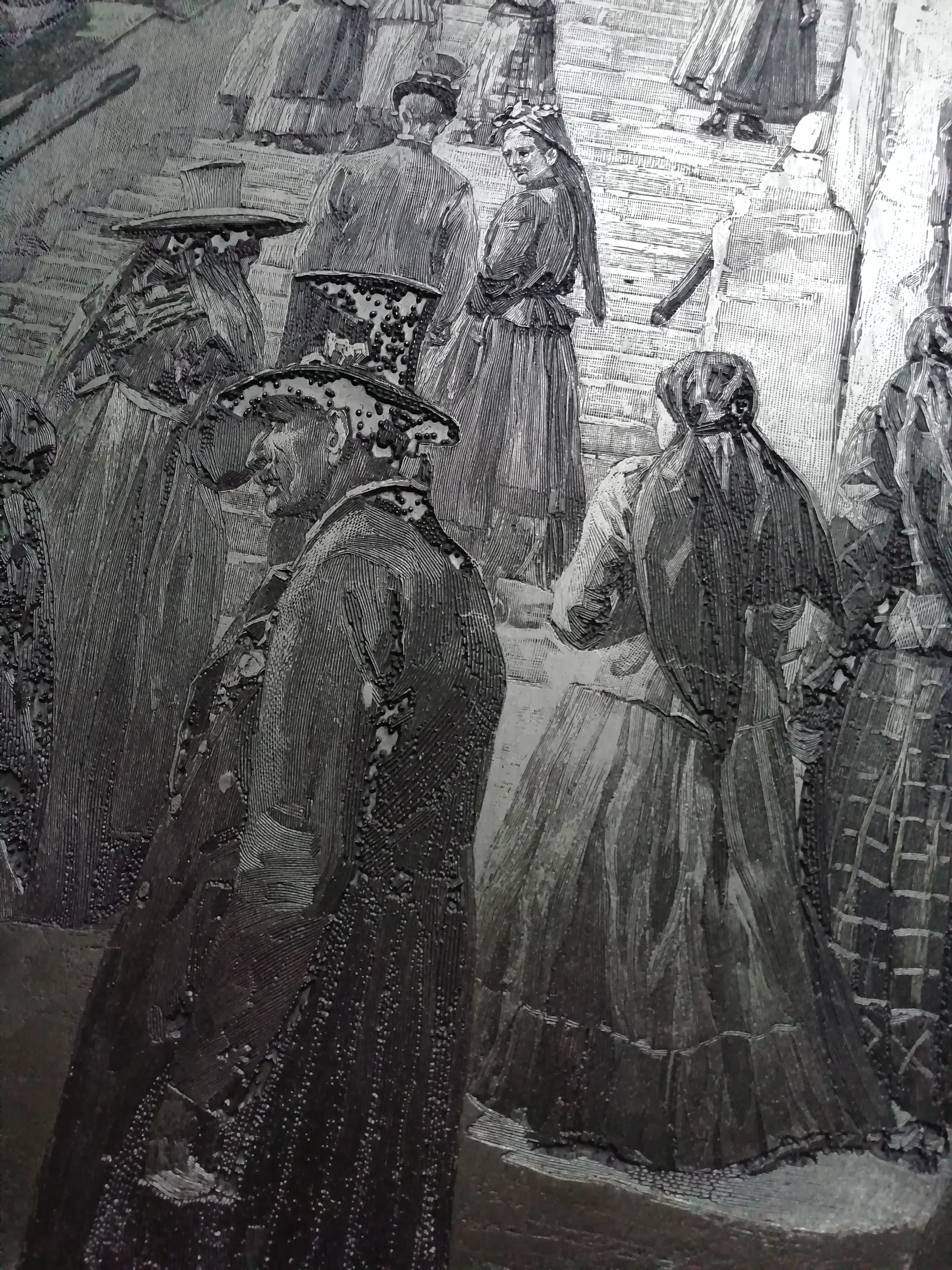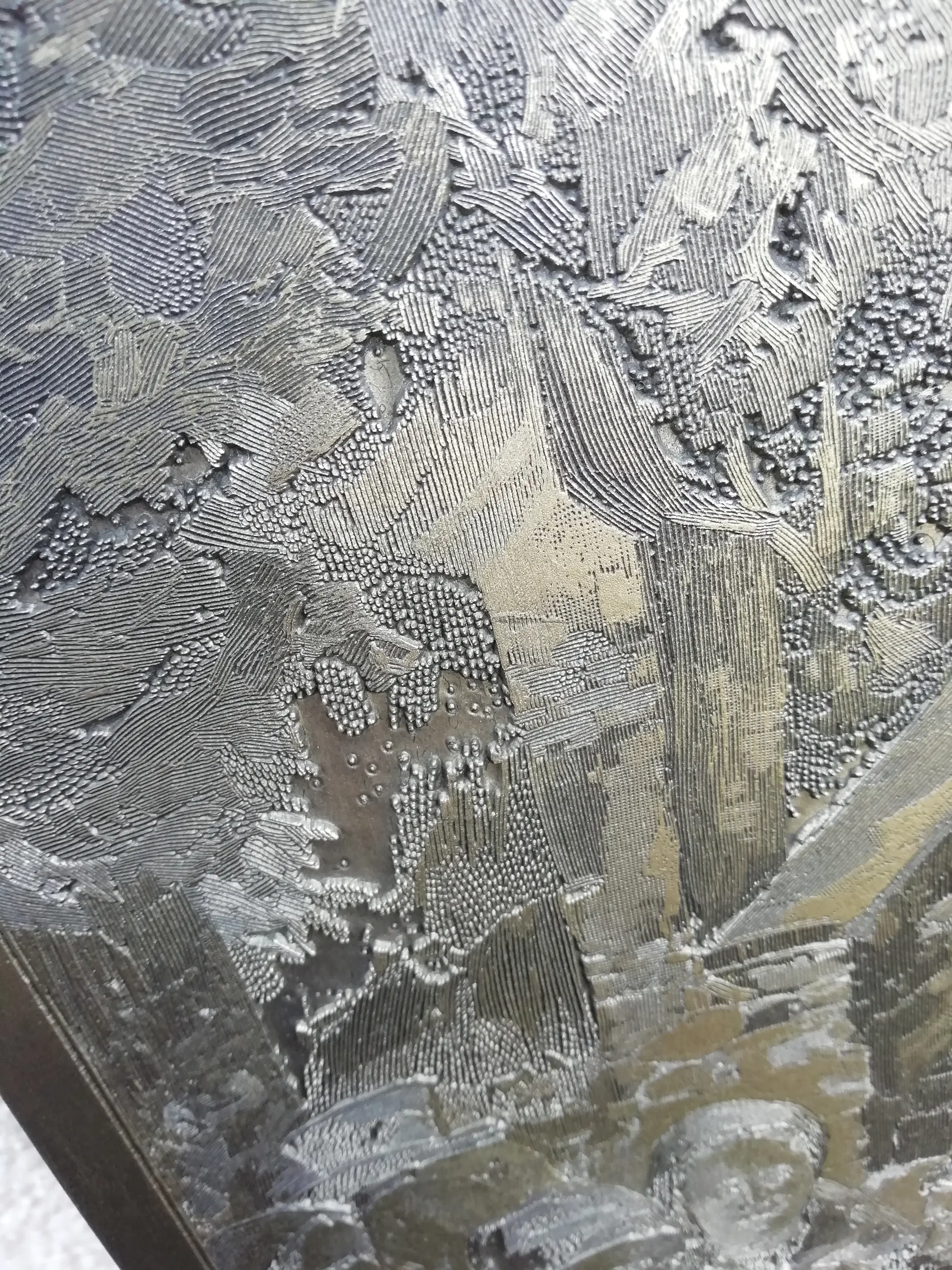 Ik kan er niet veel over zeggen; bekijk de foto's. Het is gemaakt van metaal, zwaar, en je kunt een ander materiaal aan de achterkant zien. Er zitten haken aan de achterkant om het op te hangen. Het is geen drukplaat!