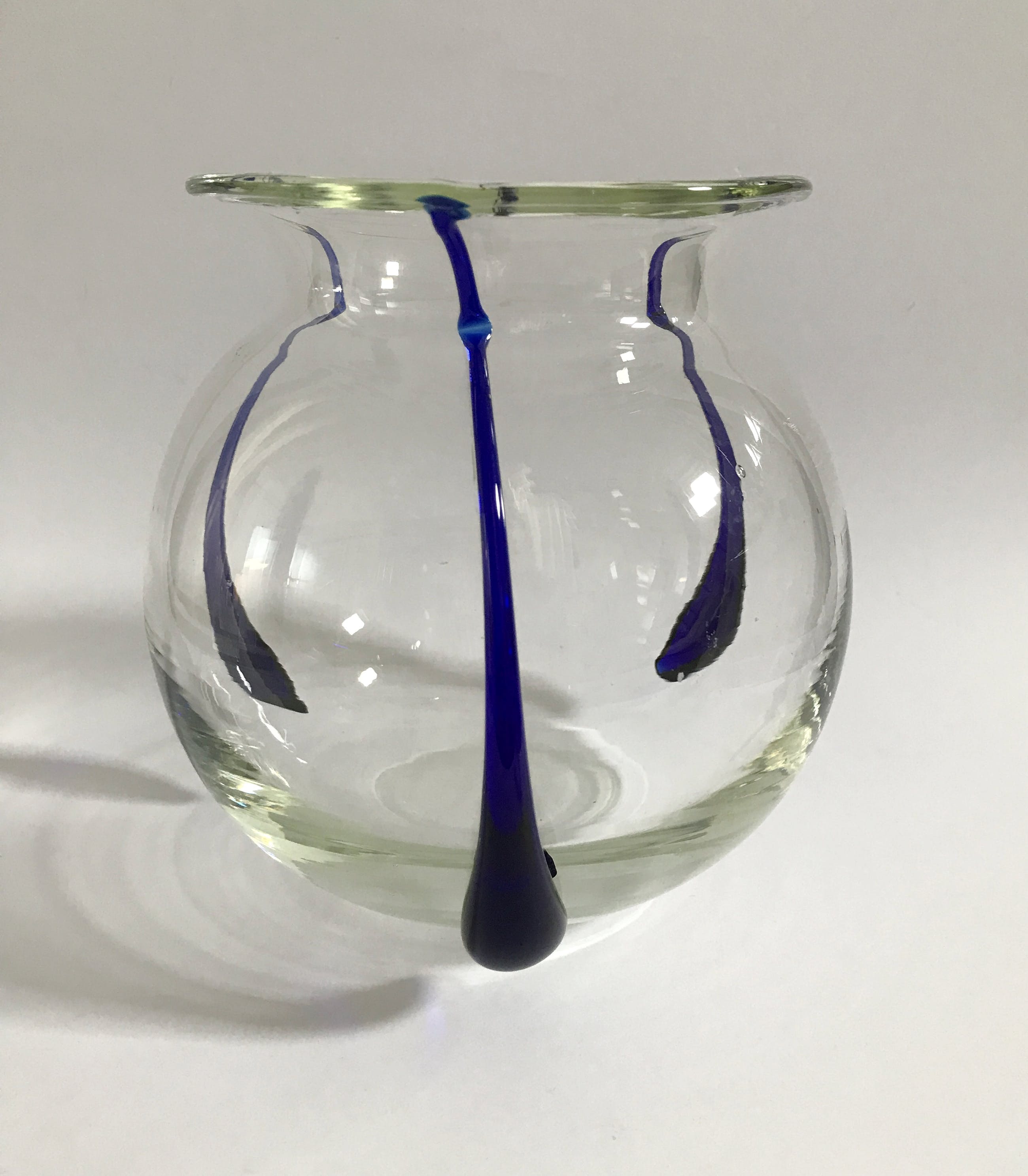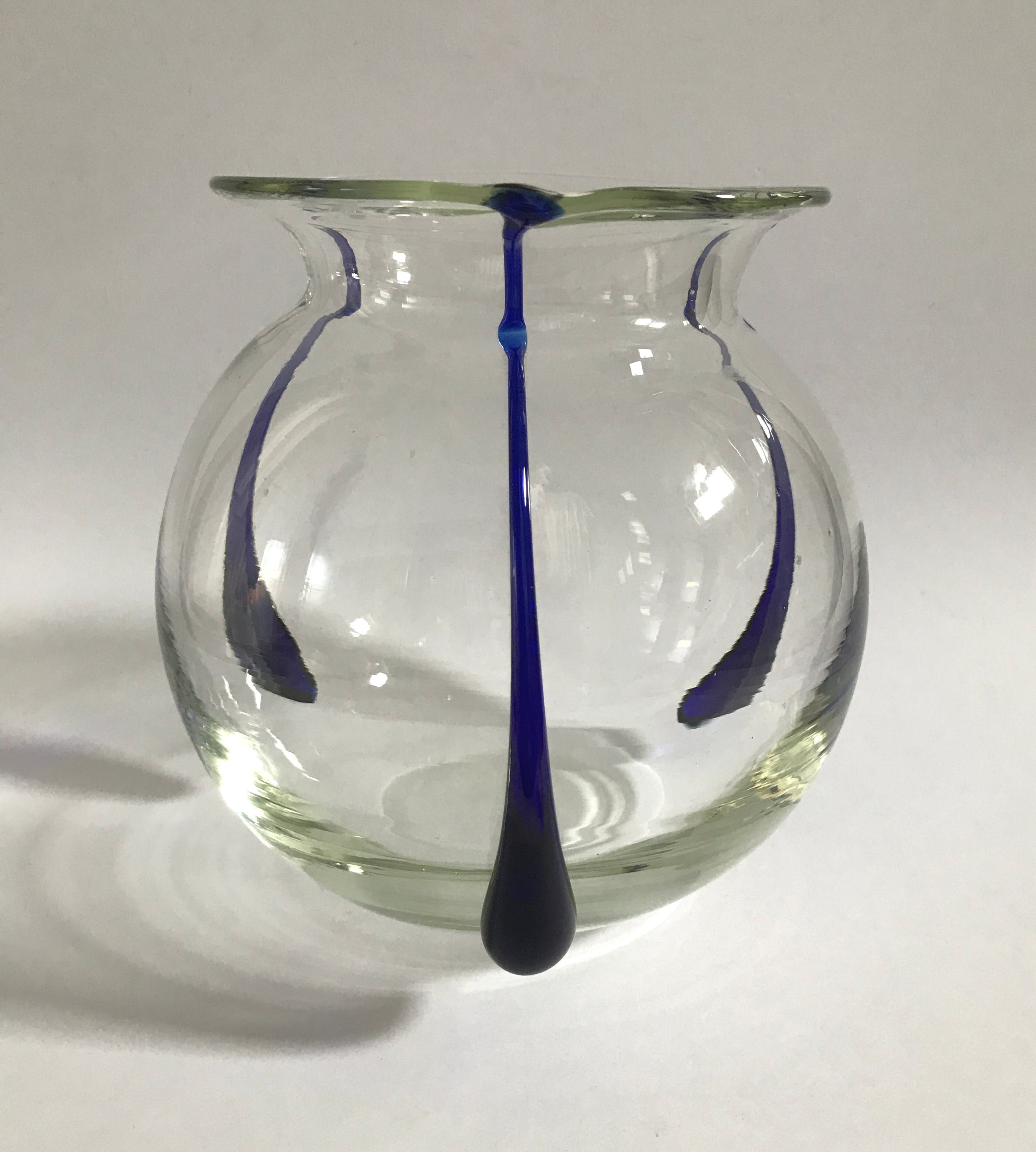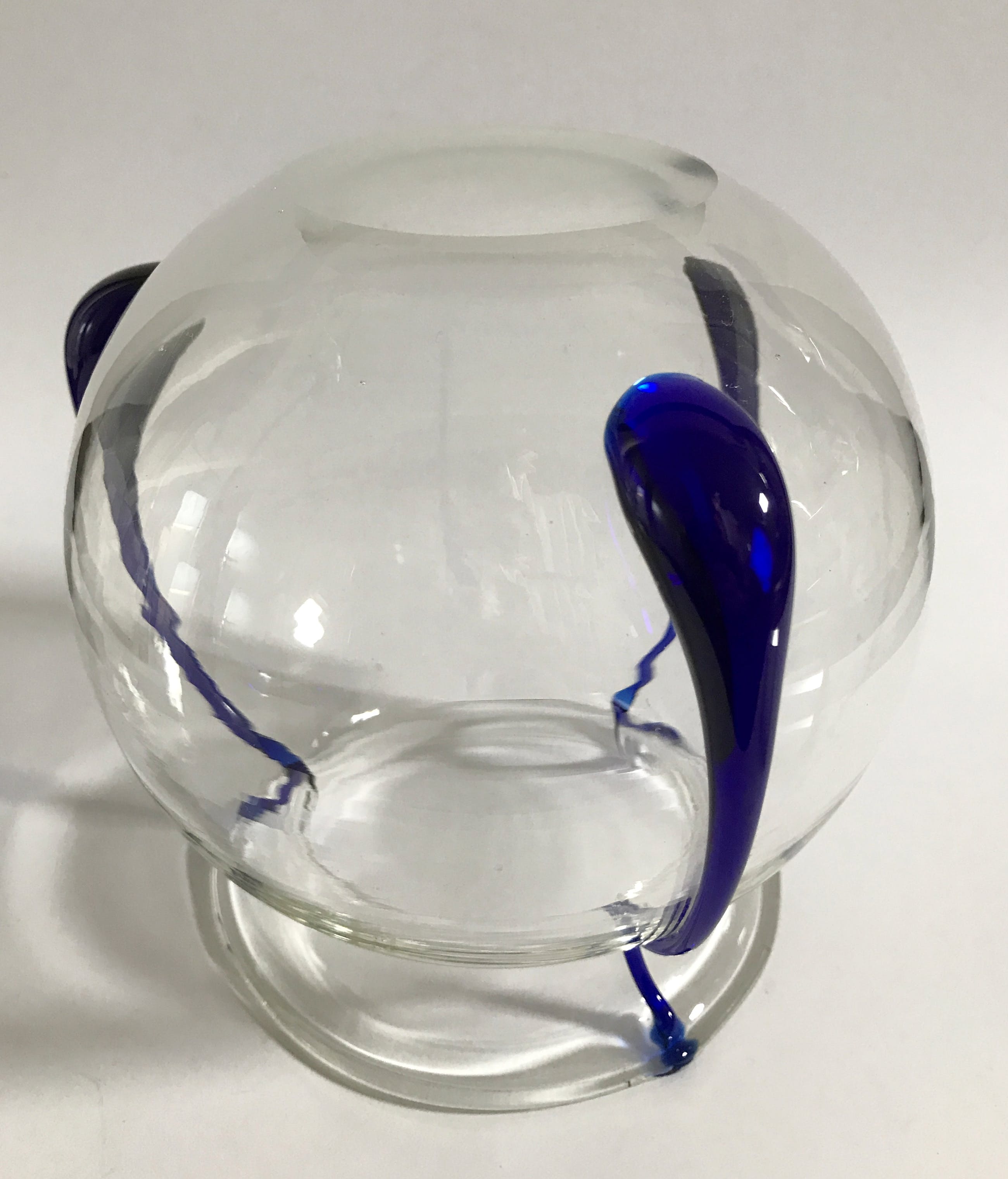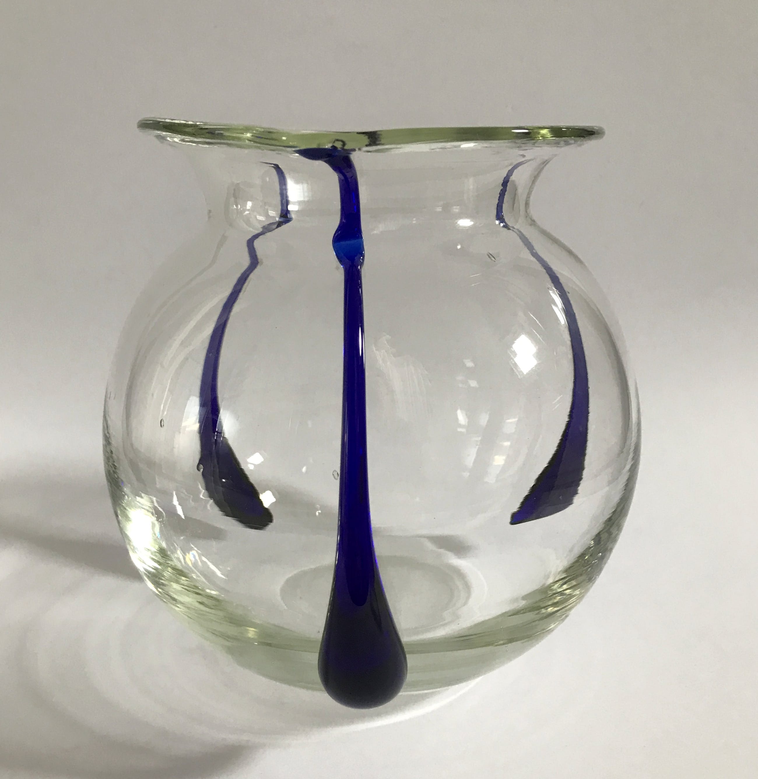 Bolvaas in Art Nouveau stijl, met brede halskraag, van Loetz Kralik. Mondgeblazen, in helder kristal met koningsblauwe druppels (kikkervisjes). Hoogte 17 cm, diameter 17 cm. Er zijn een paar belletjes. Gezien de leeftijd in goed conditie. Gewicht 830 gram. De foto's zijn onderdeel van de beschrijving