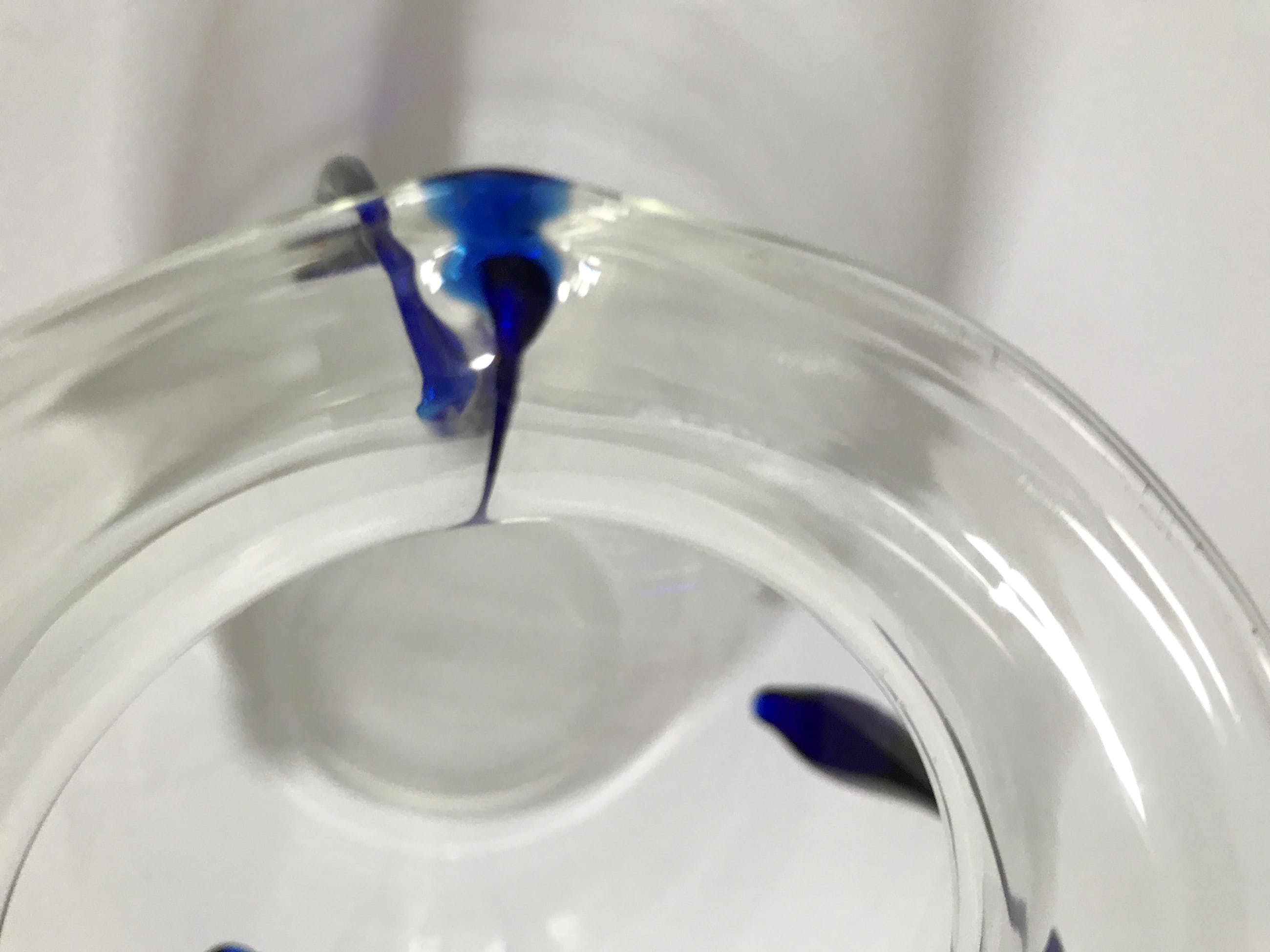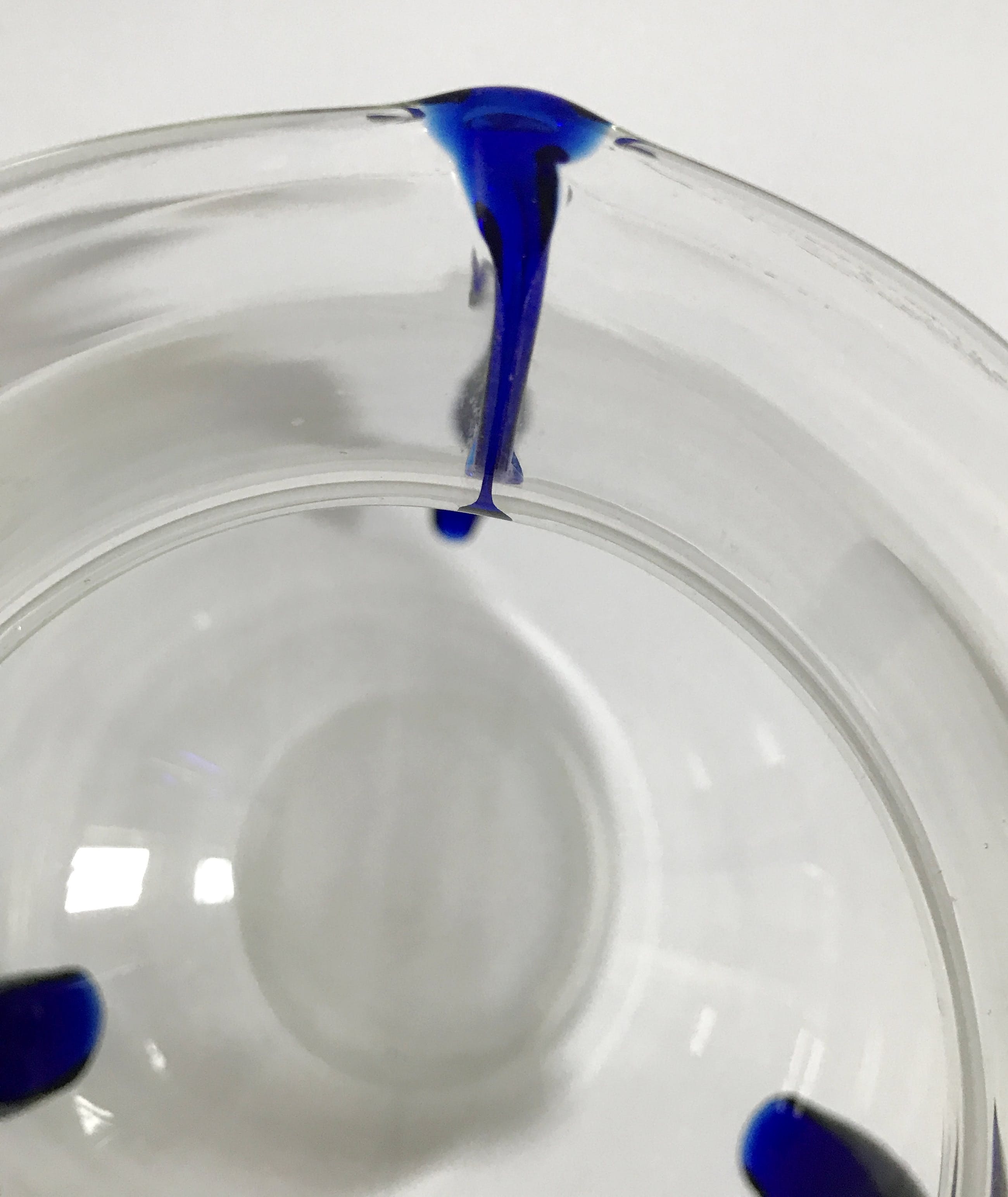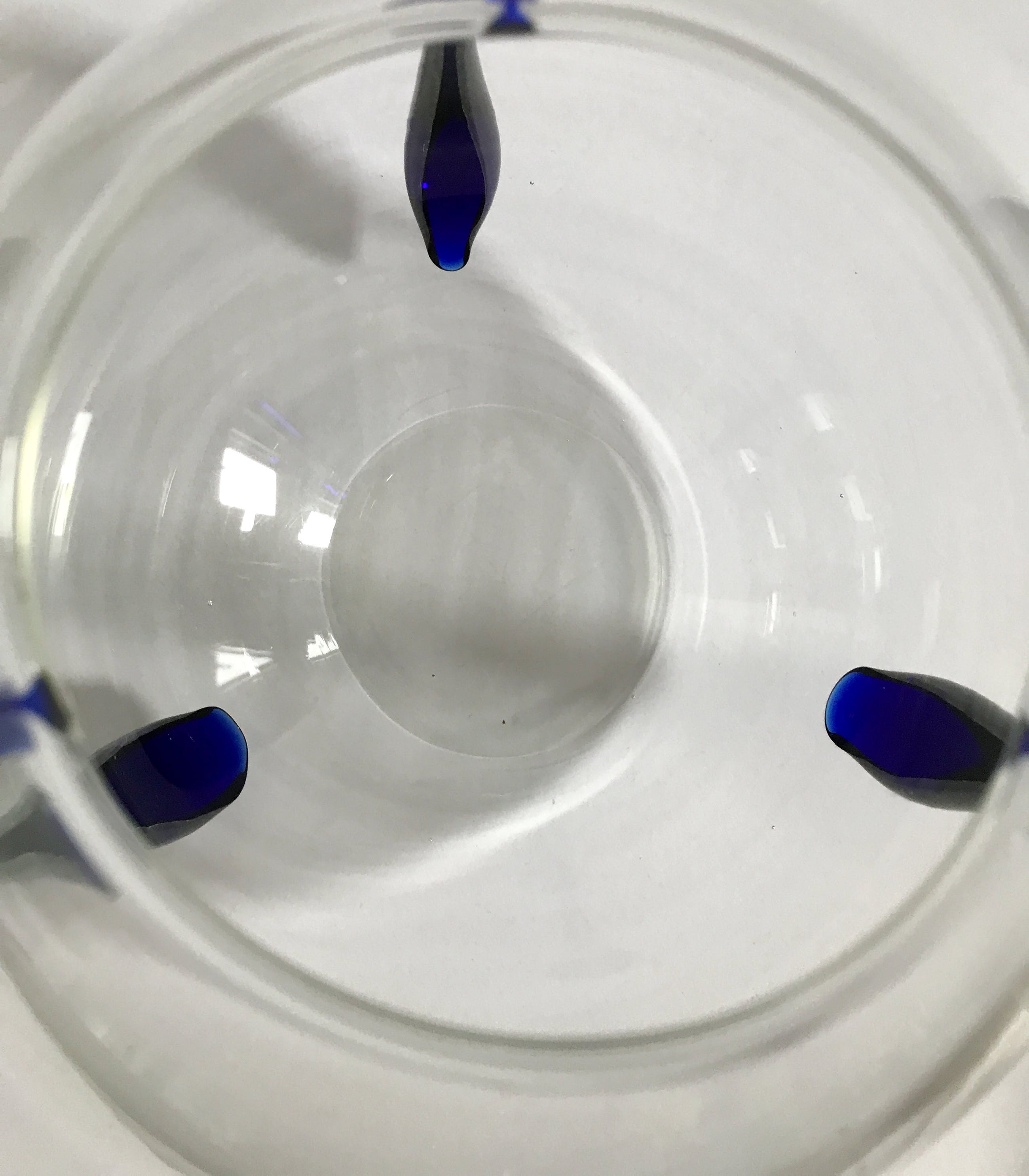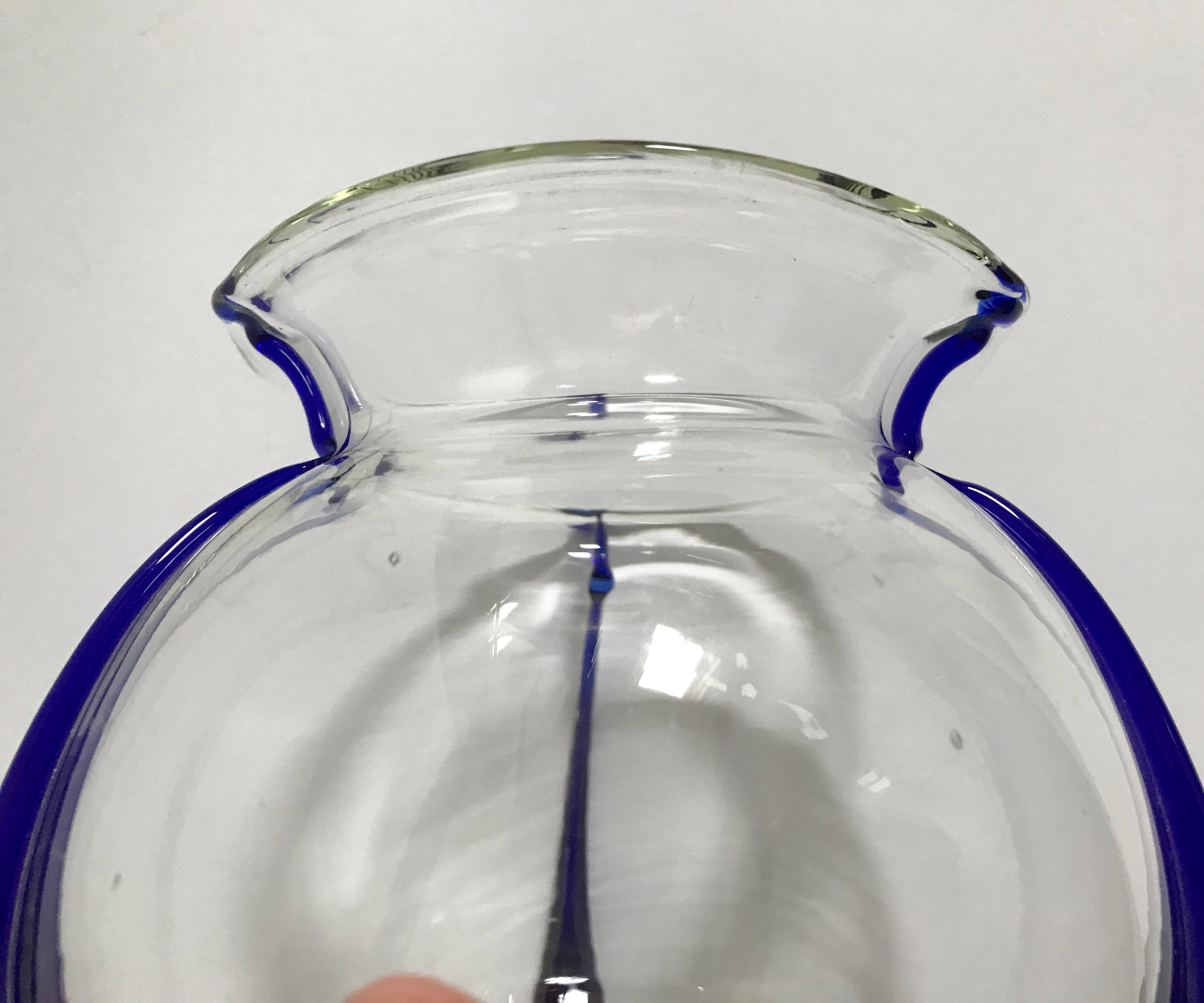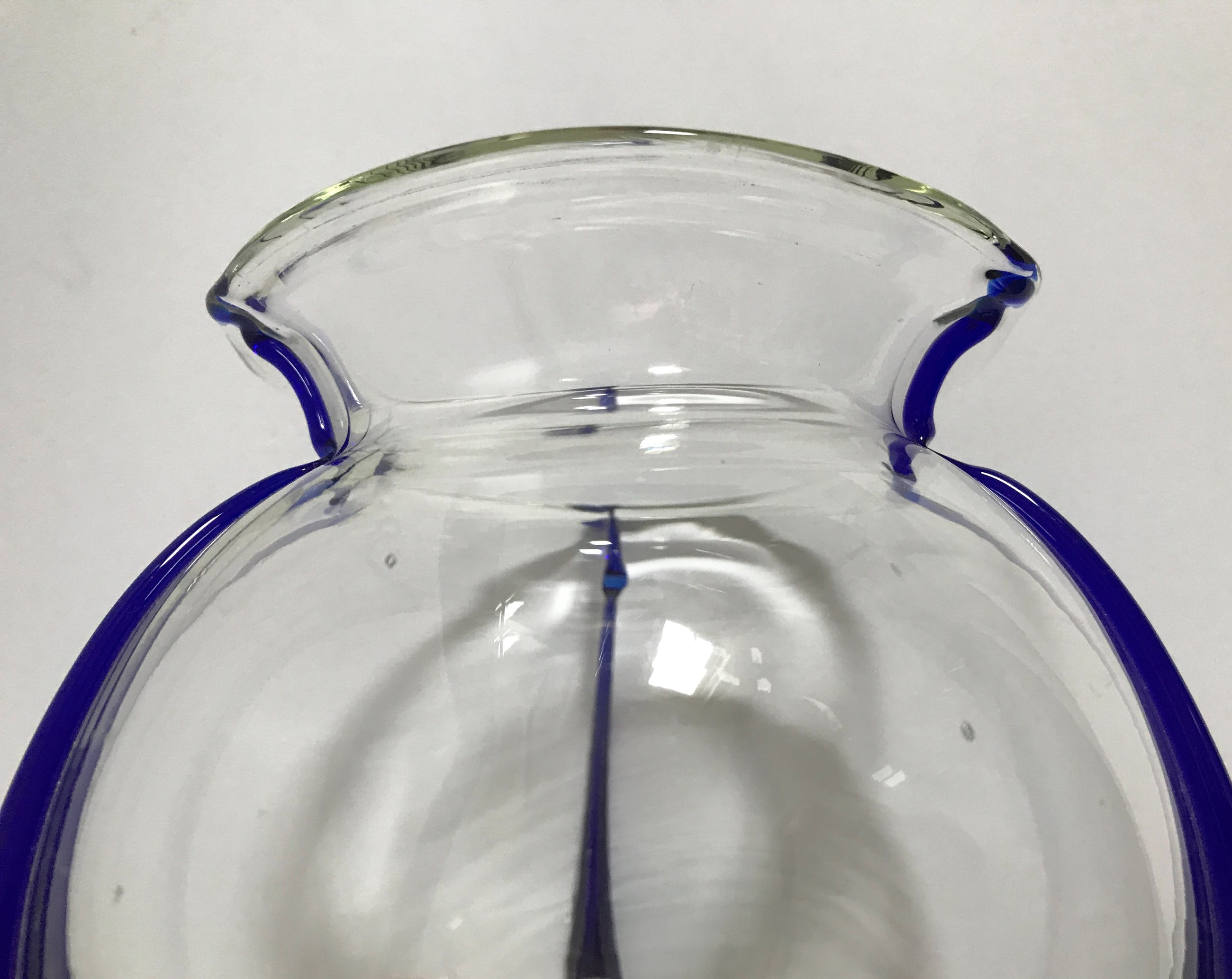 Bolvaas in Art Nouveau stijl, met brede halskraag, van Loetz Kralik. Mondgeblazen, in helder kristal met koningsblauwe druppels (kikkervisjes). Hoogte 17 cm, diameter 17 cm. Er zijn een paar belletjes. Gezien de leeftijd in goed conditie. Gewicht 830 gram. De foto's zijn onderdeel van de beschrijving
