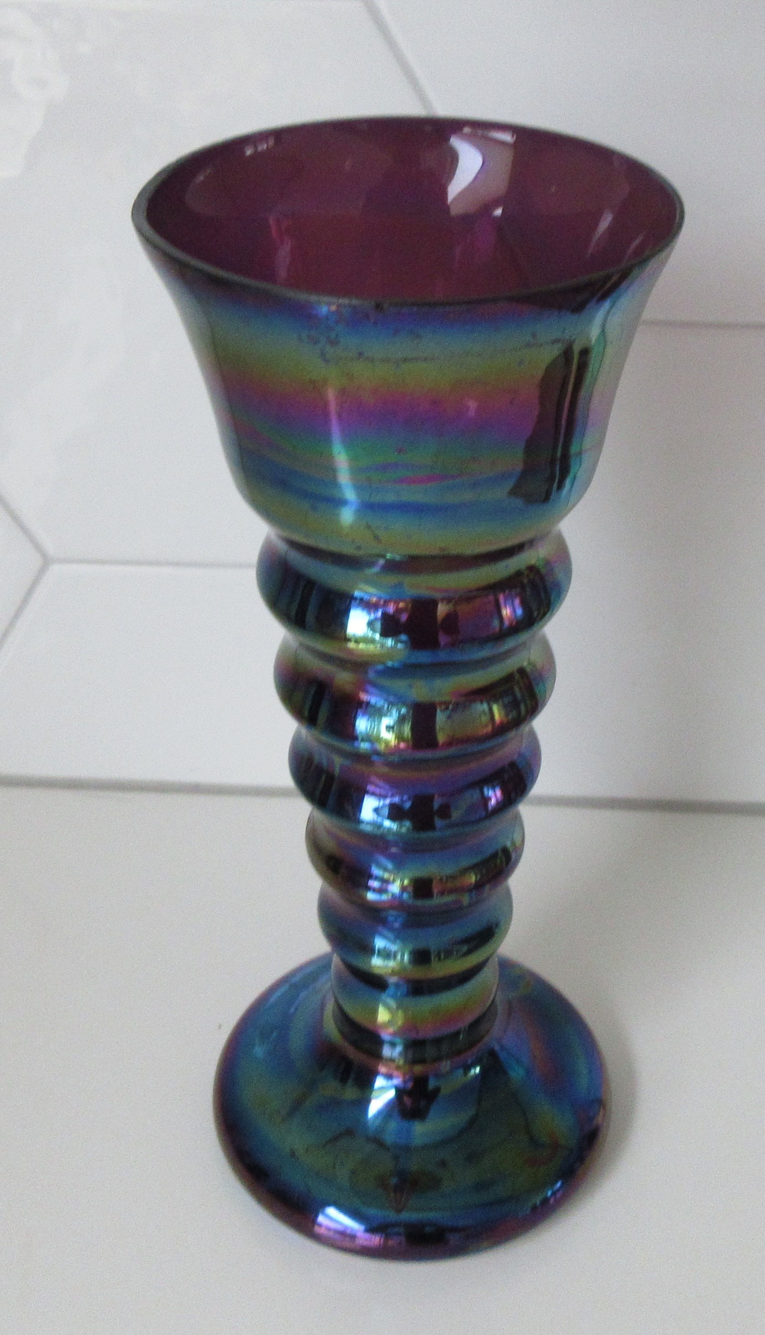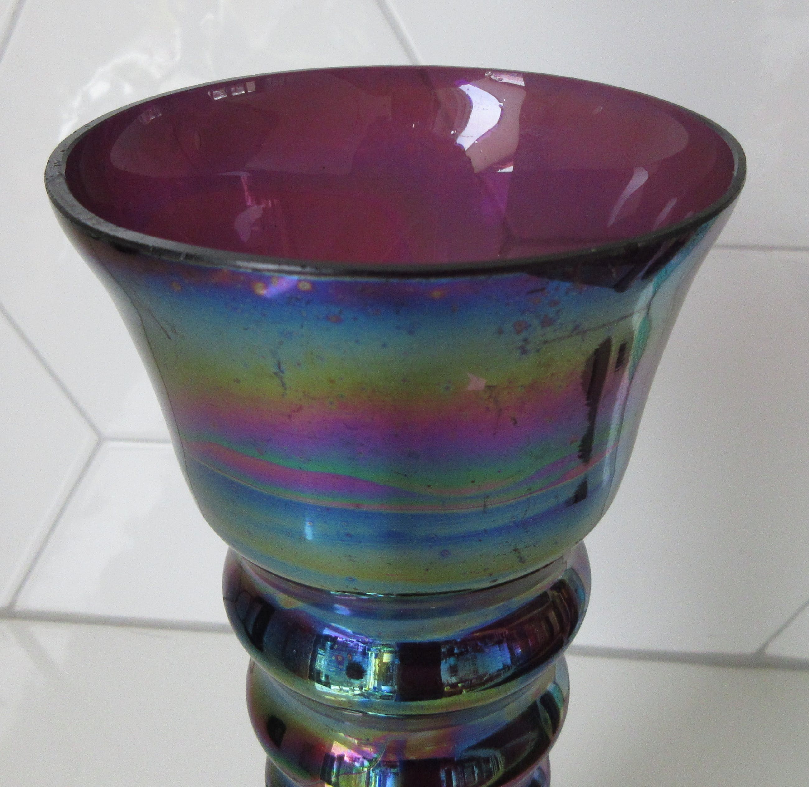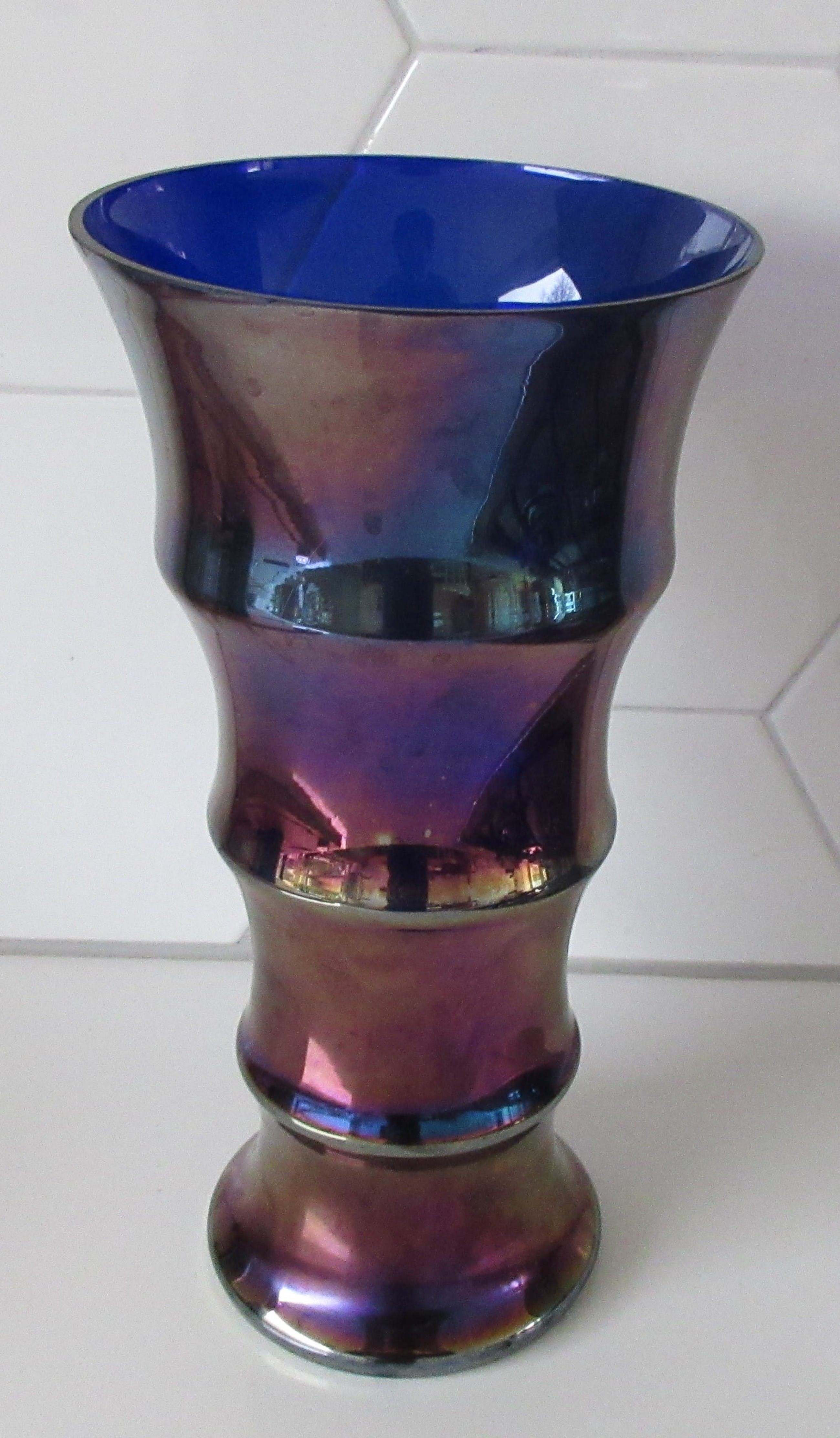 Stel Art Nouveau Iridescent geglazuurde ribbelvazen uitvoering Wilhelm Kralik & Sohne uit de Bohemen. De grote vaas is kobalt blauw en de ander is paars of amethyst kleur. Beiden niet gemerkt. De paarse vaas heeft de volgende afmetingen; 26 cm hoog en 10 cm diameter.