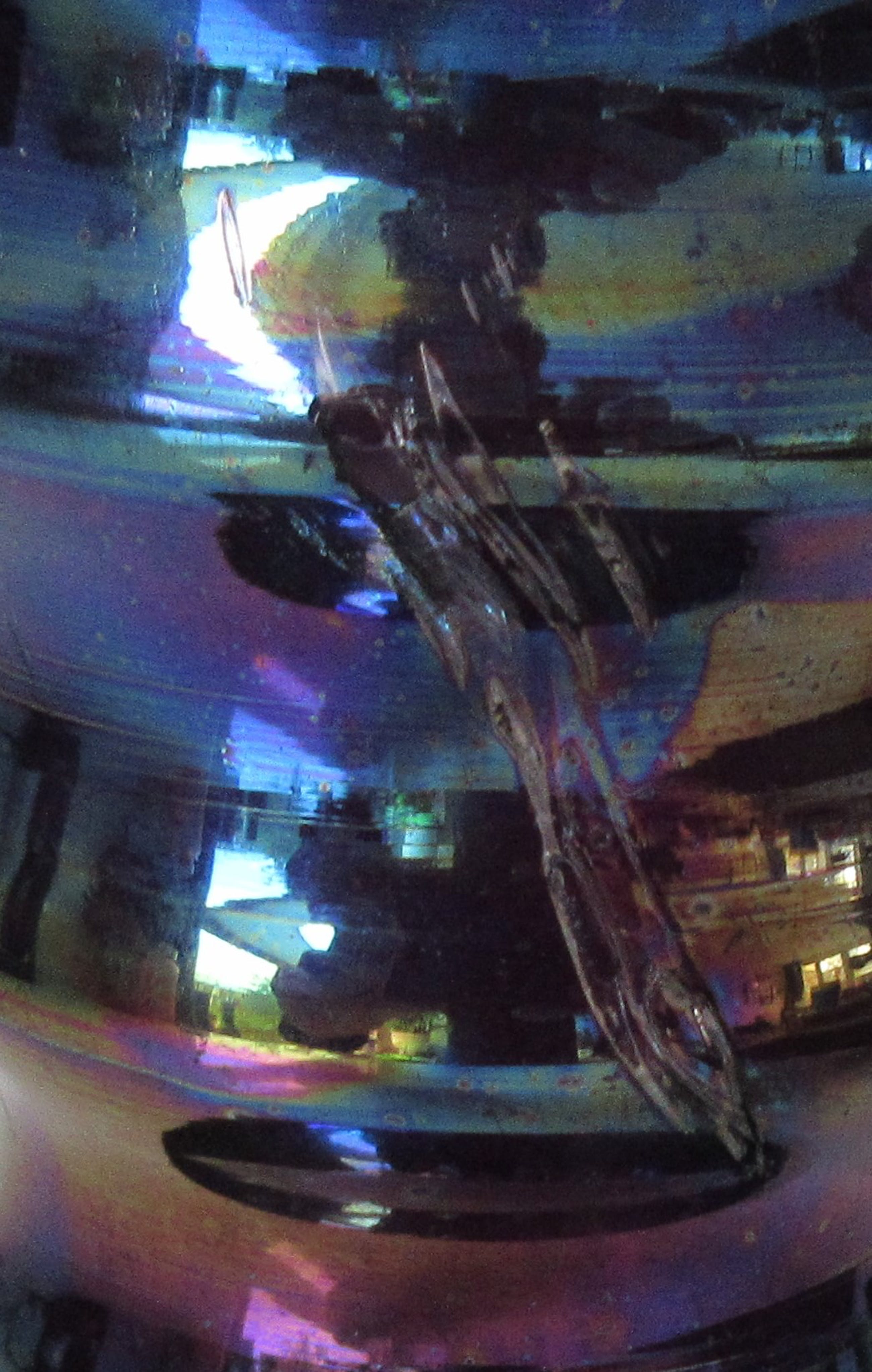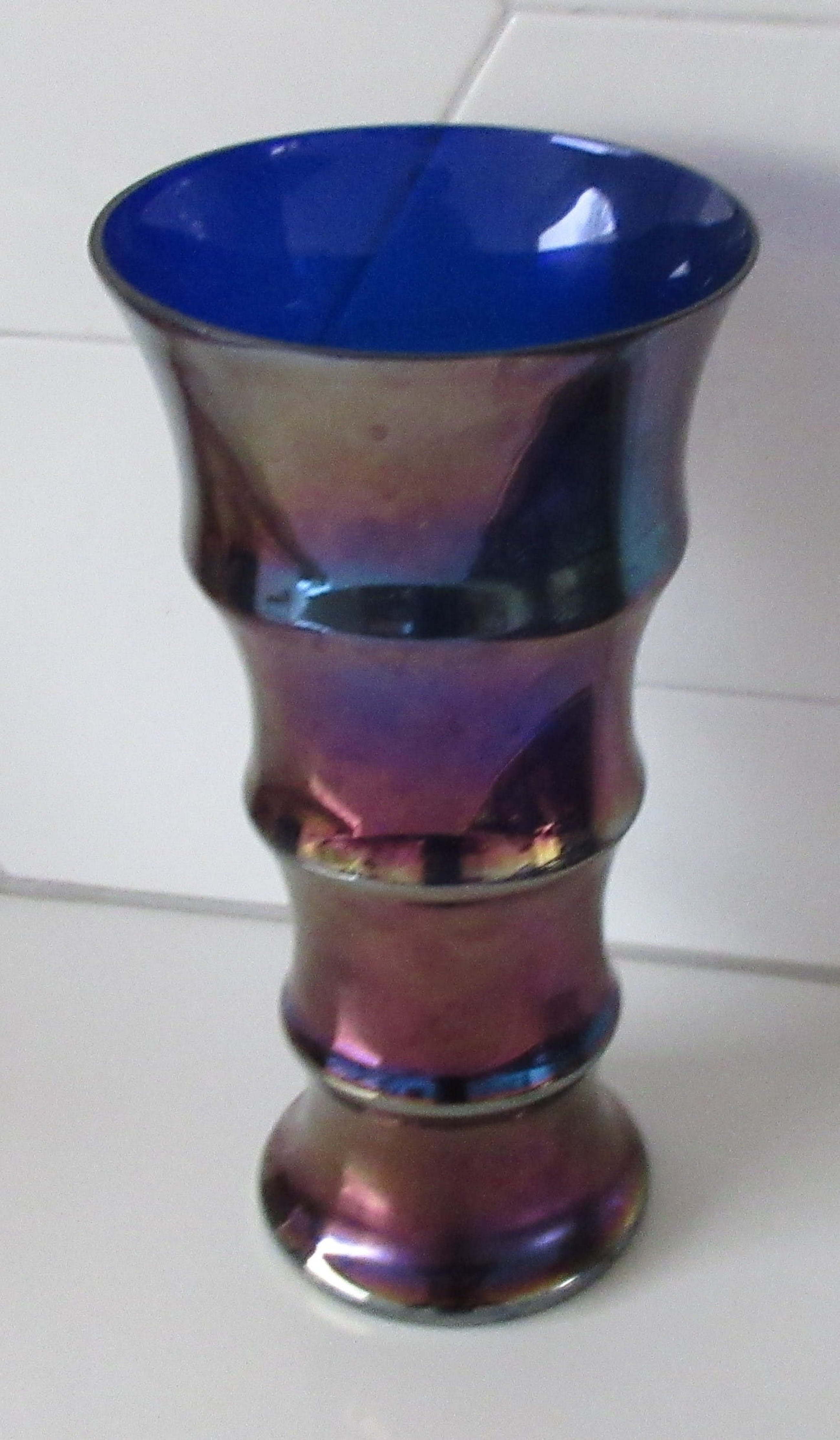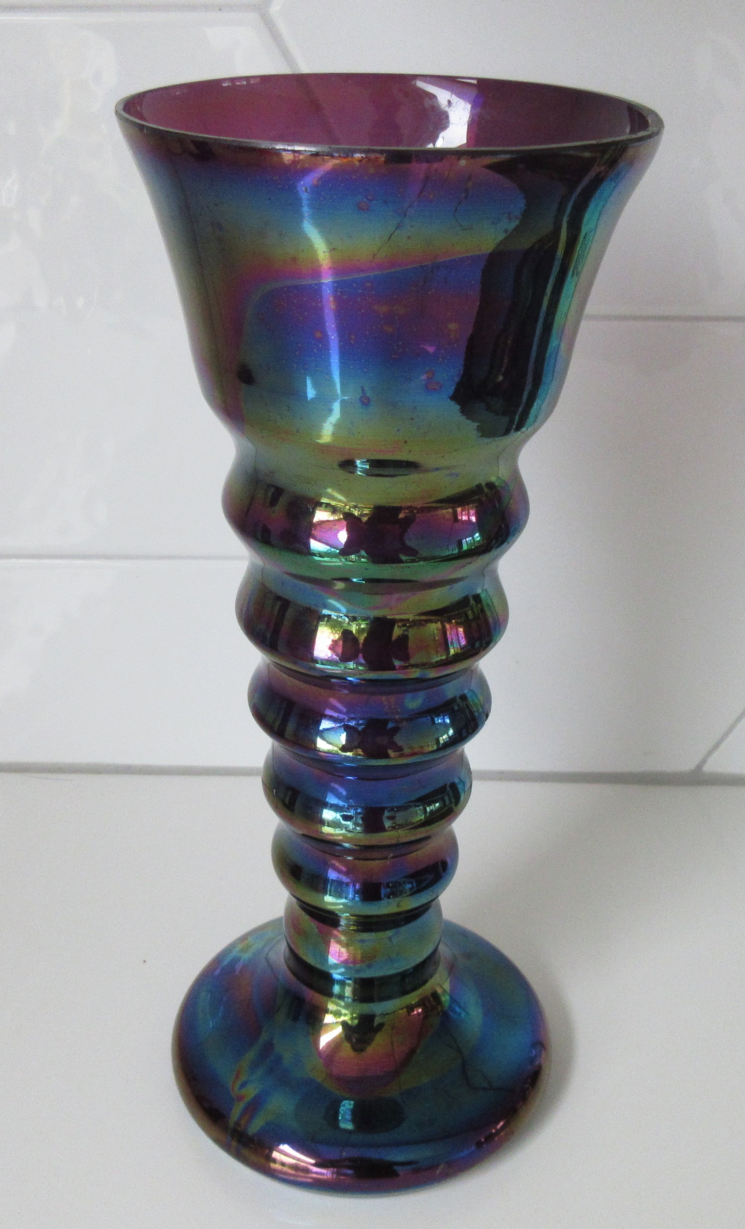 Stel Art Nouveau Iridescent geglazuurde ribbelvazen uitvoering Wilhelm Kralik & Sohne uit de Bohemen. De grote vaas is kobalt blauw en de ander is paars of amethyst kleur. Beiden niet gemerkt. De paarse vaas heeft de volgende afmetingen; 26 cm hoog en 10 cm diameter.