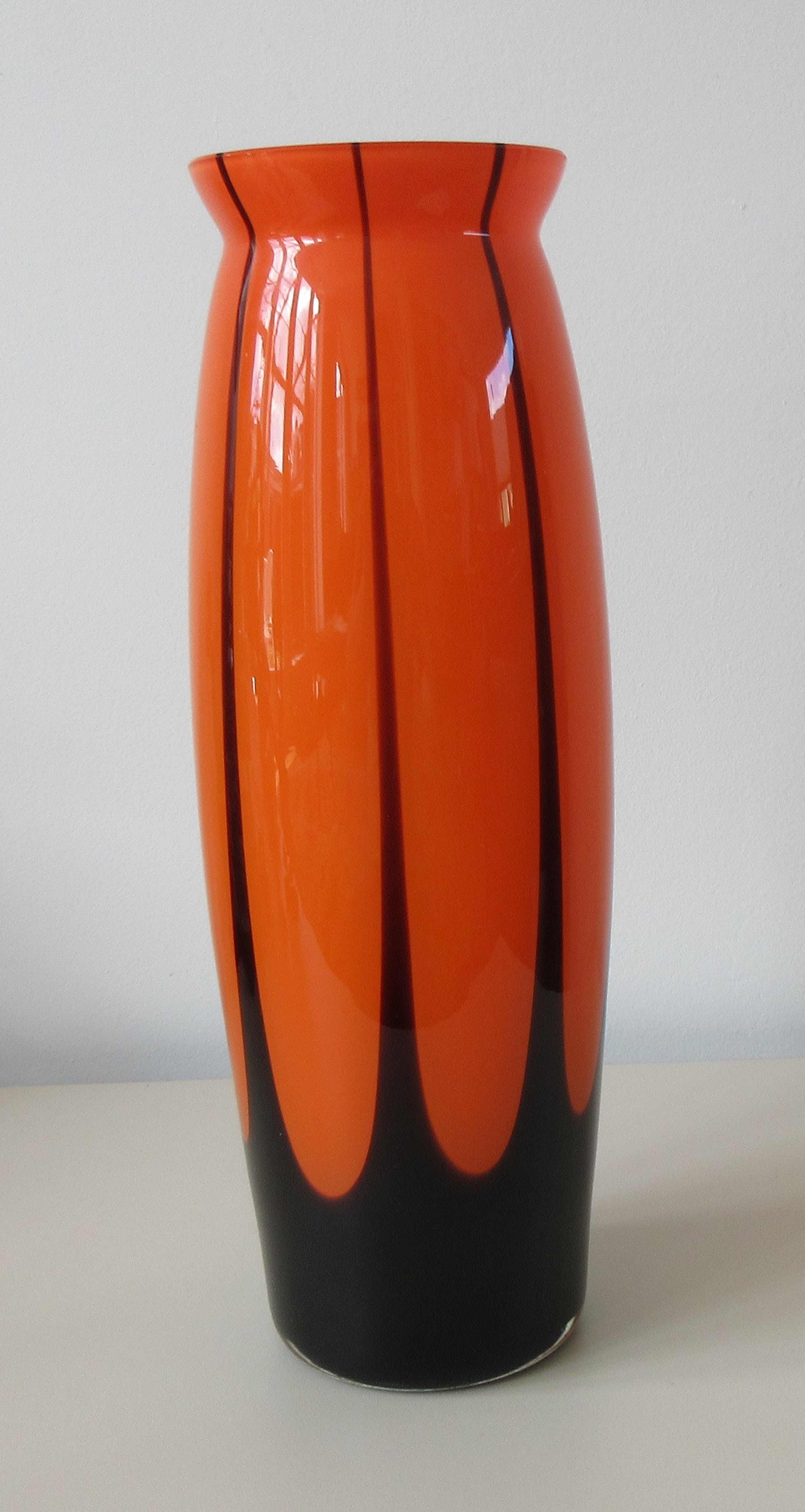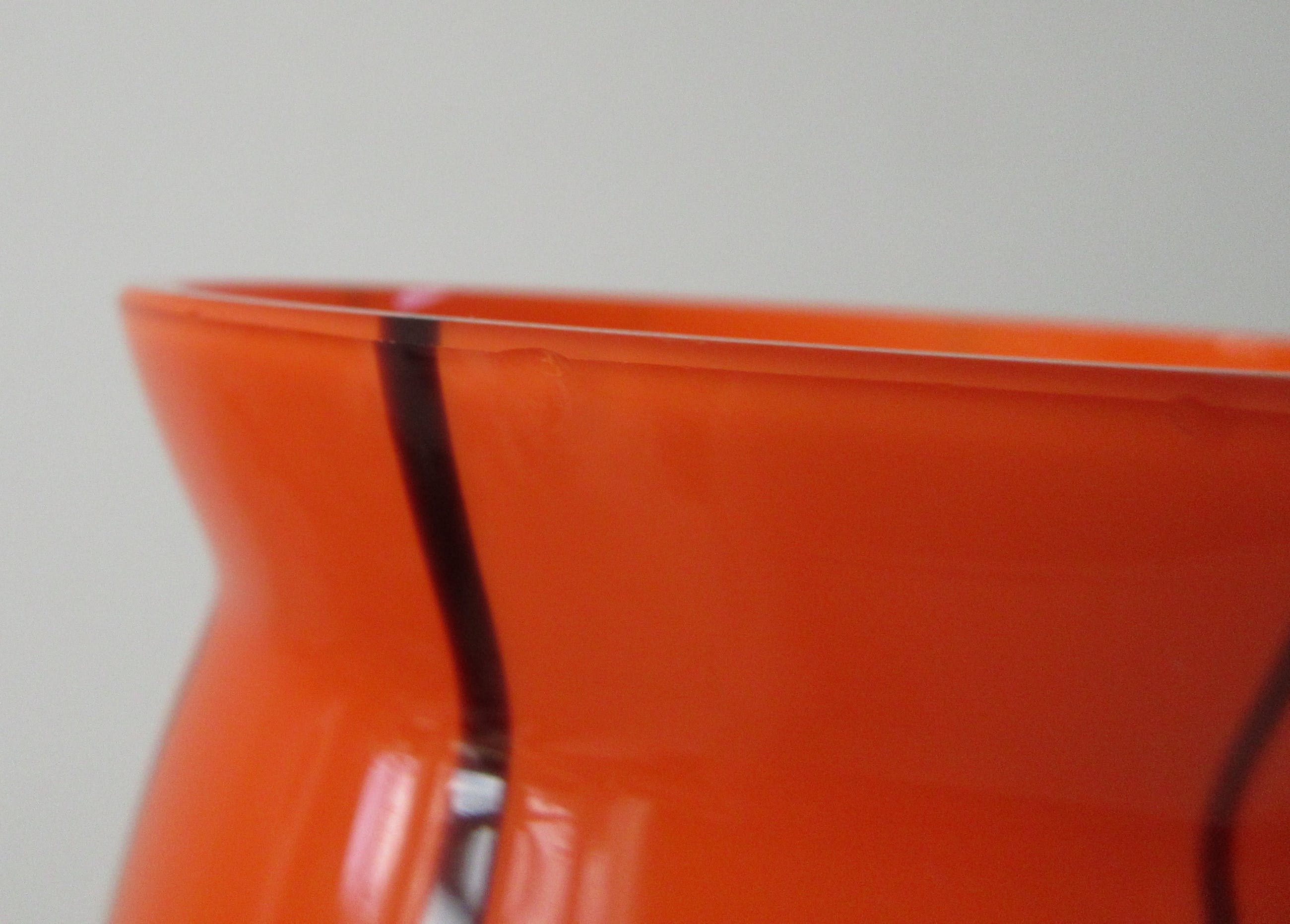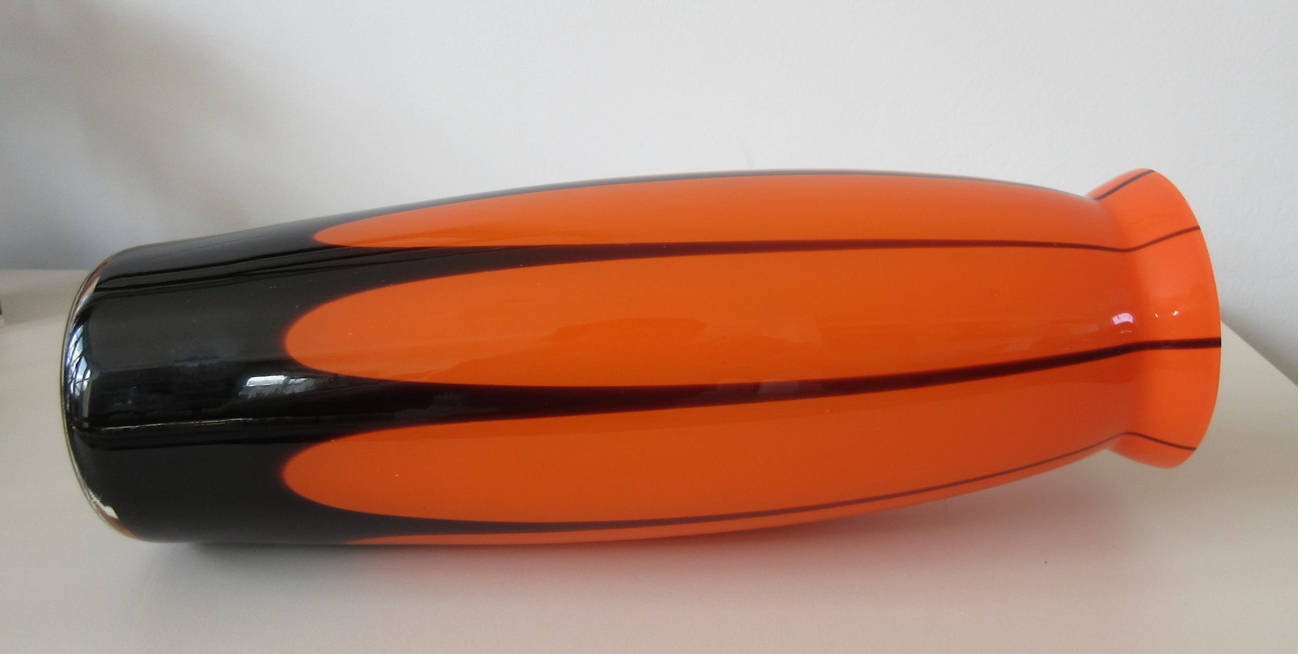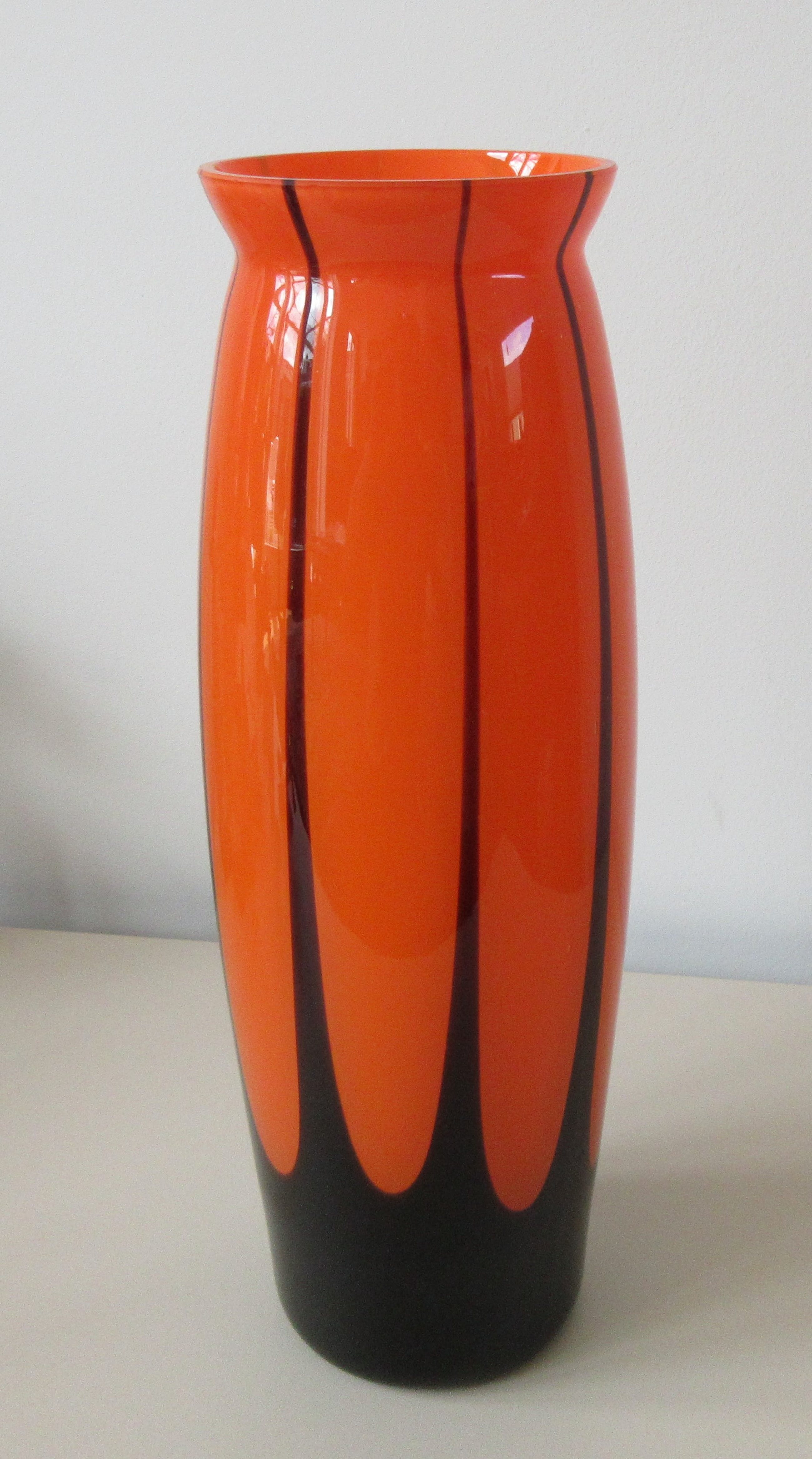 Twee Art Deco Tango vazen uitgevoerd bij Wilhelm Kralik in Bohemen. De vazen zijn oranje zwart en rood zwart. In zeer goede gebruikte conditie. De oranje vaas heeft drie minimale stootplekjes op de bovenrand en de rood zwarte vaas een minimaal stootplekje. Beide vazen zijn niet gemerkt.