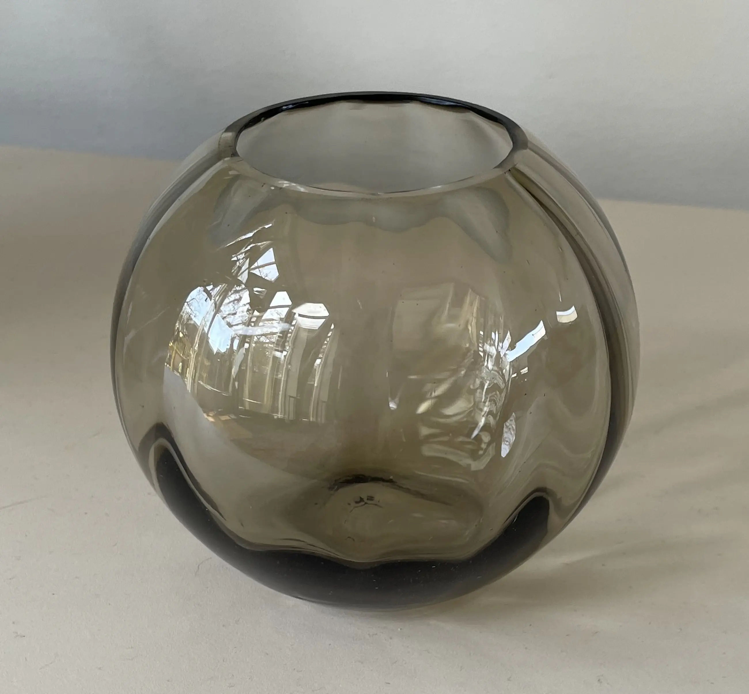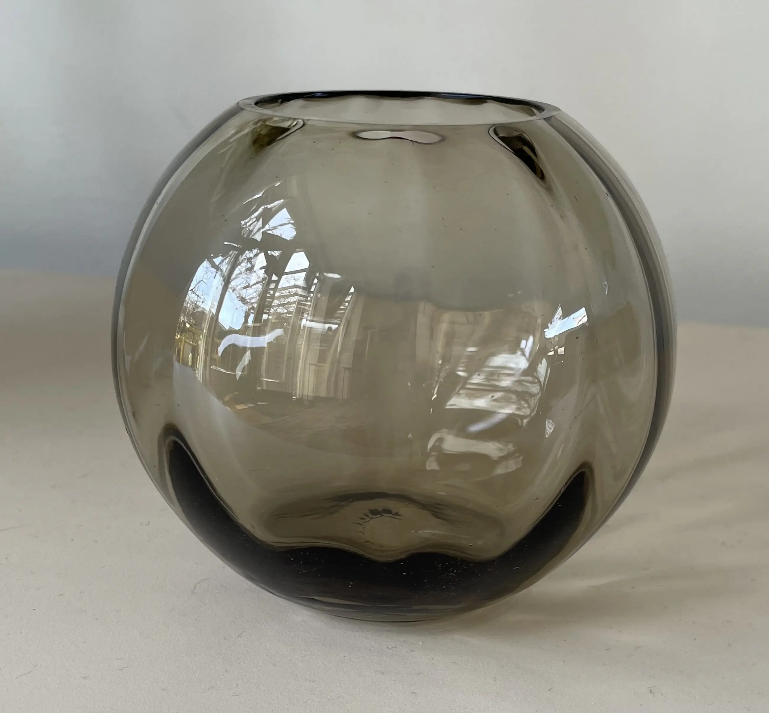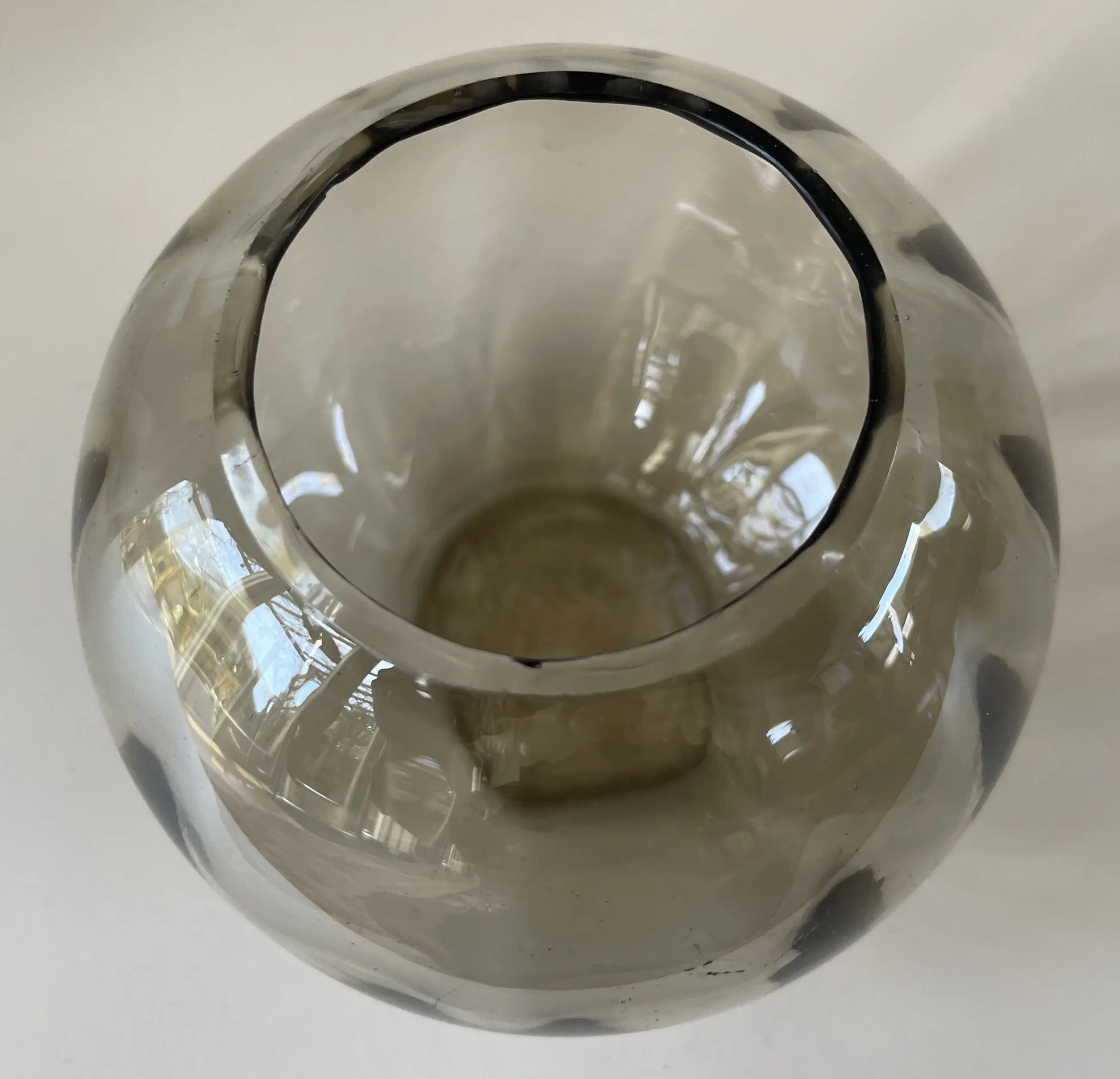 Vintage rookglazen Turmalin Optiek glazen bolvaas ontwerp Dr. Wilhelm Wagenfeld voor WMF. In zeer goede conditie, een minimaal stootpuntje aan de binnenkant.