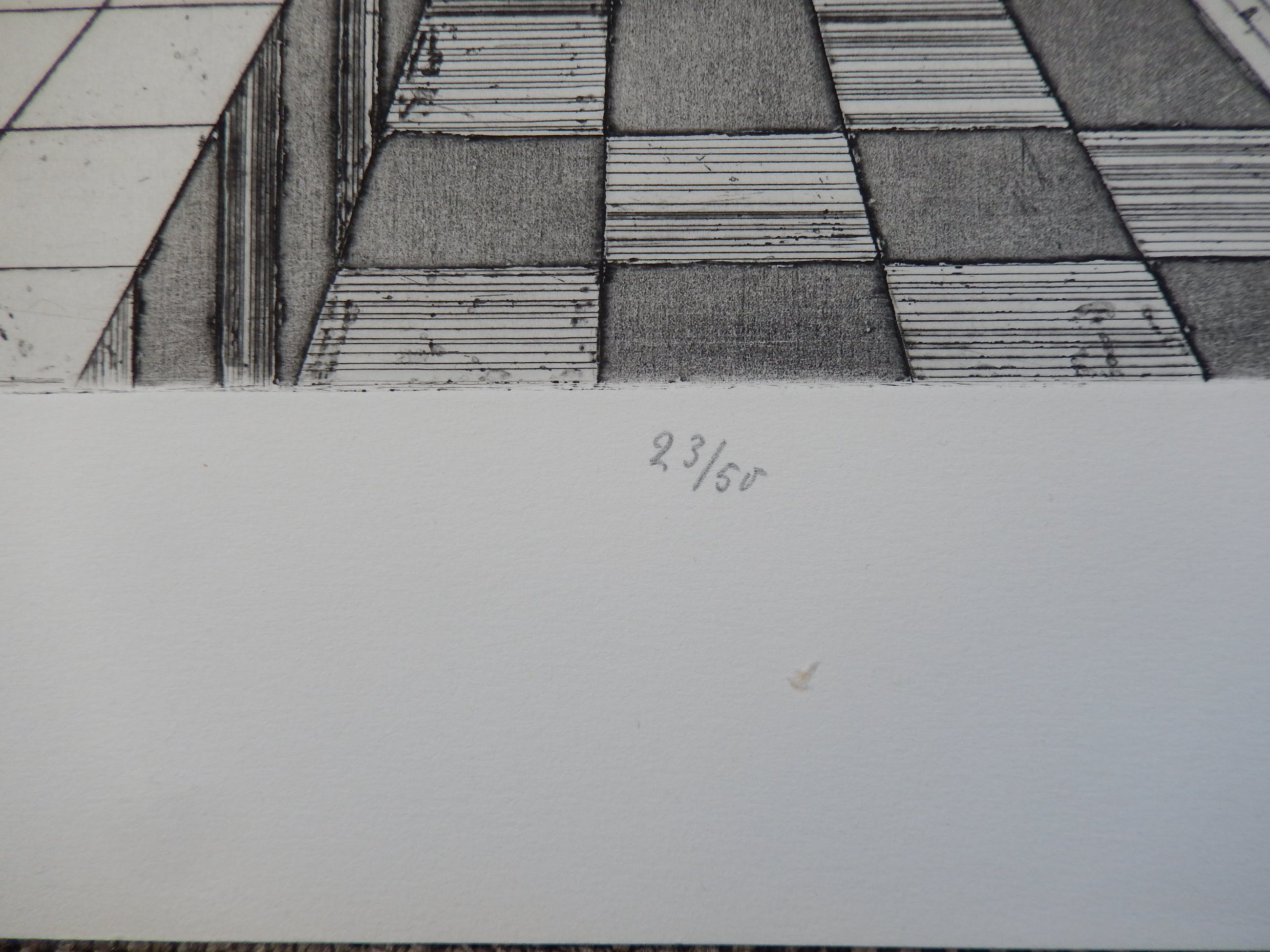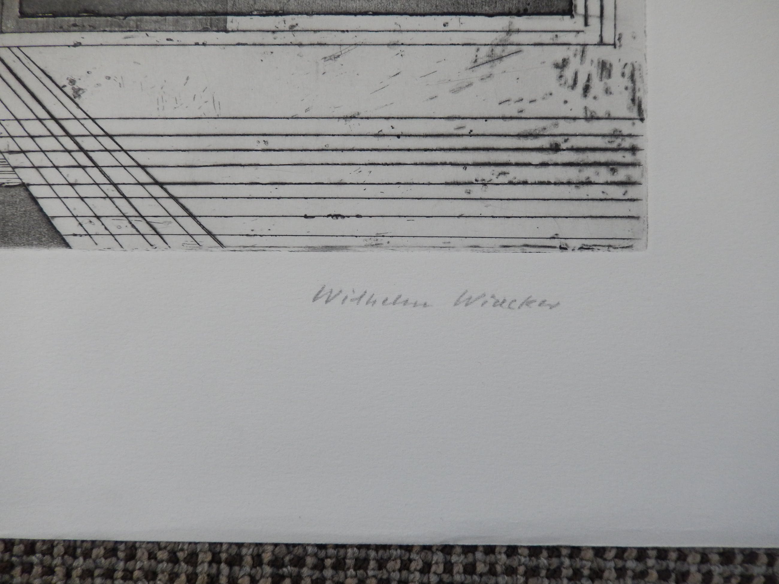 Mooie ets van Wilhelm Wiacker. Titel: Haus der Krüge. Oplage: 23/50. Titel, oplage en naam met potlood onder de afbeelding geschreven. Komt van de Internationale Grafiekverkooptentoonstelling 20-4/20-5-1974.