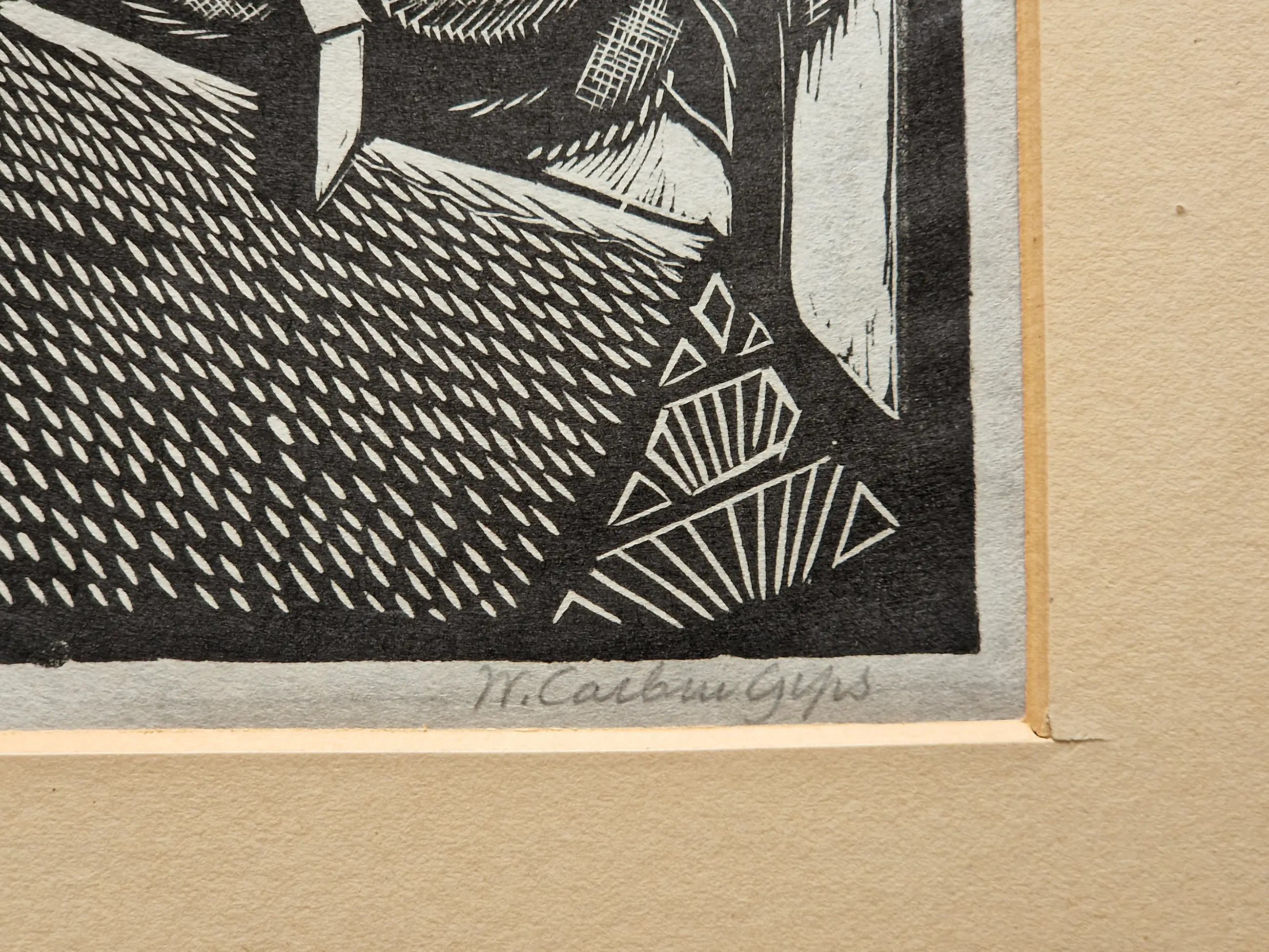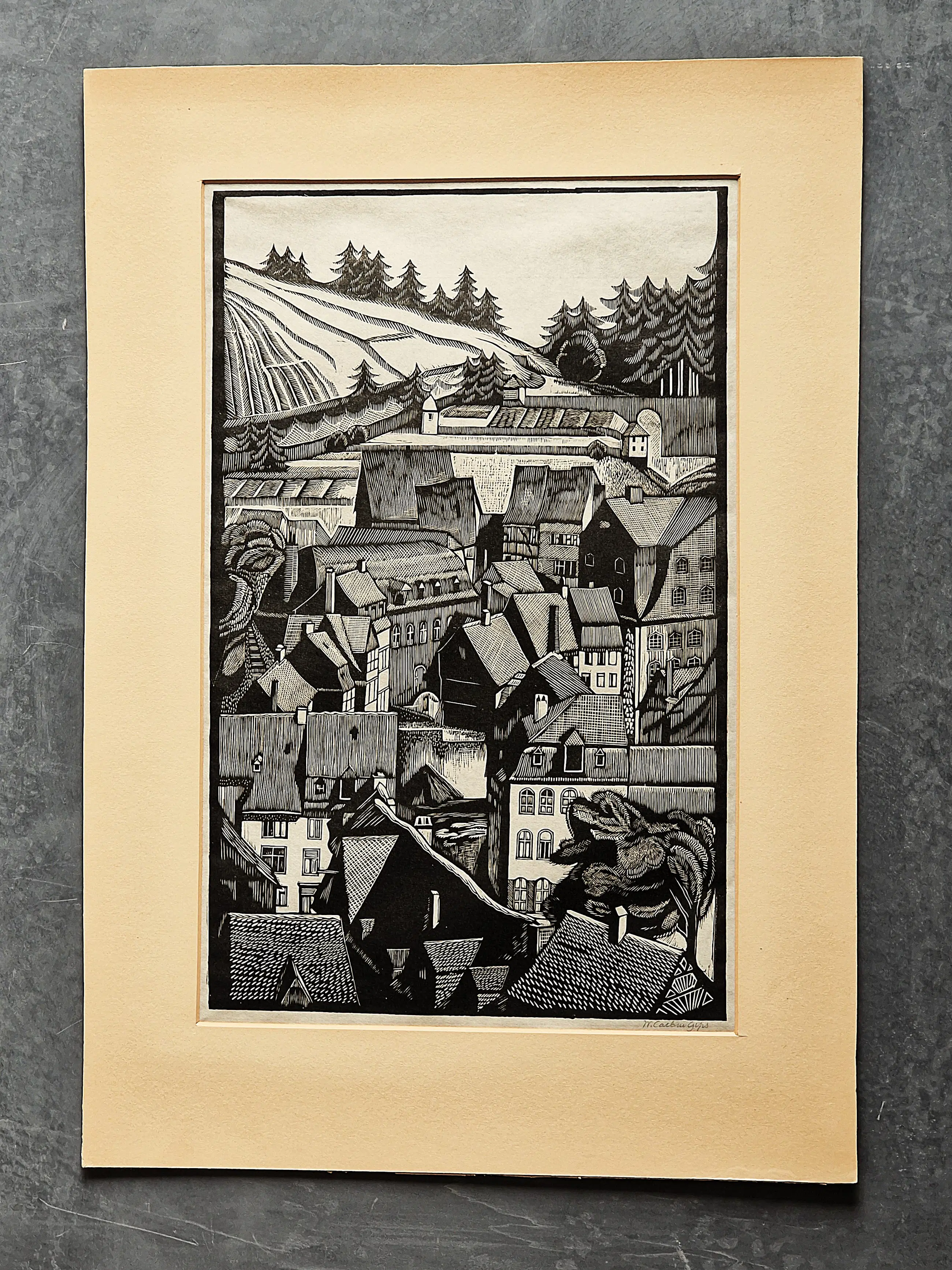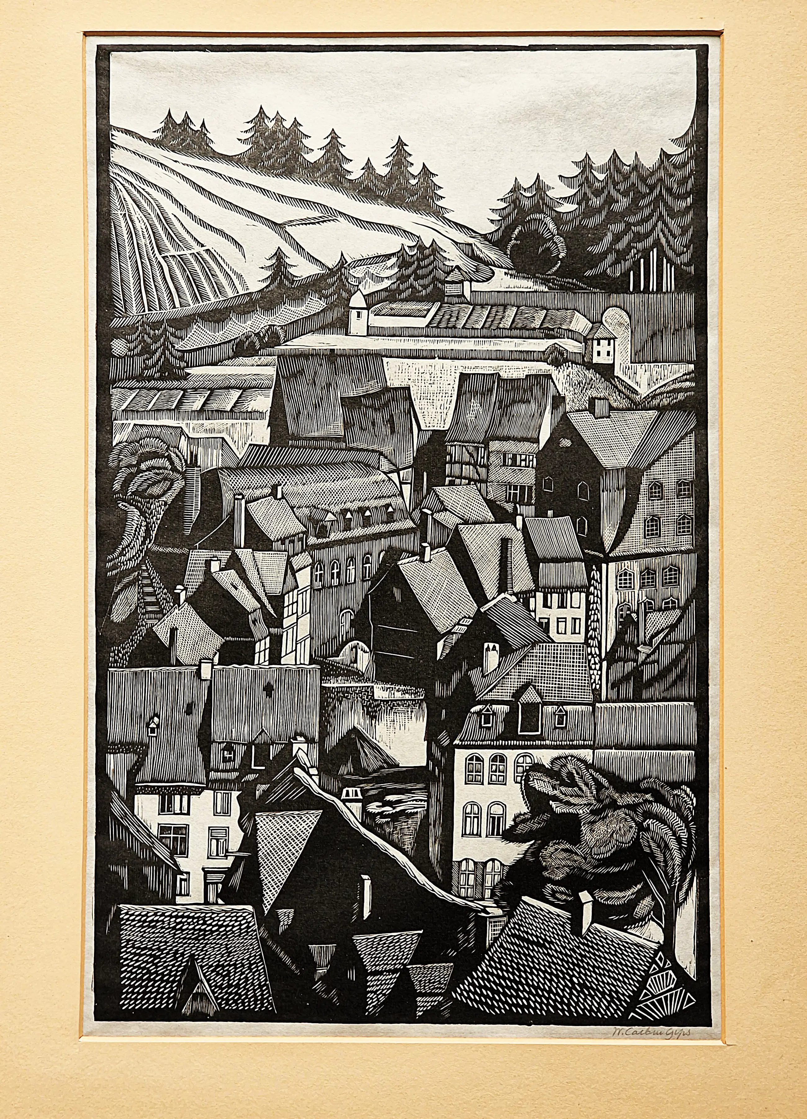 Wilhelmine Carbin-Gips - Jaren 30 "Nieuwe Zakelijkheid" Linosnede "Dorp in heuvelachtig landschap"