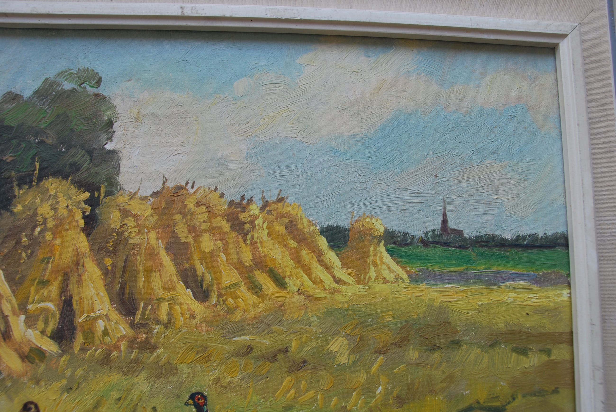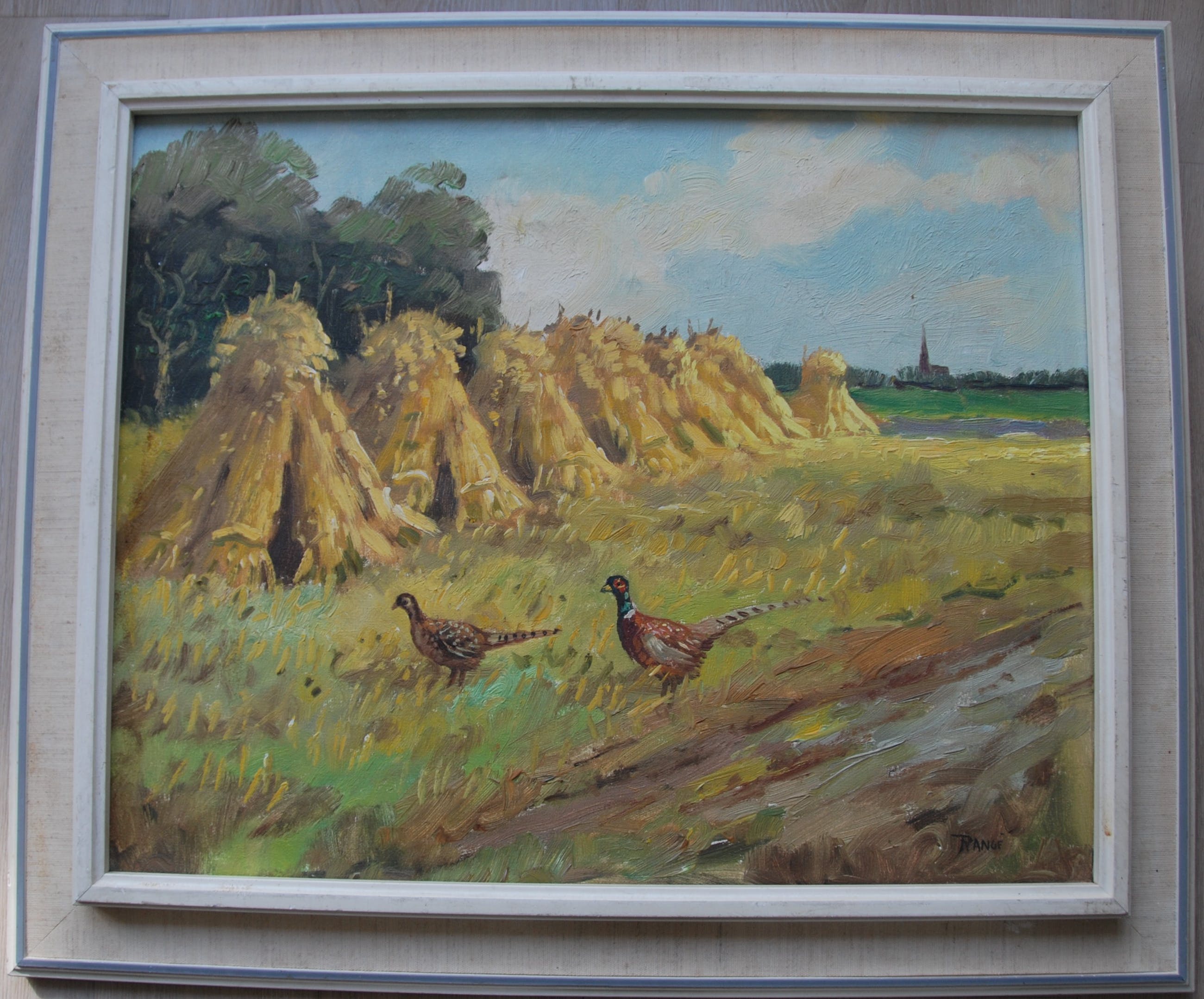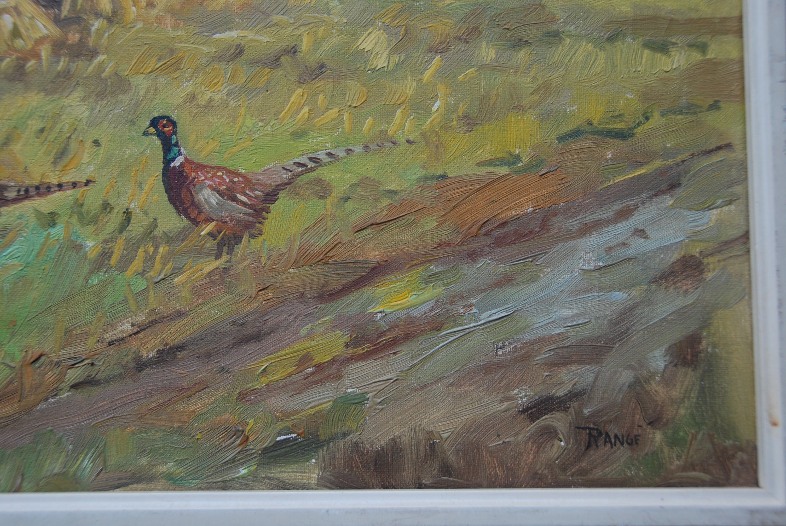 Een landschapsschilderij van 2 fazanten in een graslandschap. Rechts onderin gesigneerd door Rangé, ook wel schilder Enneking genoemd. De zichtbare beschildering is 48,5cm breed en 38,5 cm hoog.