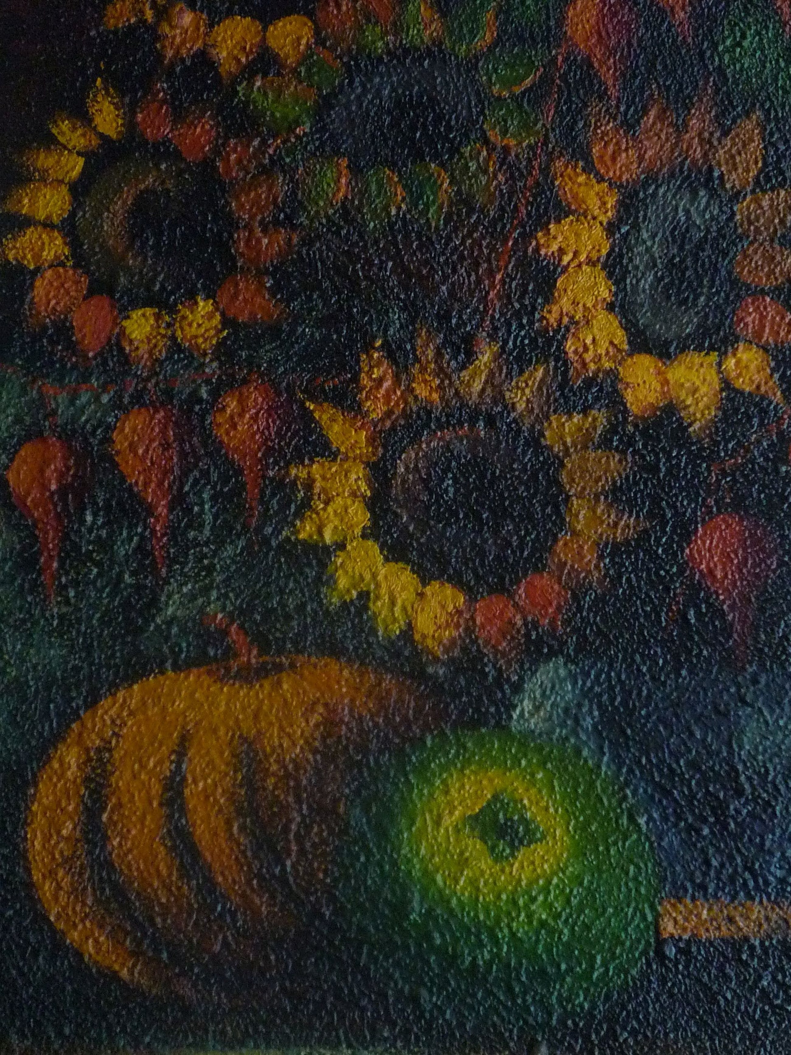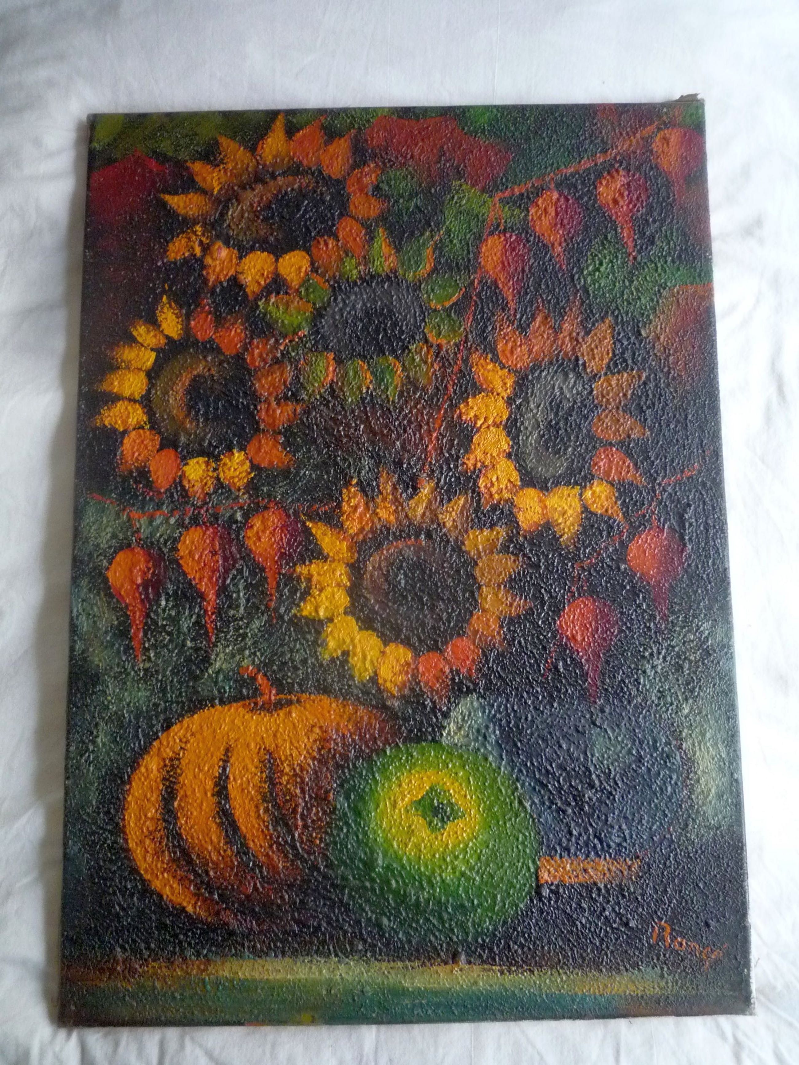 Herfststilleven met zonnebloemen, pompoenen en lampionnetjes