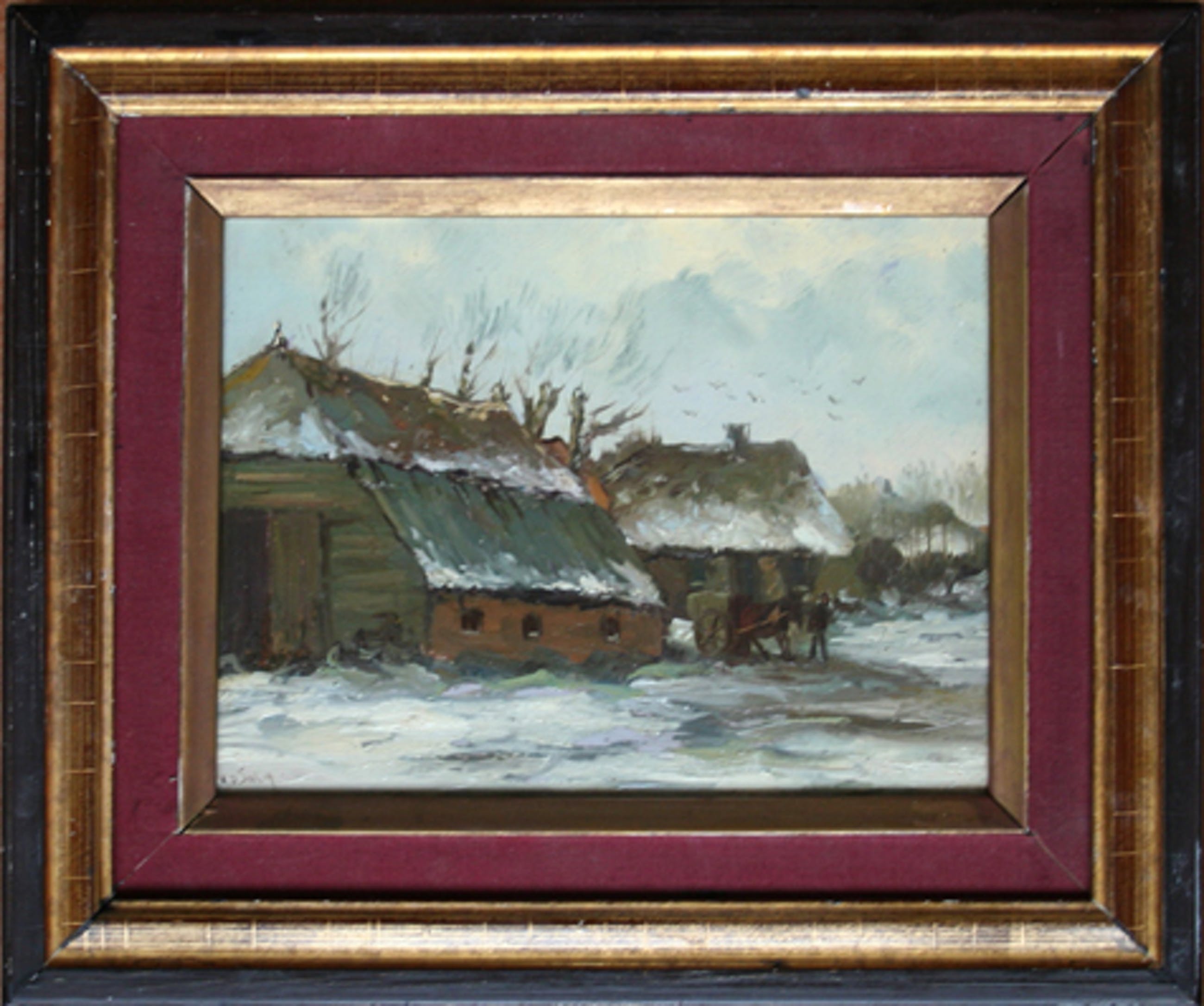 In de typische kantige stijl van van der Salm Een boerenhoeve in winterse sneeuw met voerman en paard.