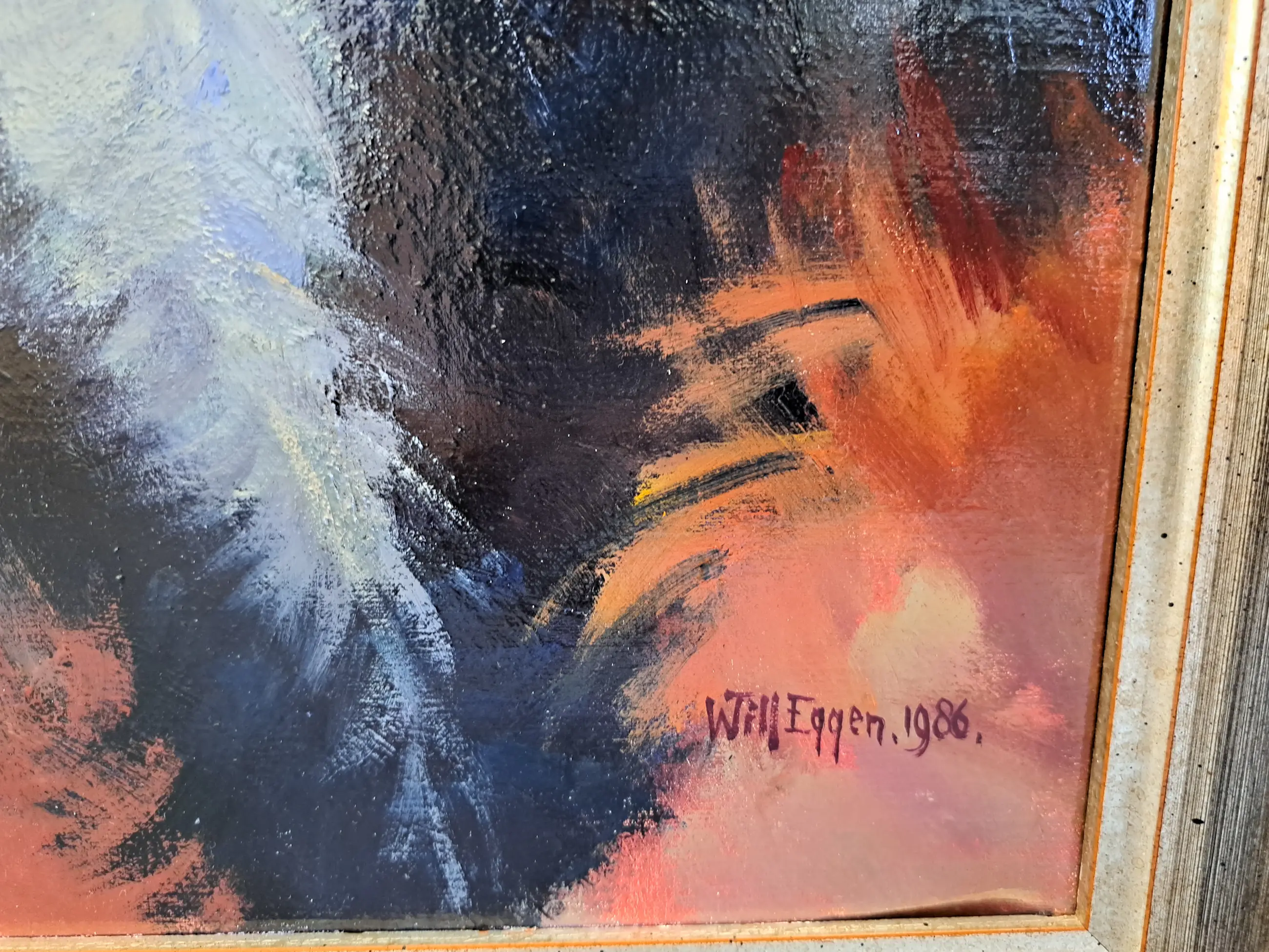 Het schilderij is uit een erfenis. Het schilderij is door de schilder gemaakt op verzoek. Het heeft altijd in de woonkamer gehangen.