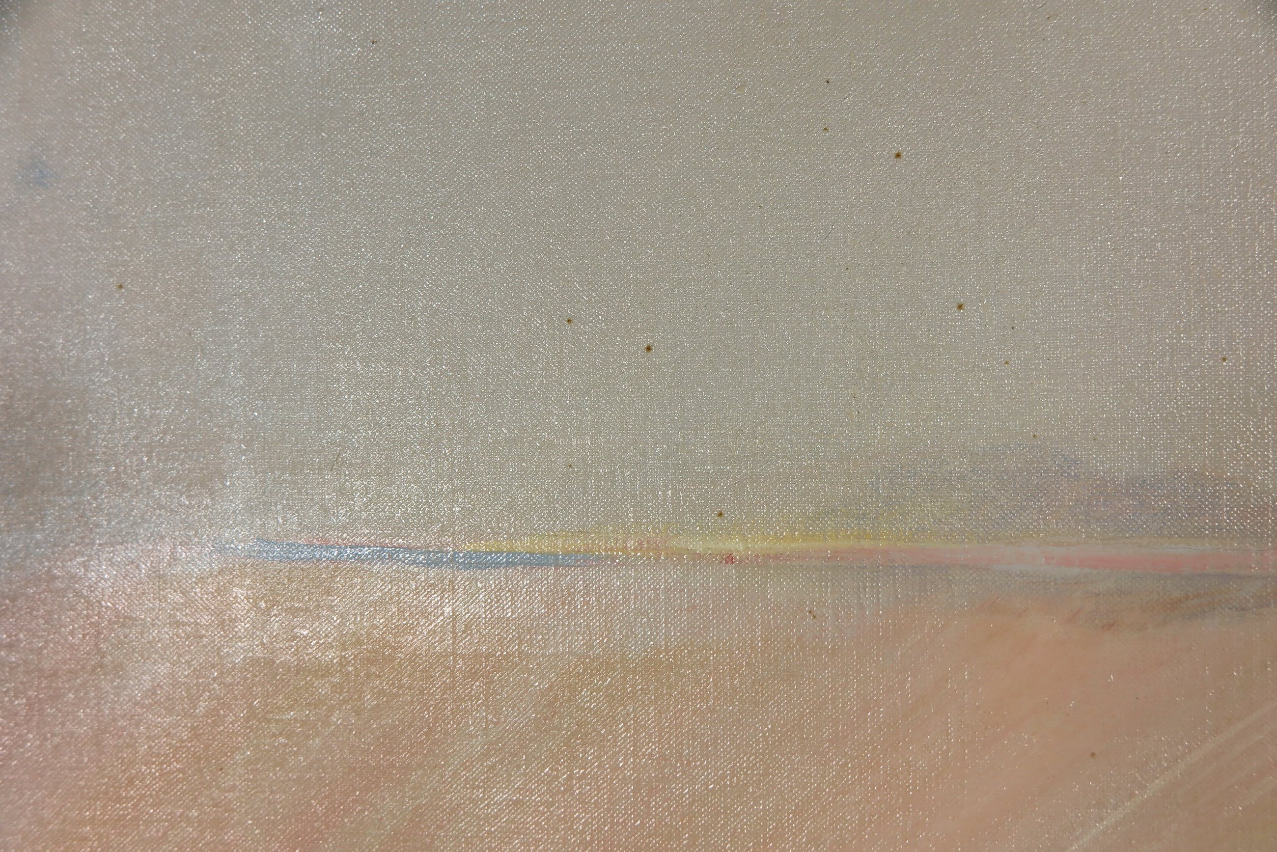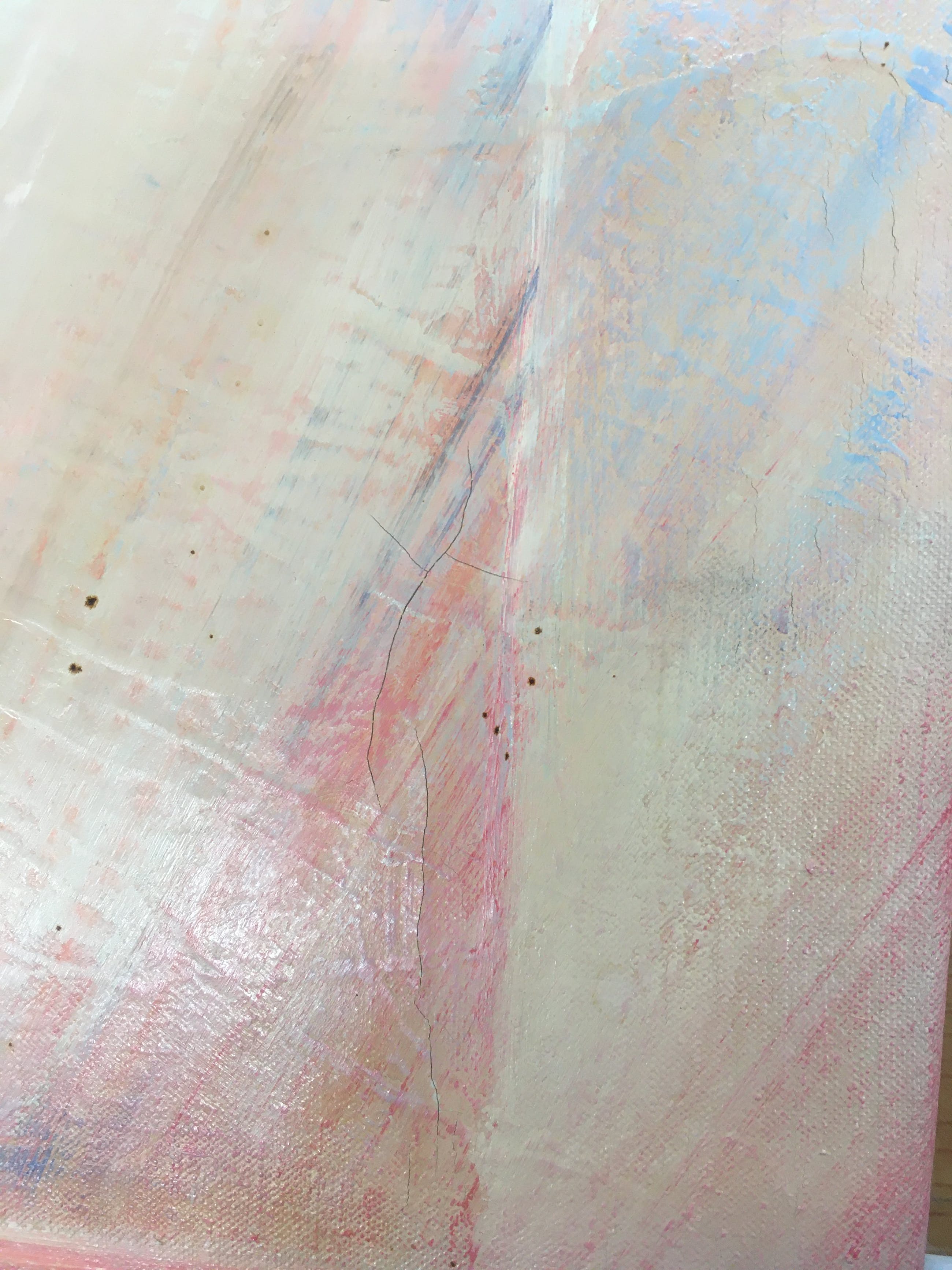 Behoorlijk wat vuil in de vorm van bruine stipjes op het verfoppervlak (zie foto's). Op enkele plekken wat lichte craquelé. | |