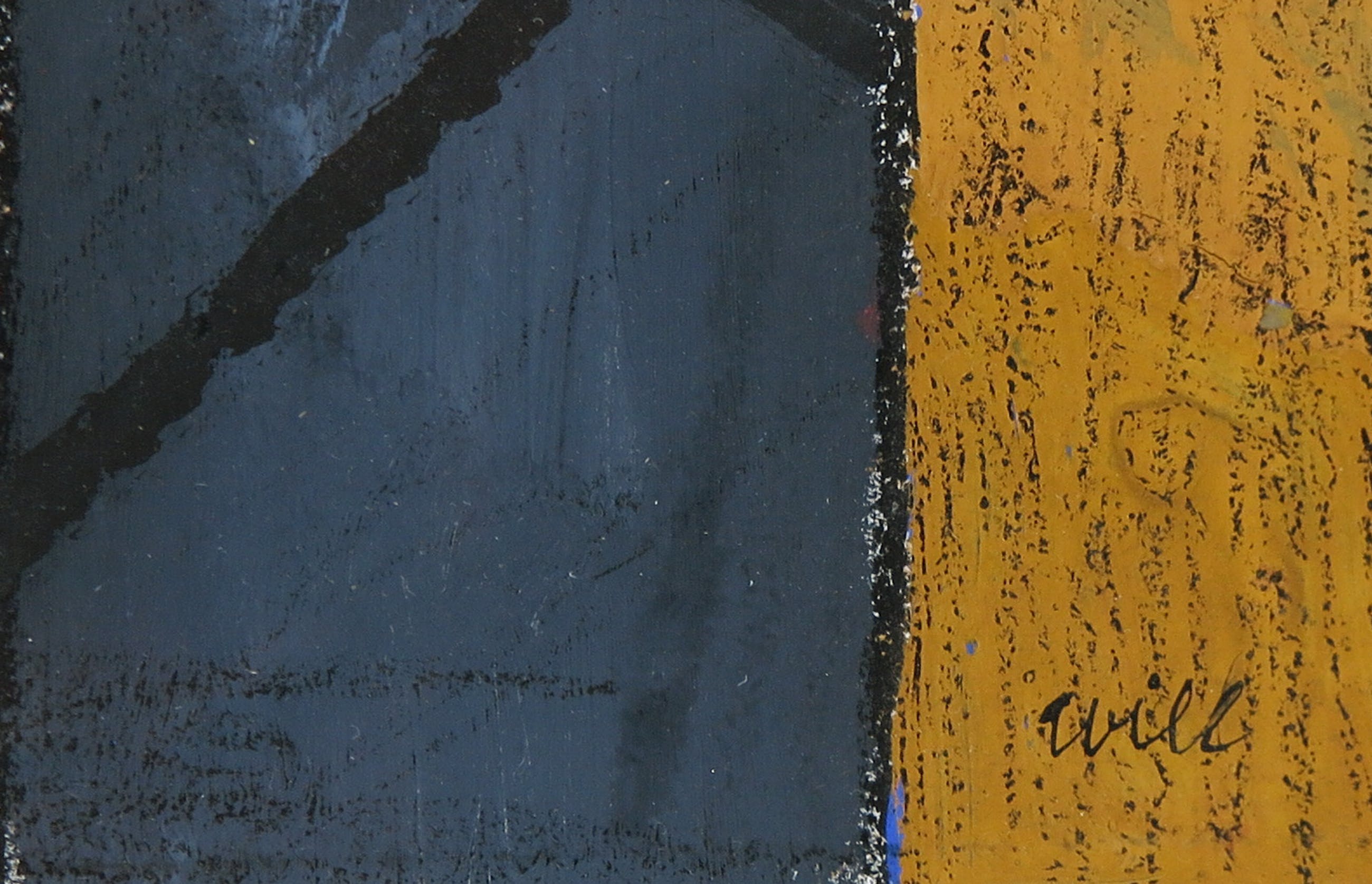 Gouache met een lichte structuur/reliëf, in grijs, wit, groen, rood en geel. Gemaakt door de Haagse kunstenaar Will Leewens in de herkenbare stijl van de Nieuwe Haagsche School. Techniek niet geheel duidelijk. Het lijkt Gouache/Pastel.