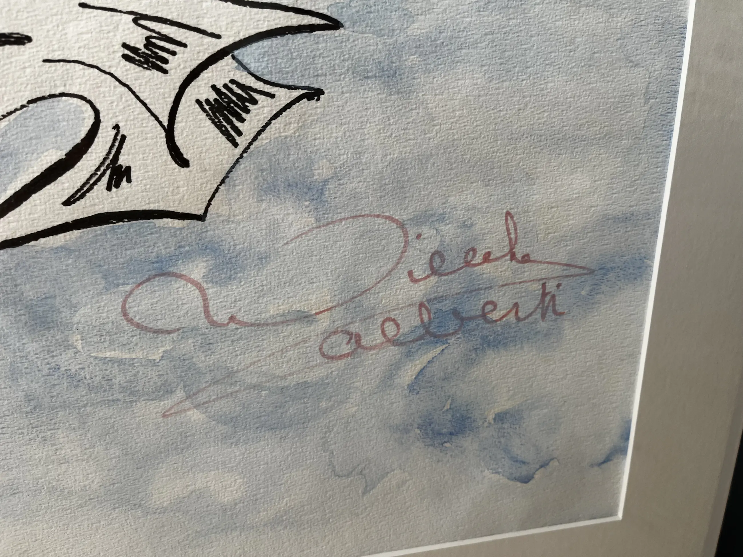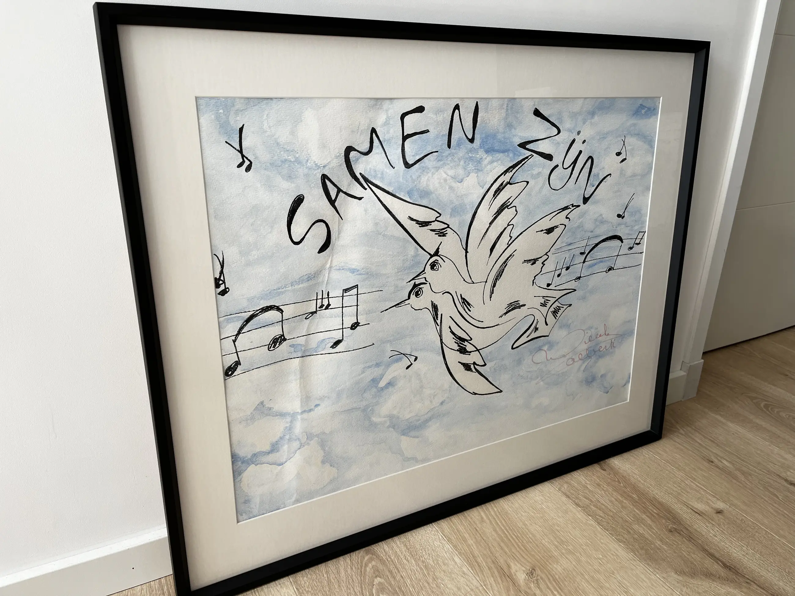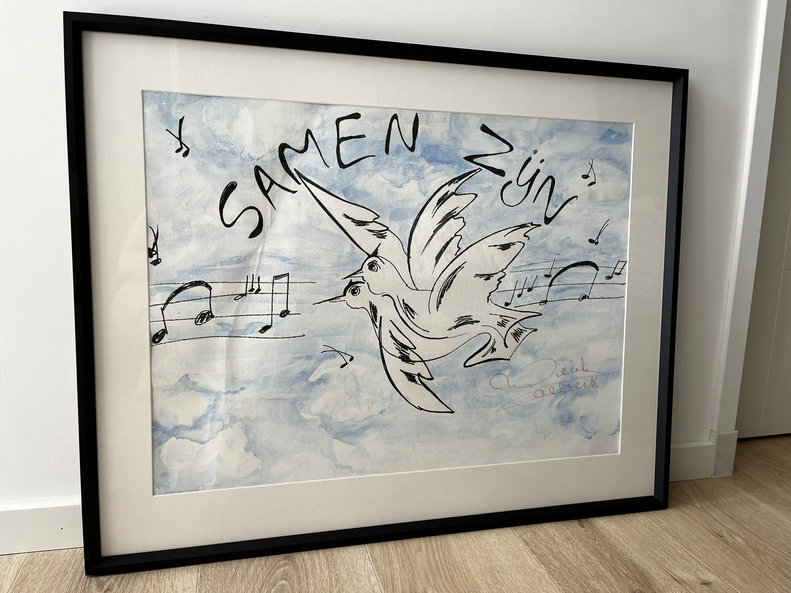 Op een veiling gekocht voor het Goede Doel. Een uniek item is dit prachtige schilderij van zangeres Willeke Alberti. Haar beroemdste en mooiste lied “Samen Zijn” met muzieknoten erin verwerkt en met haar handtekening. Ik zie in de vogels vredesduiven, maar kunnen ook vogels zijn. Helaas wat kreukels erin maar verder puntgaaf en ingelijst met passe-partout.