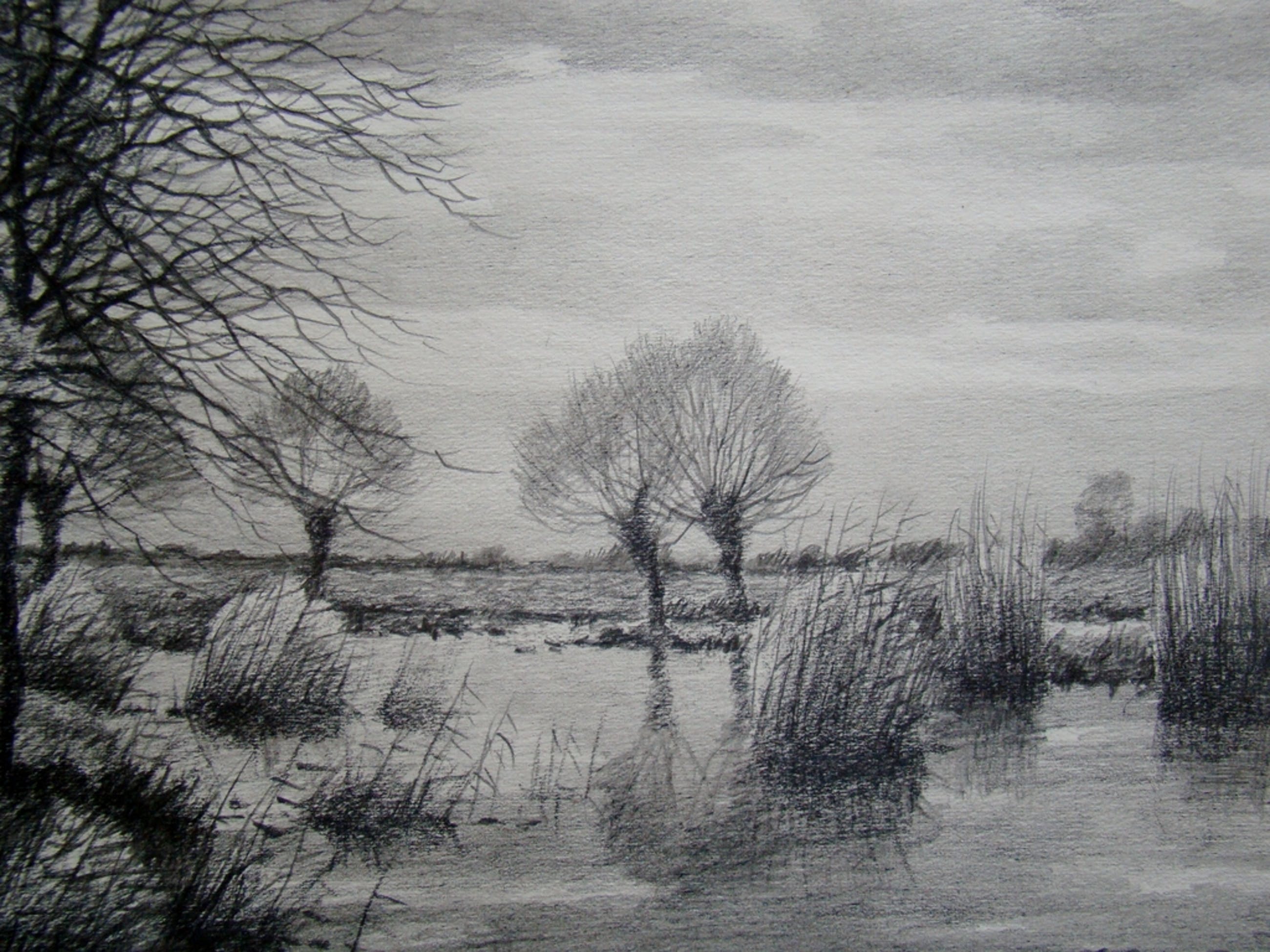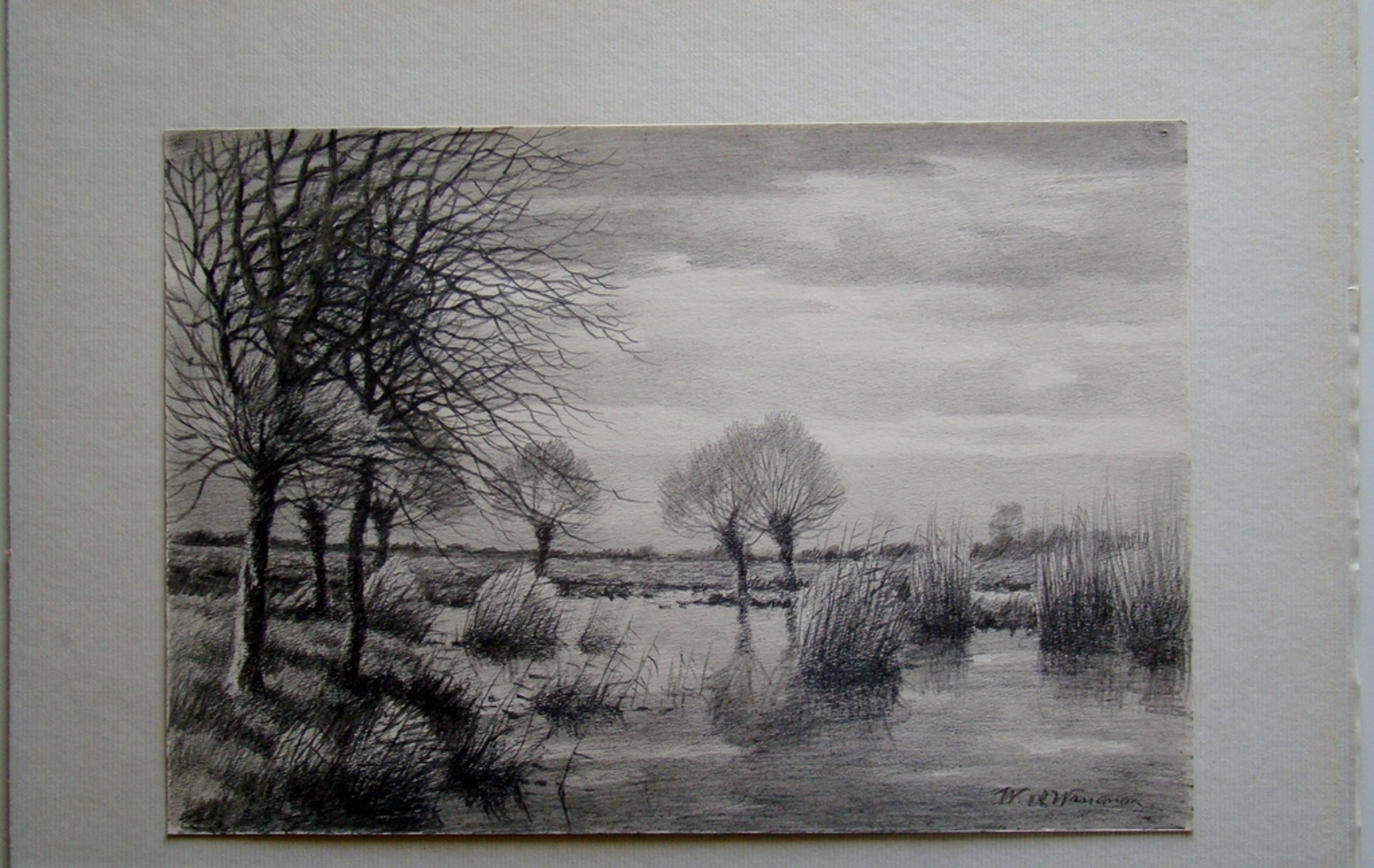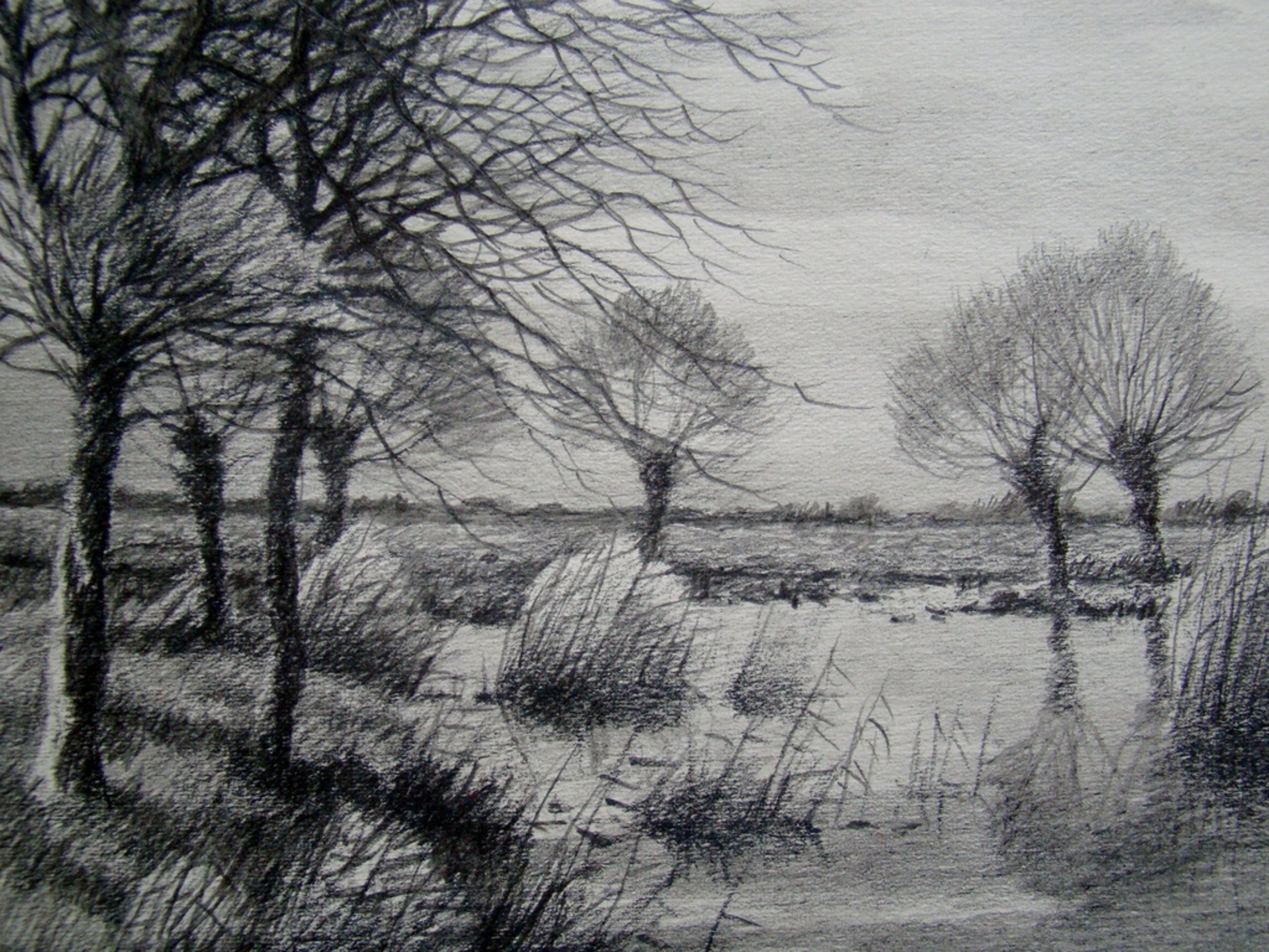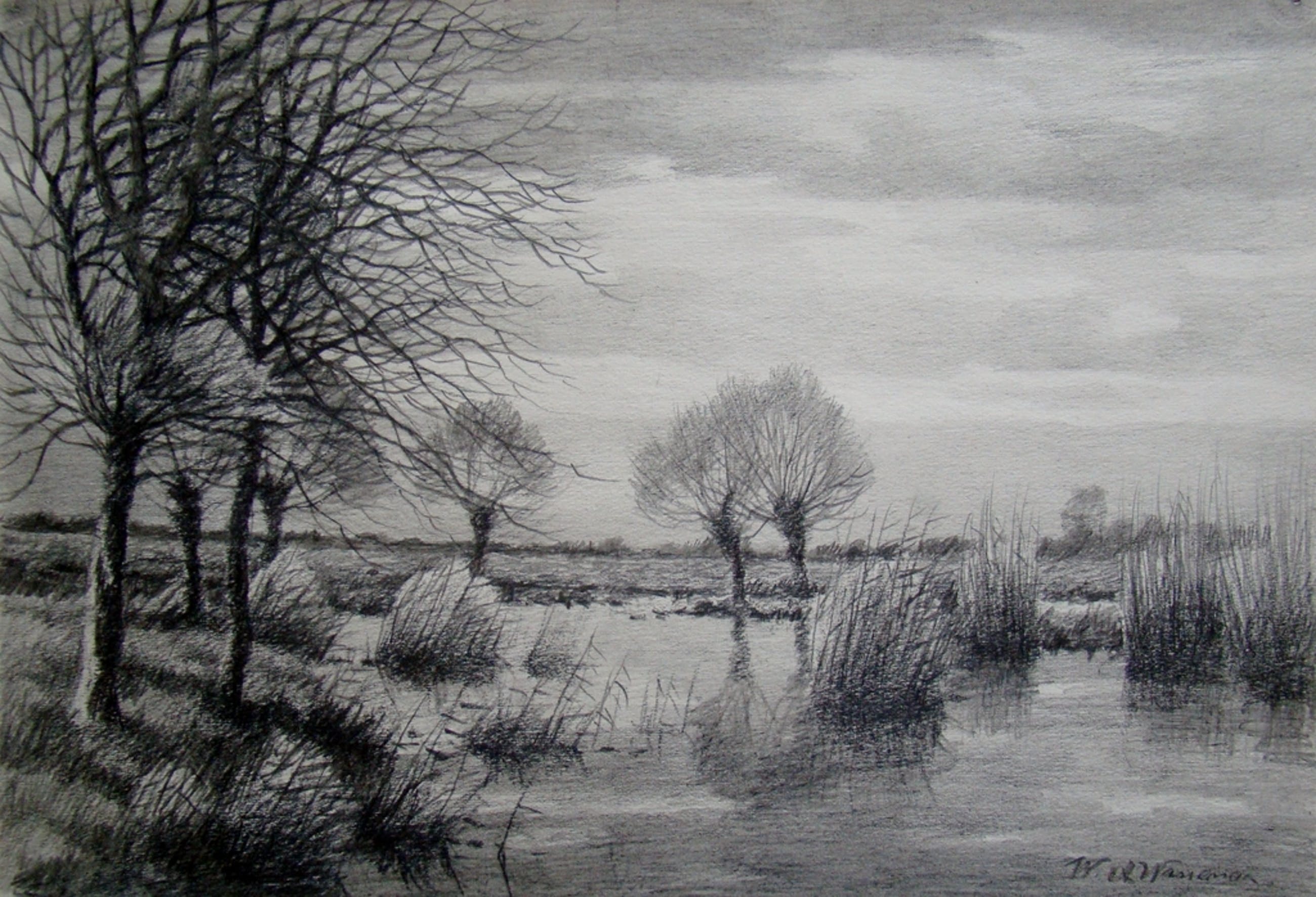 Sterke en mooi uitgewerkte potloodtekening van de plassen bij Reeuwijk.