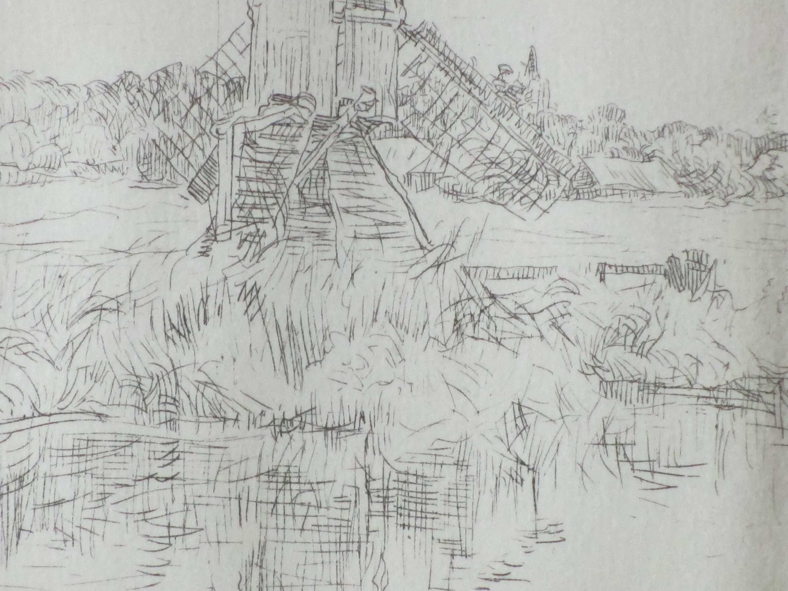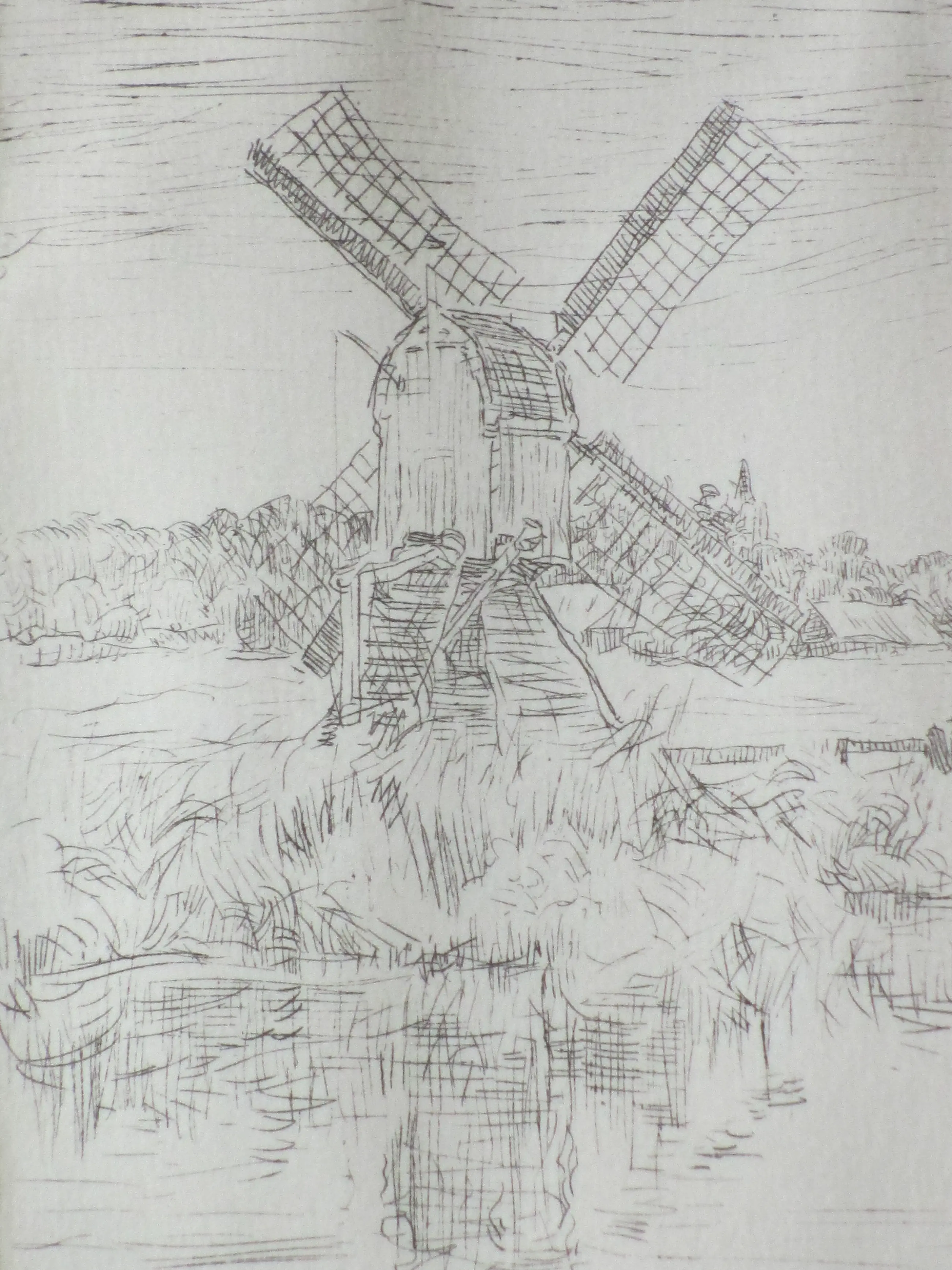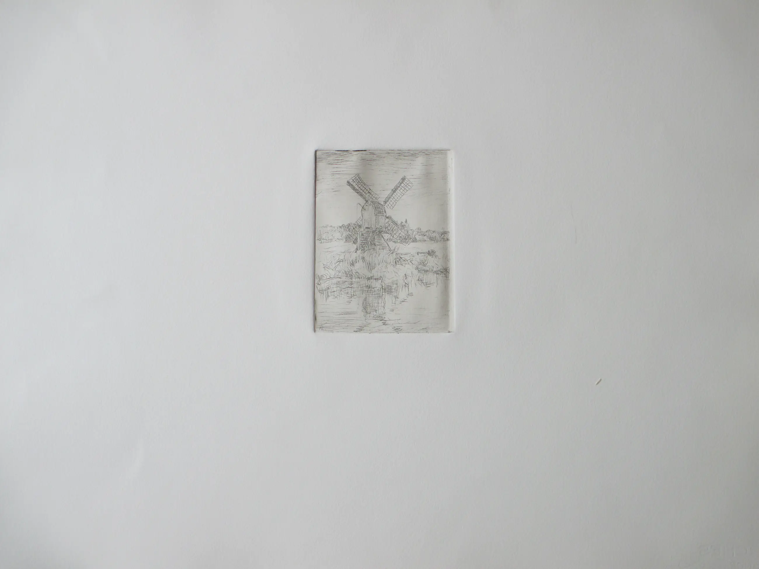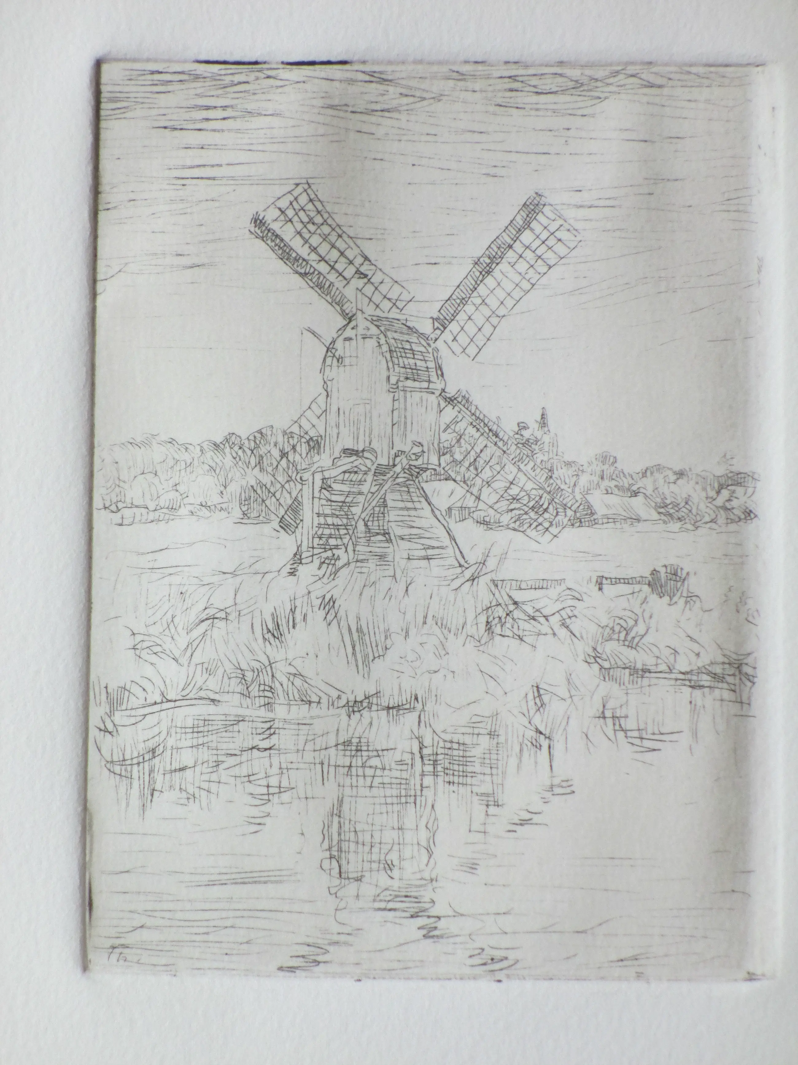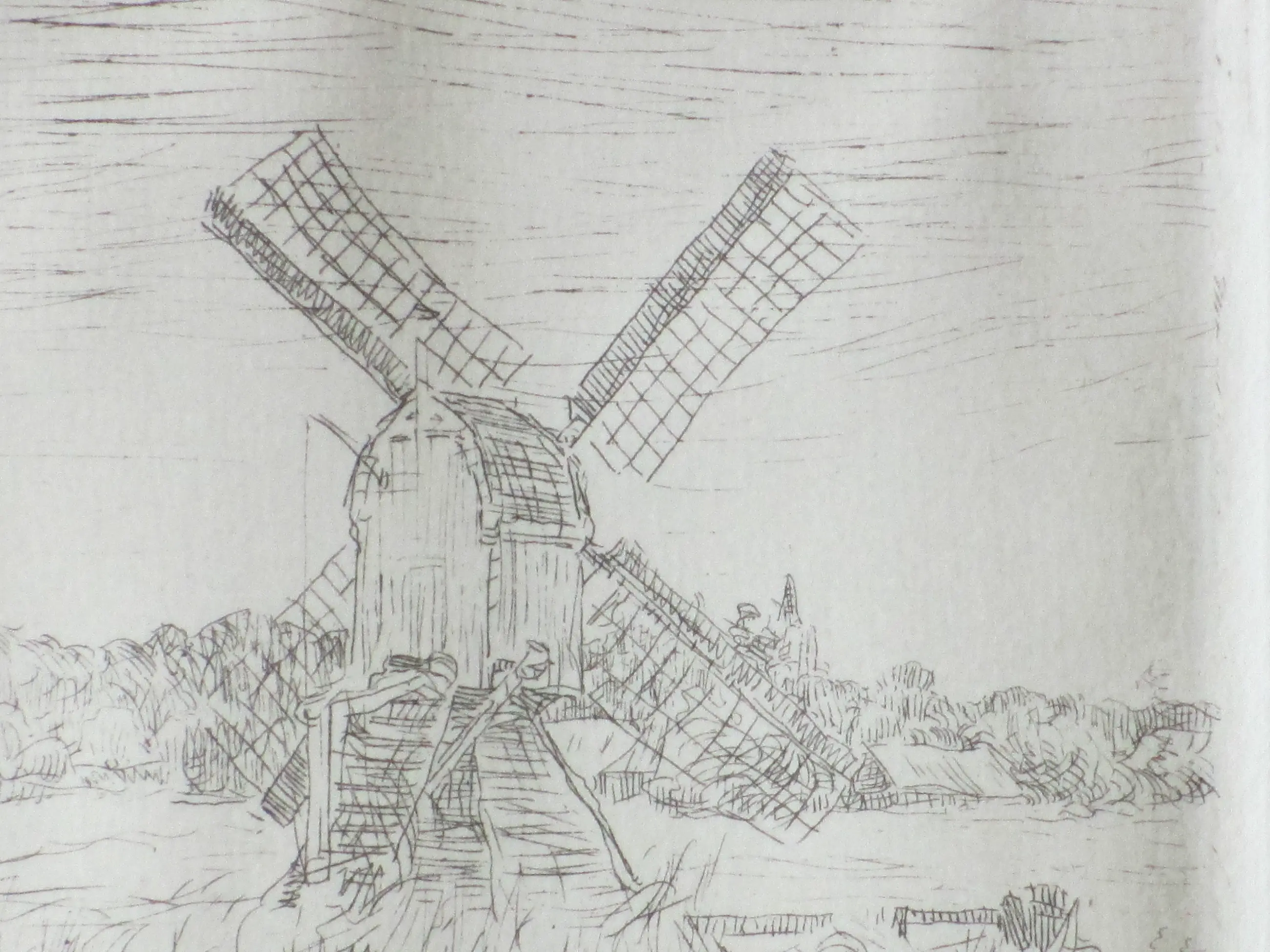 Ets door Willem Bastiaan Tholen Voorstelling van een wipmolen te Warmond Losbladig, beeldmaat 15x11, bladmaat 50x65 Gesigneerd in de druk l.o.: 'Tholen' Herkomst: Kunsthandel G.J.Scherpen uit Bussum Fraaie postume druk, dus niet handgesigneerd Authenticiteit volledig gegarandeerd