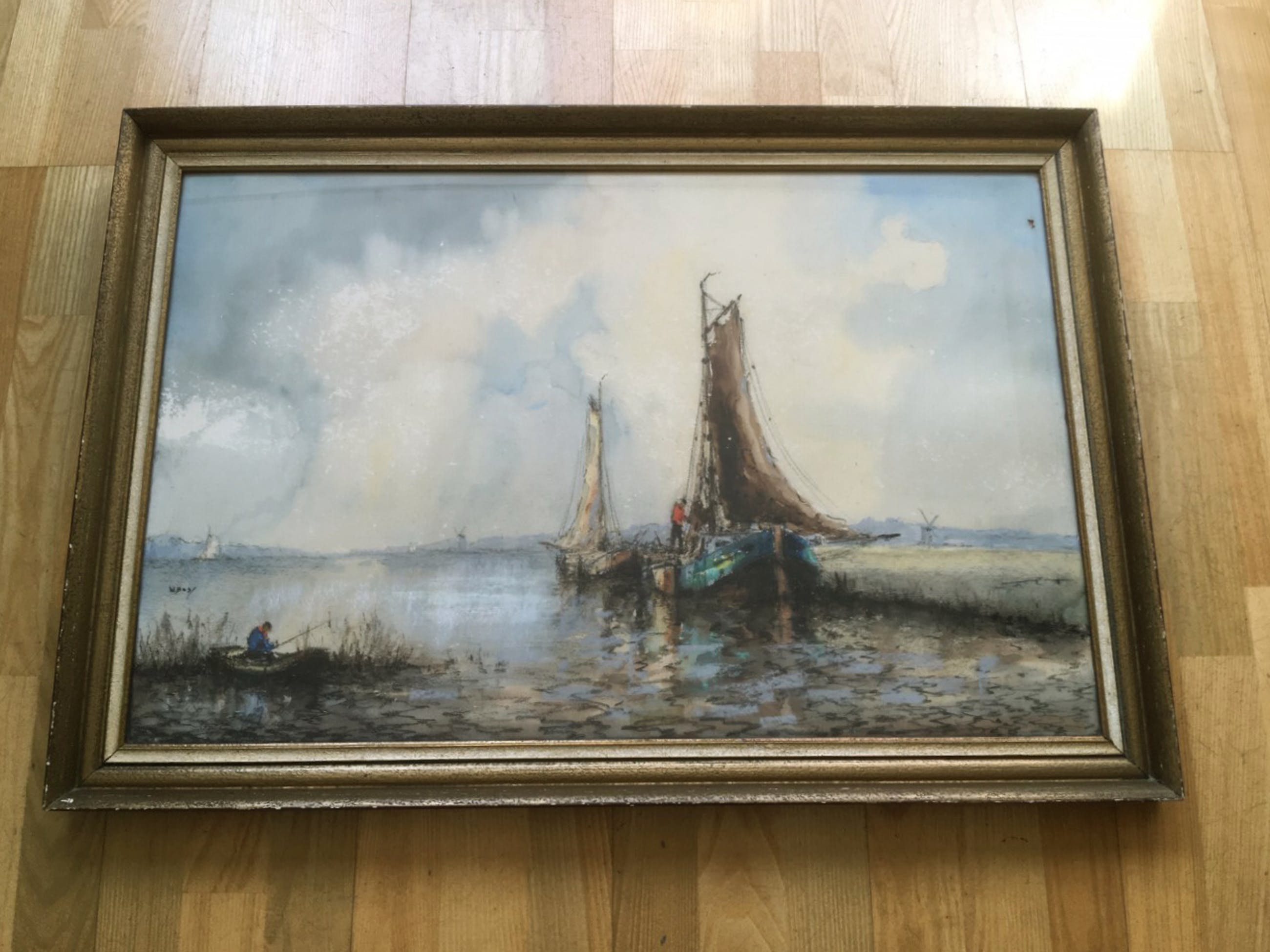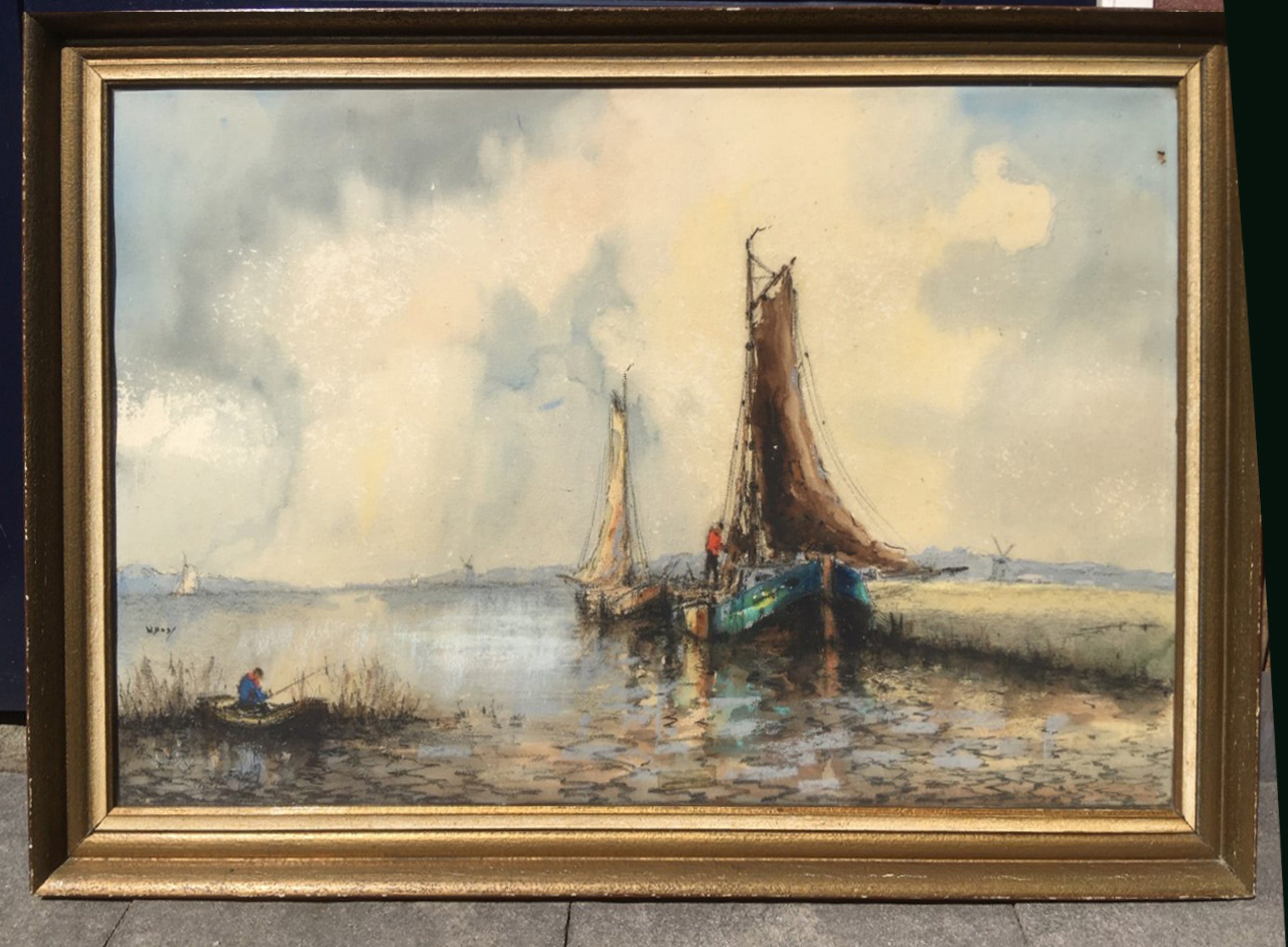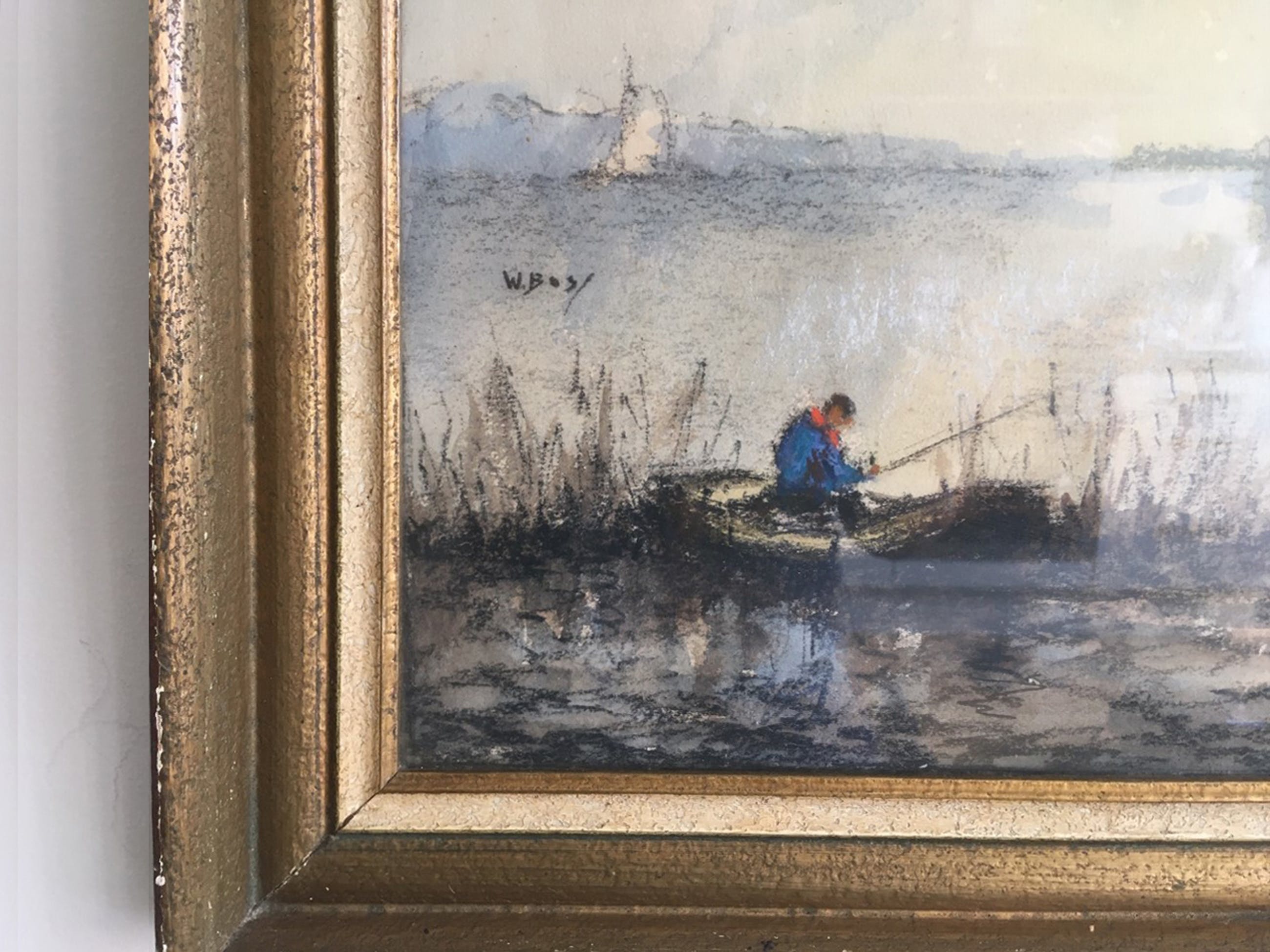 Willem Bos: Aquarel van poldergezicht met boten, over houtskool geschilderd en opgehoogd met krijt. In vergulde houten lijst. Formaat incl. 58 x 84 cm. Links hand gesigneerd: W.Bos/ Ca. 1950/1960. Rechts boven in de hoek zit een klein gaatje in het papier. Lichte plekjes links in de luchtpartij waarvan ik niet kan vaststellen of dit bewust des kunstenaars techniek is (bv via arabische gom tot stand gekomen) of dat dit tijdsporen in het papier betreft. (zie 2 laatste foto's). De houten lijst kent wat gebruikssporen. (het kunstwerk dient in Venlo opgehaald te worden)