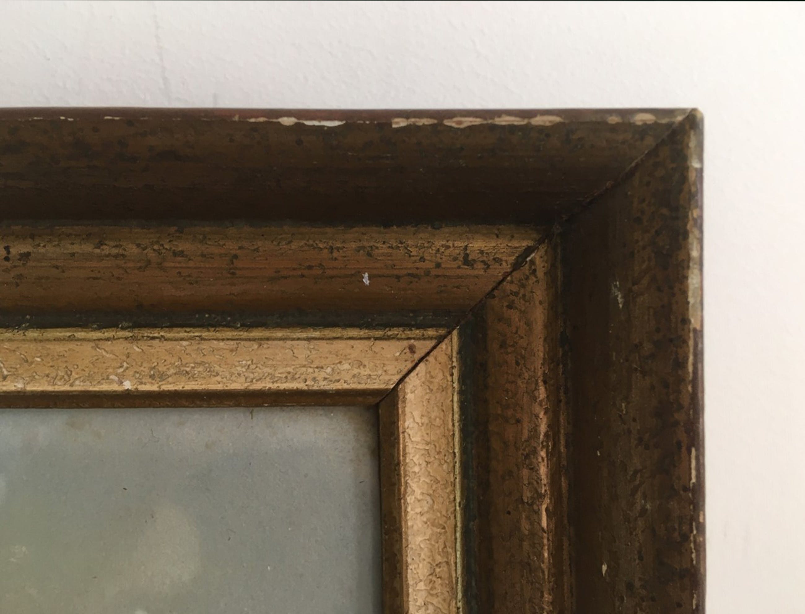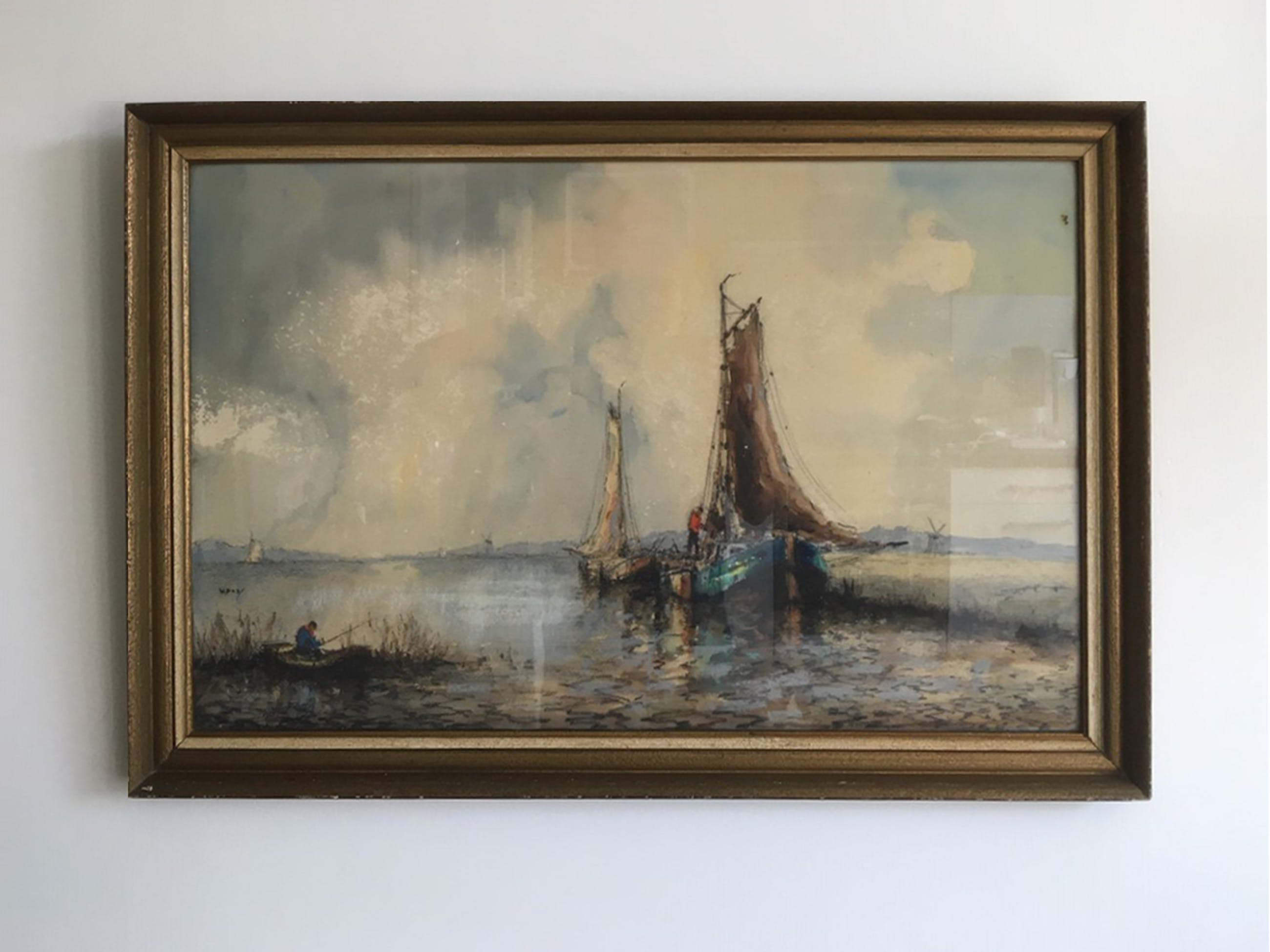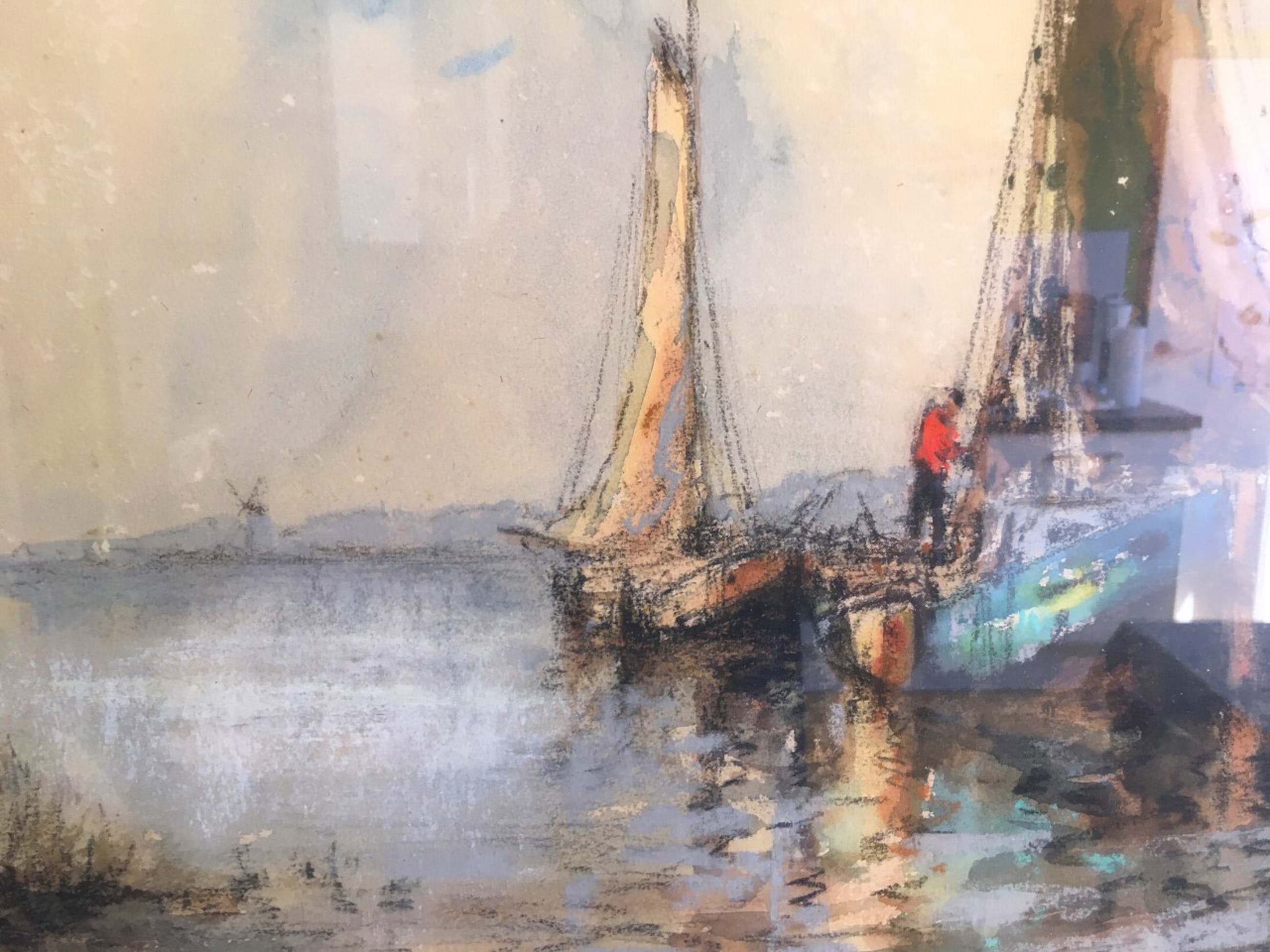 Willem Bos: Aquarel van poldergezicht met boten, over houtskool geschilderd en opgehoogd met krijt. In vergulde houten lijst. Formaat incl. 58 x 84 cm. Links hand gesigneerd: W.Bos/ Ca. 1950/1960. Rechts boven in de hoek zit een klein gaatje in het papier. Lichte plekjes links in de luchtpartij waarvan ik niet kan vaststellen of dit bewust des kunstenaars techniek is (bv via arabische gom tot stand gekomen) of dat dit tijdsporen in het papier betreft. (zie 2 laatste foto's). De houten lijst kent wat gebruikssporen. (het kunstwerk dient in Venlo opgehaald te worden)