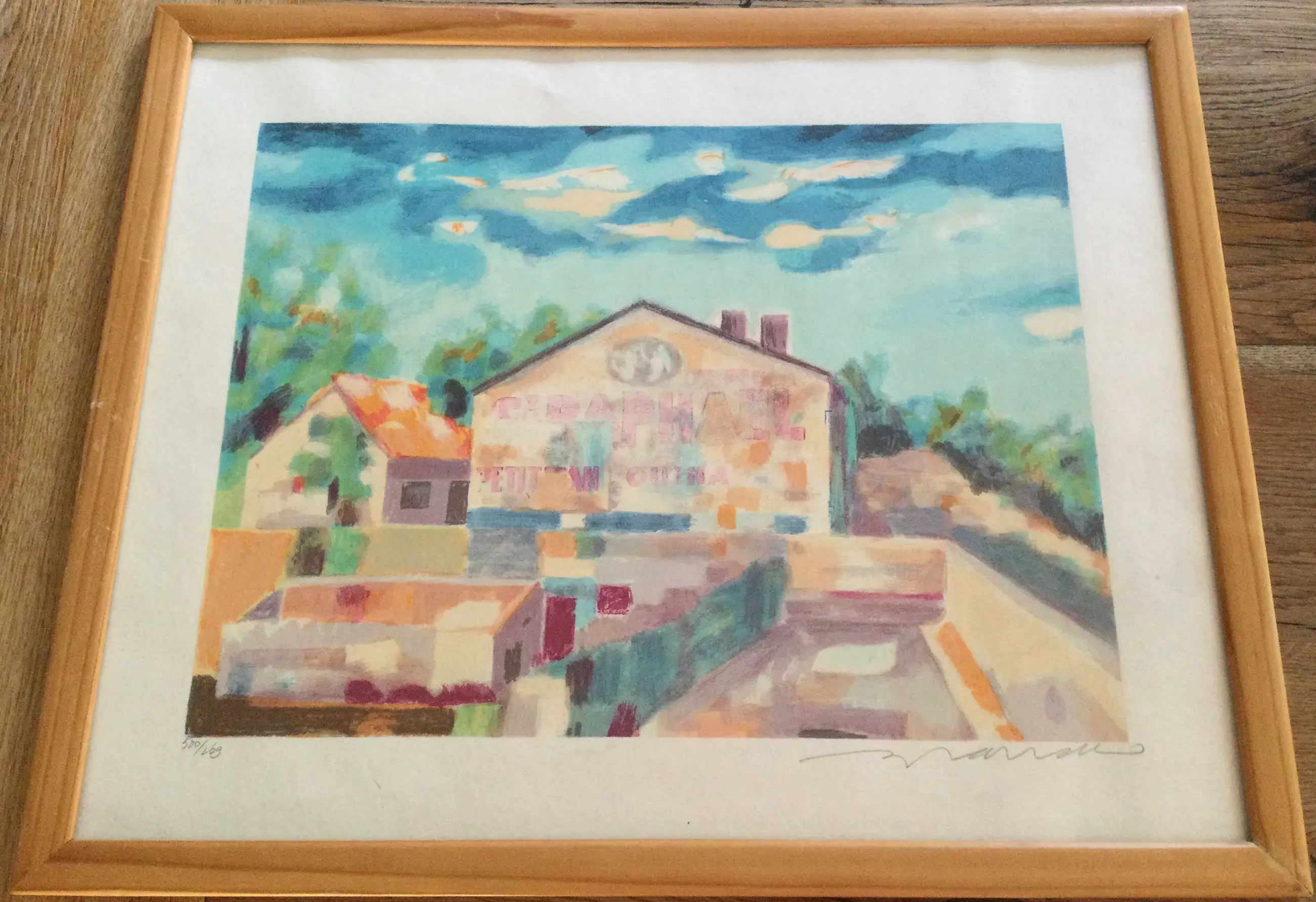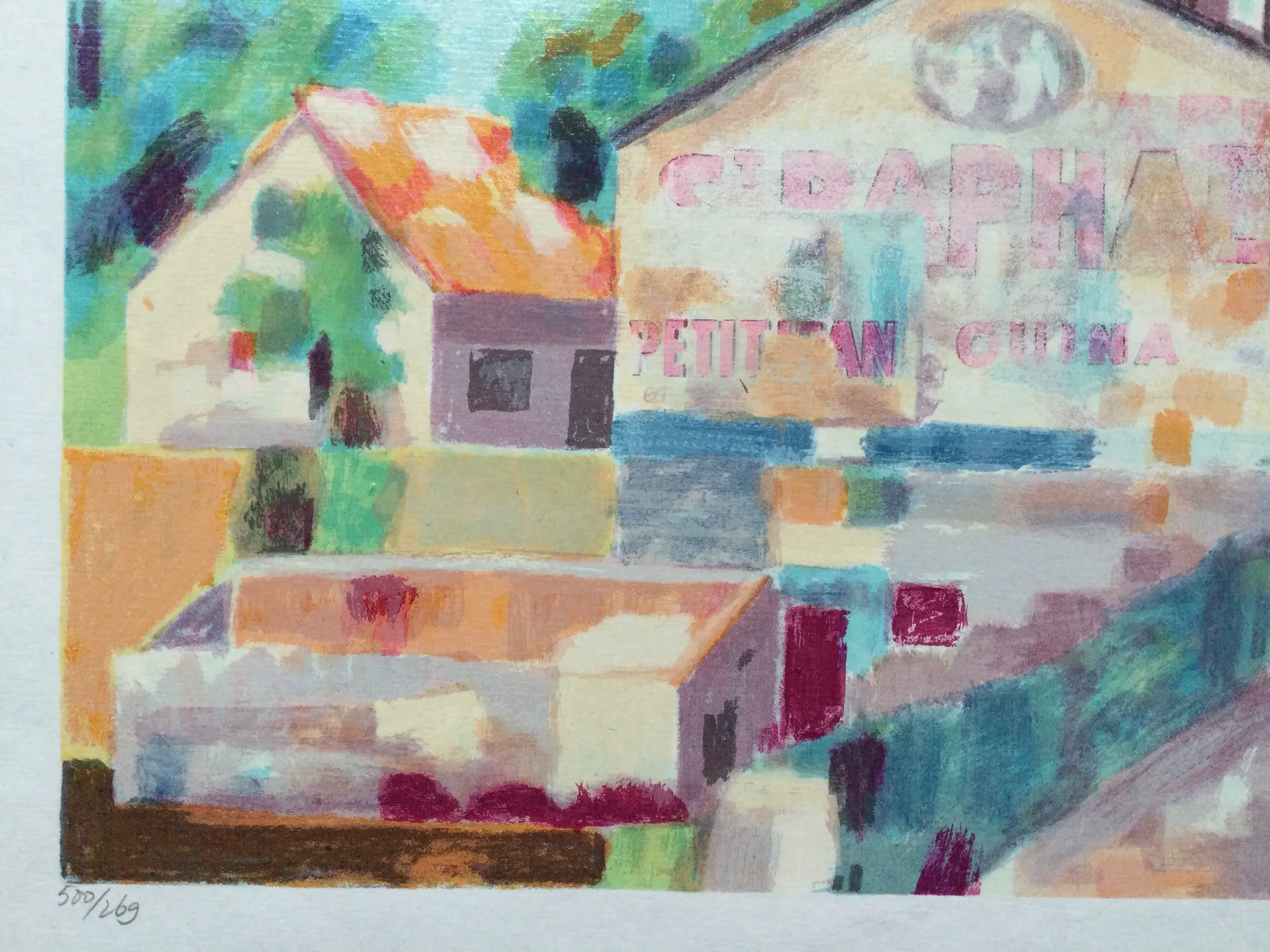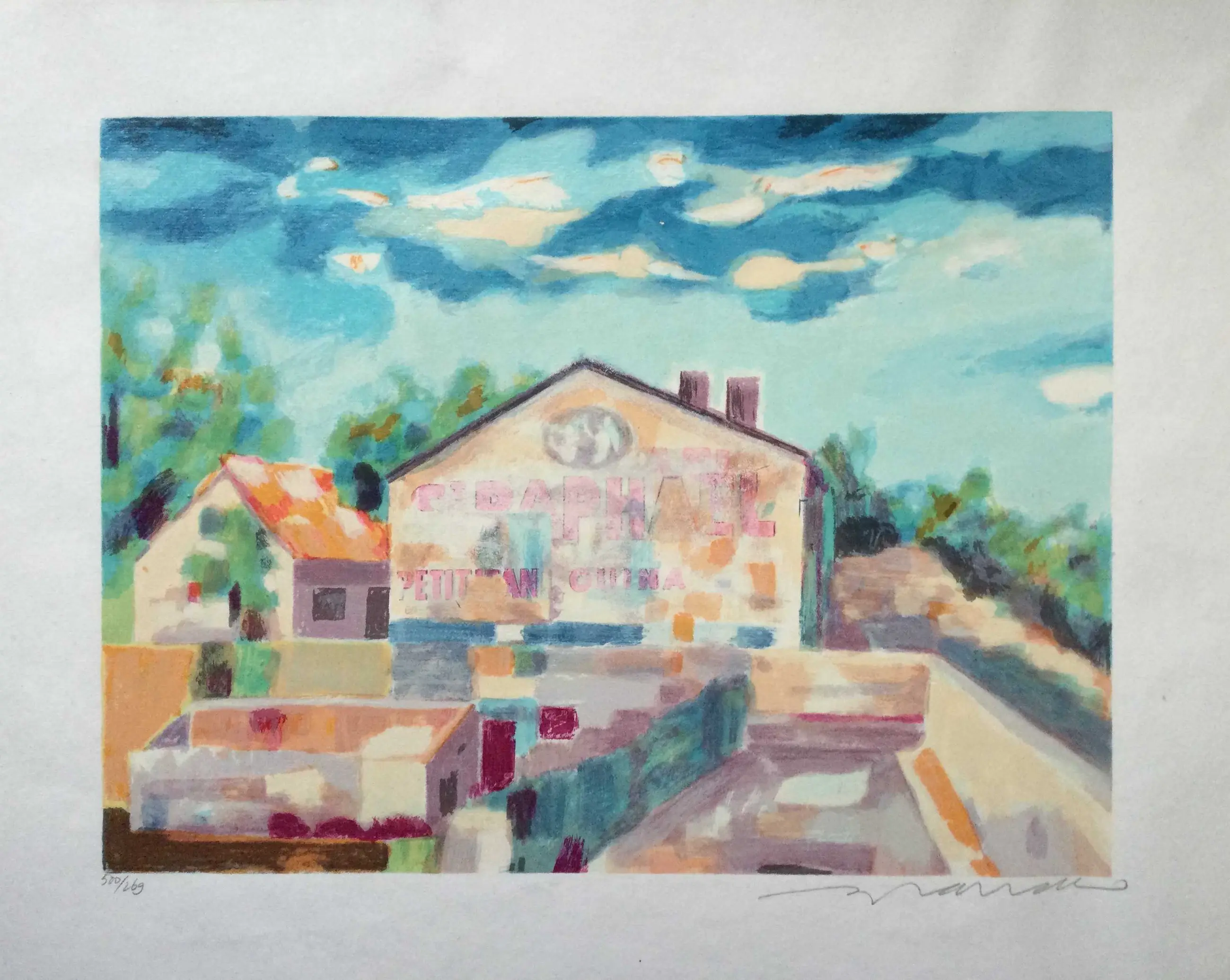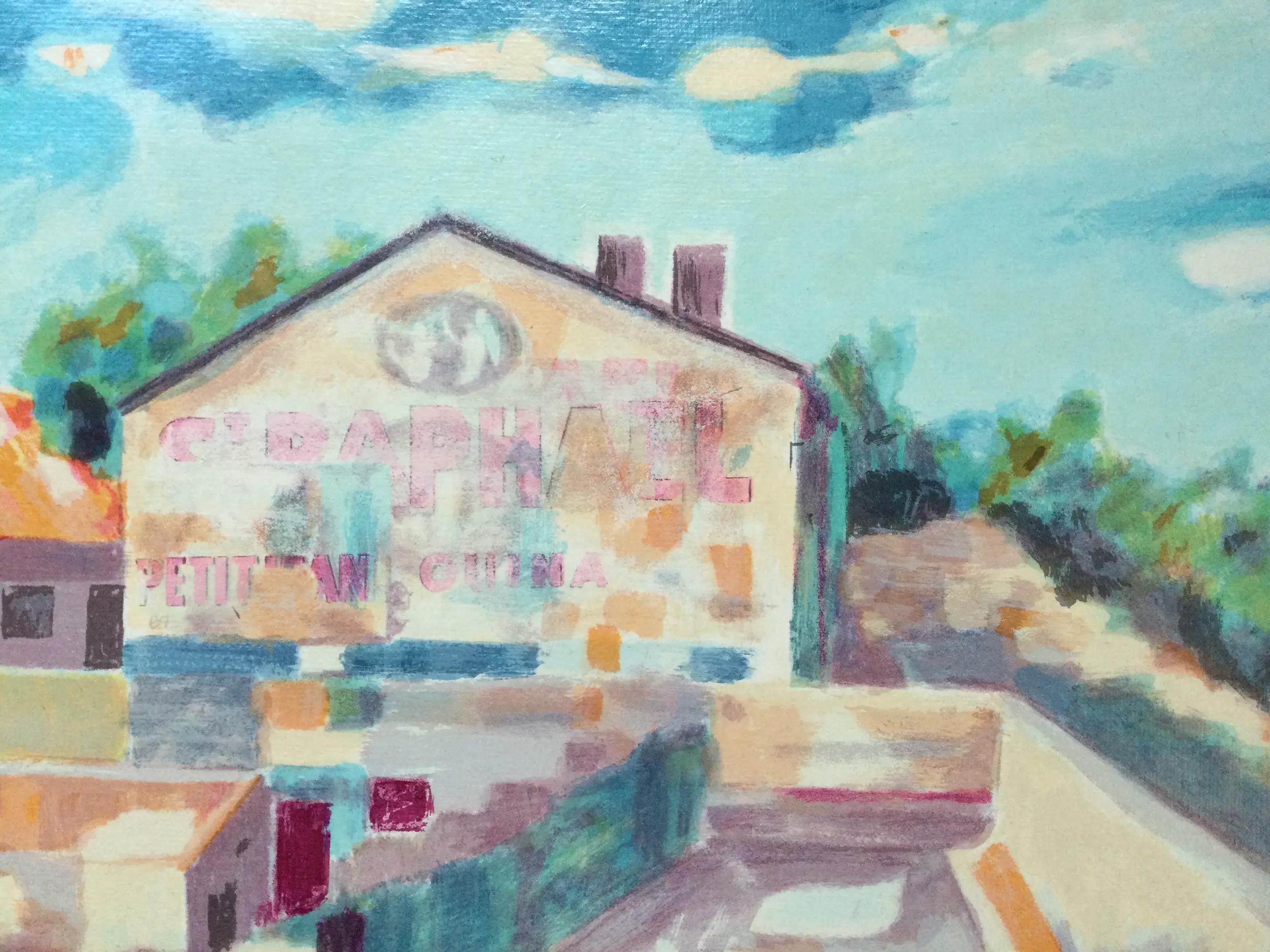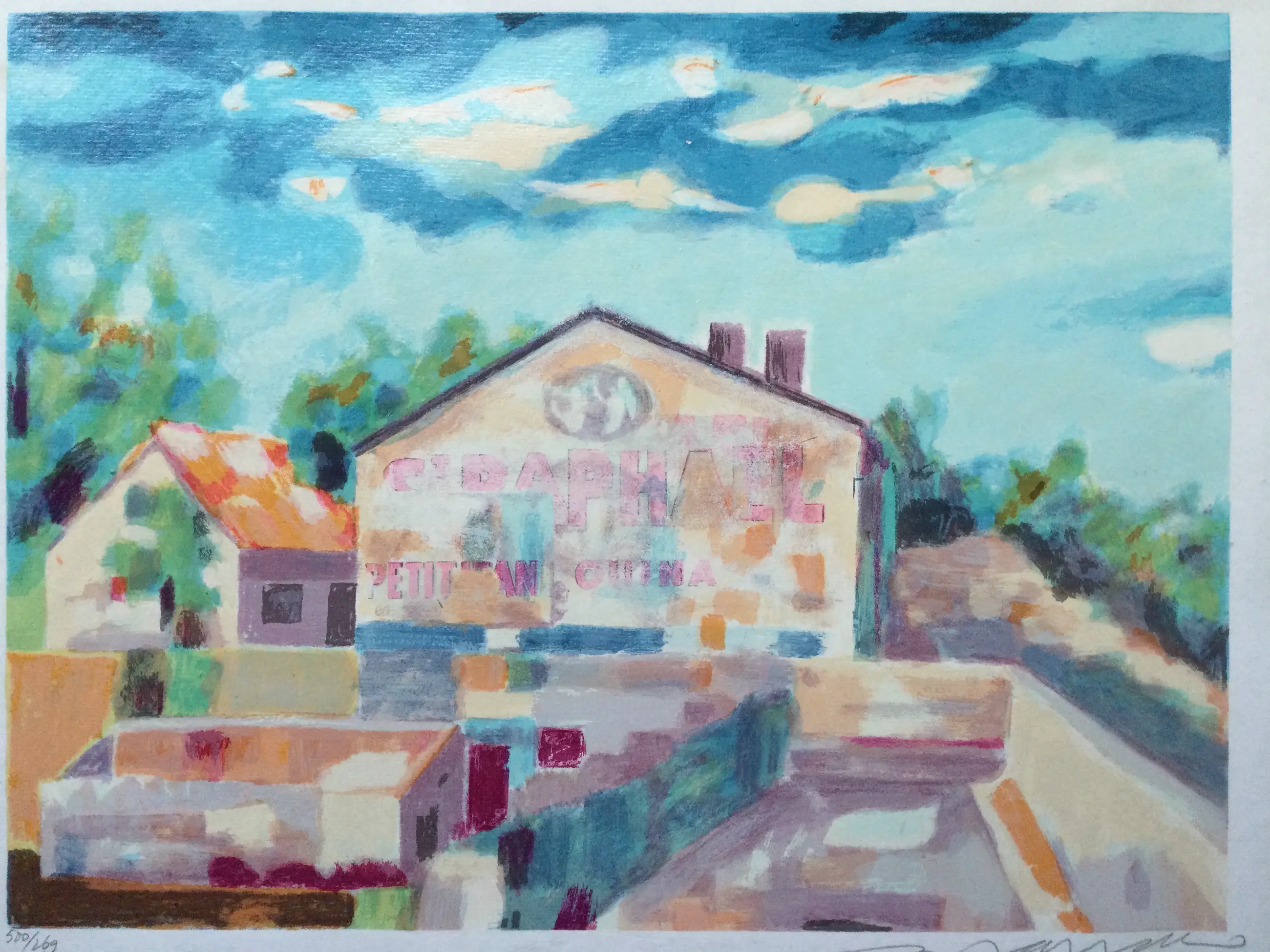 De warme kleuren van deze zeefdruk lijken welhaast geschilderd, het draagt de titel 'St. Raphael' en maakt deel uit van een serie waarmee Brauck in Frankrijk (oude) werkplaatsen, garages en brandstof tankstations vastlegt.