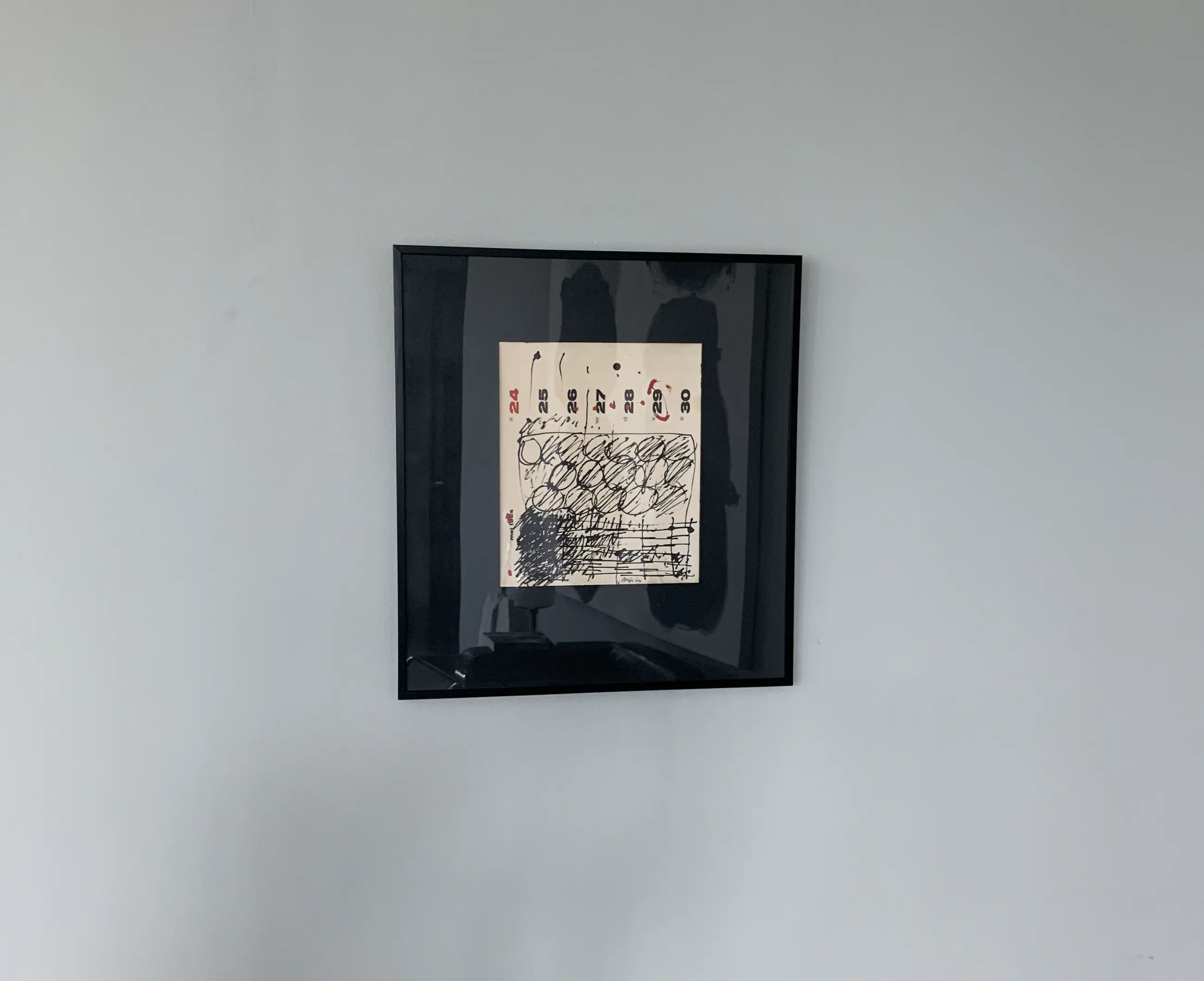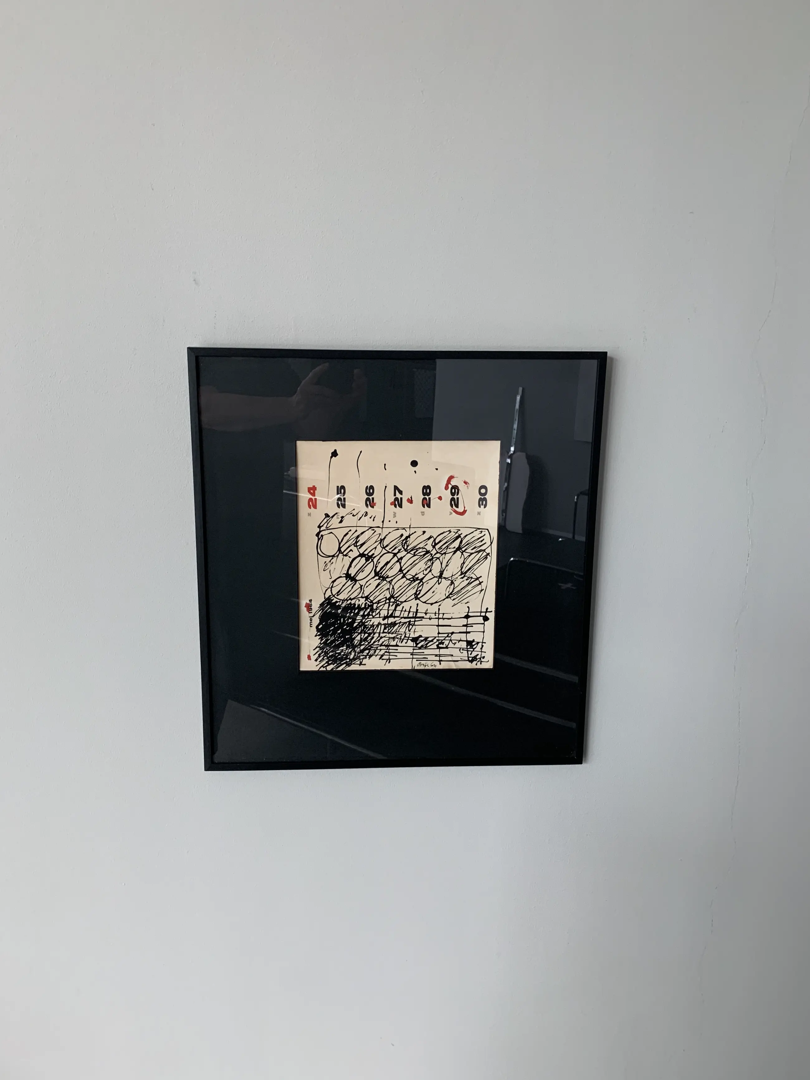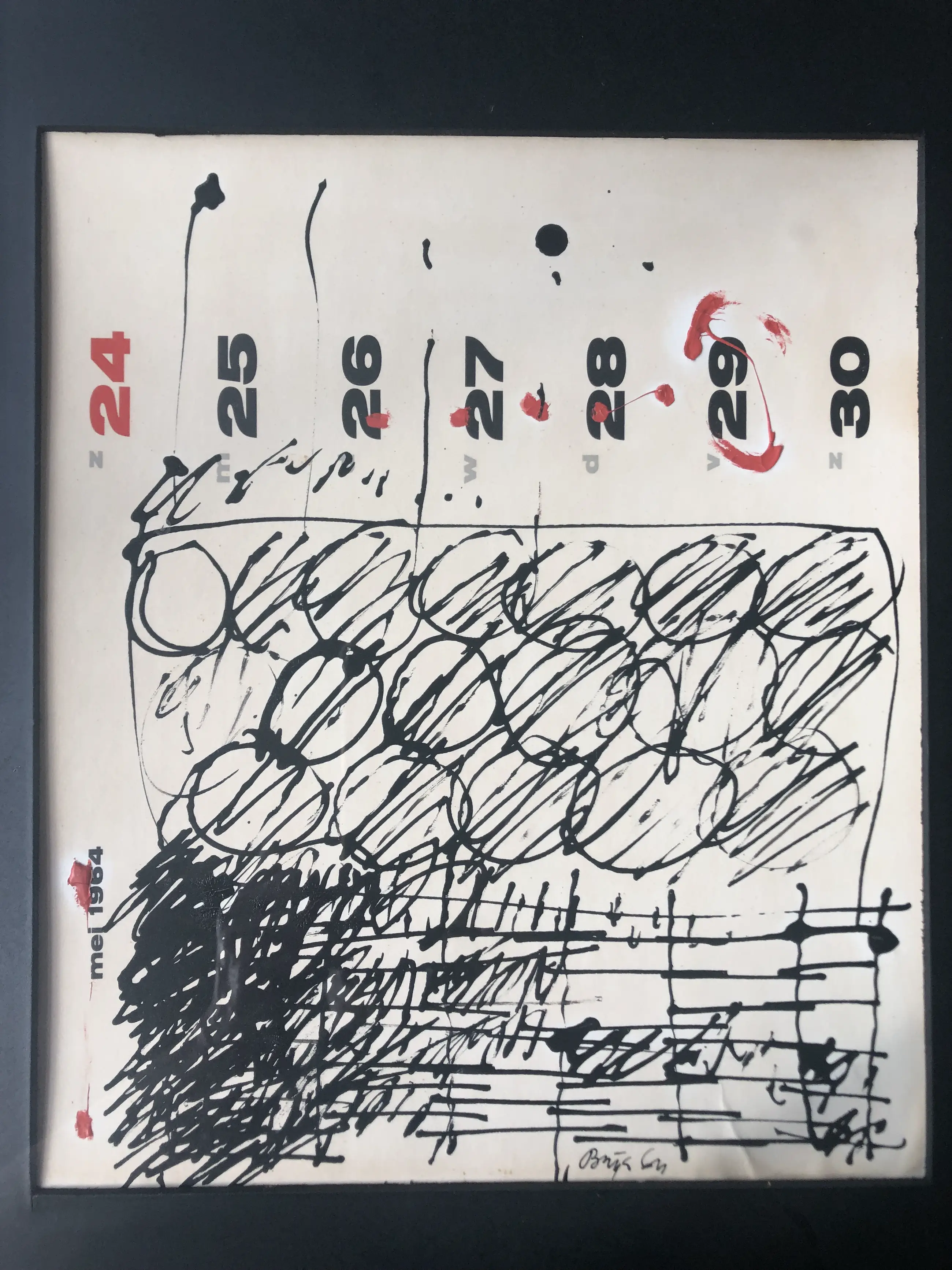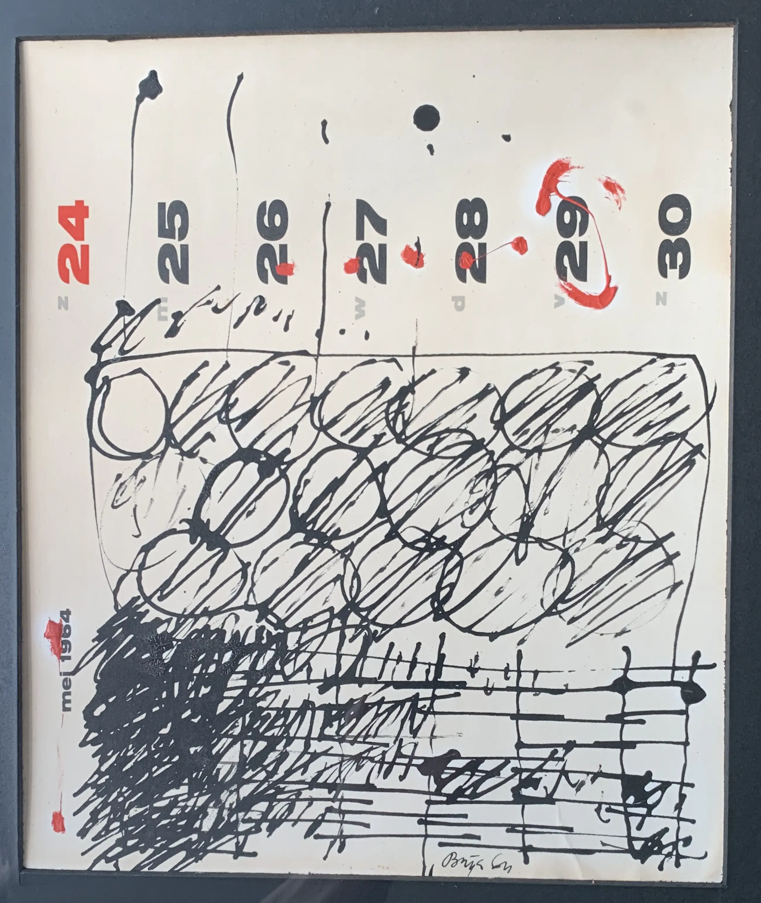 Aangeboden wordt een origineel werk van Willem Buijs, echtgenoot van fotograaf Truus van den Boezem (= zus van Marinus Boezem). Het is een abstracte tekening met rode en zwarte inkt op een wit bedrukt kalenderblad van mei 1964. Het werk zit in een zwarte passepartout en is ingelijst in een zwarte lijst. Het verkeert in uitstekende staat.