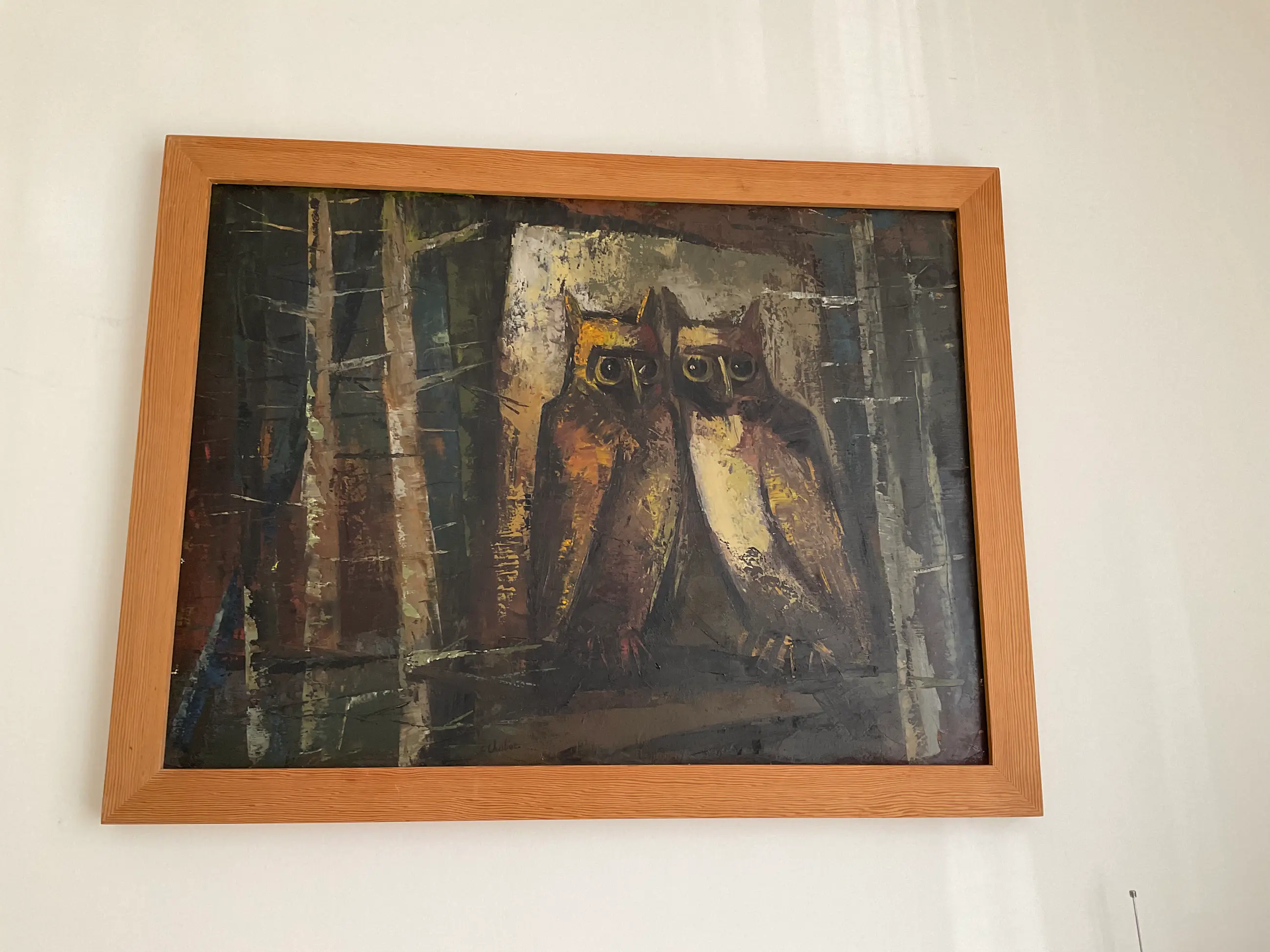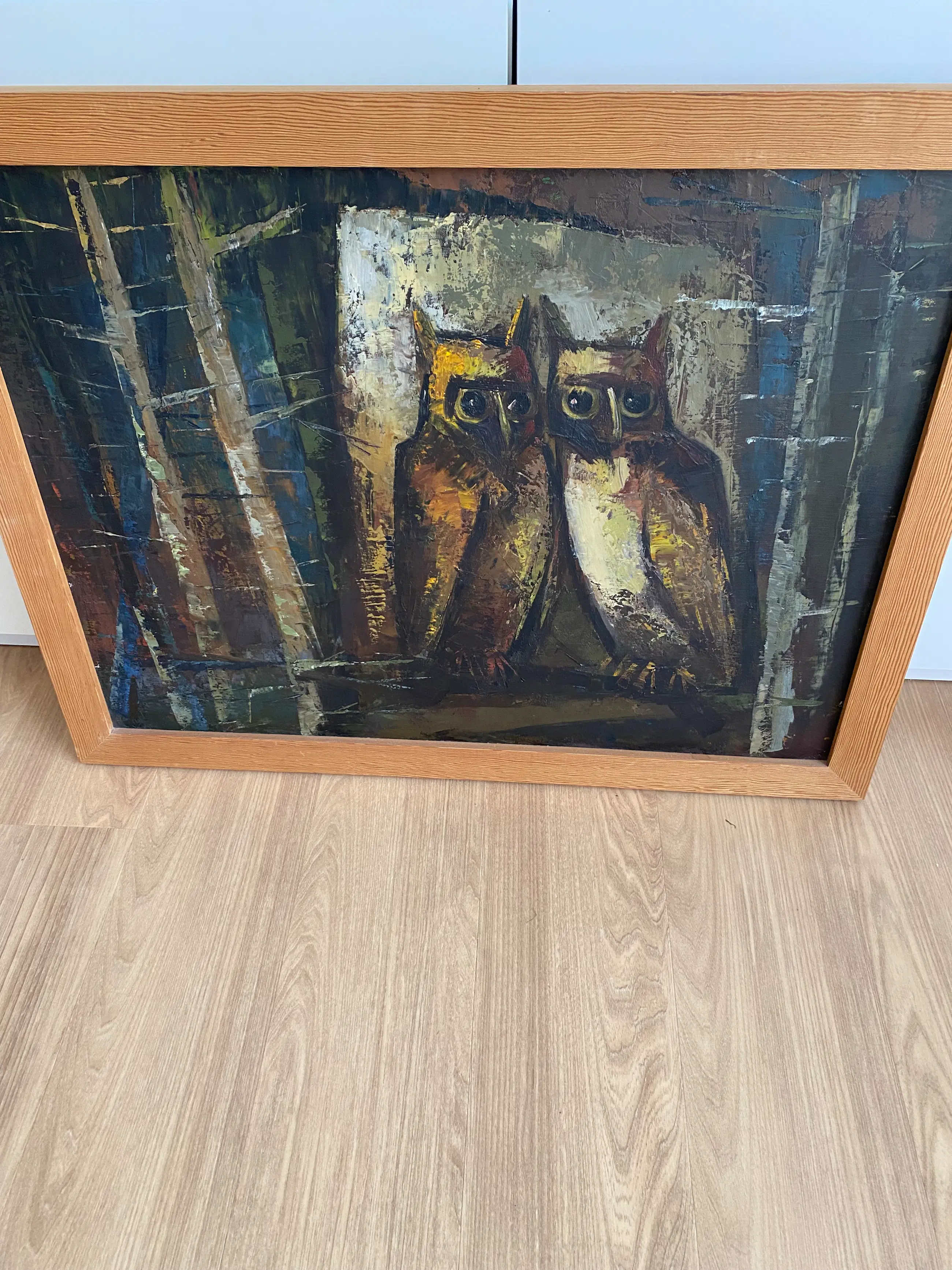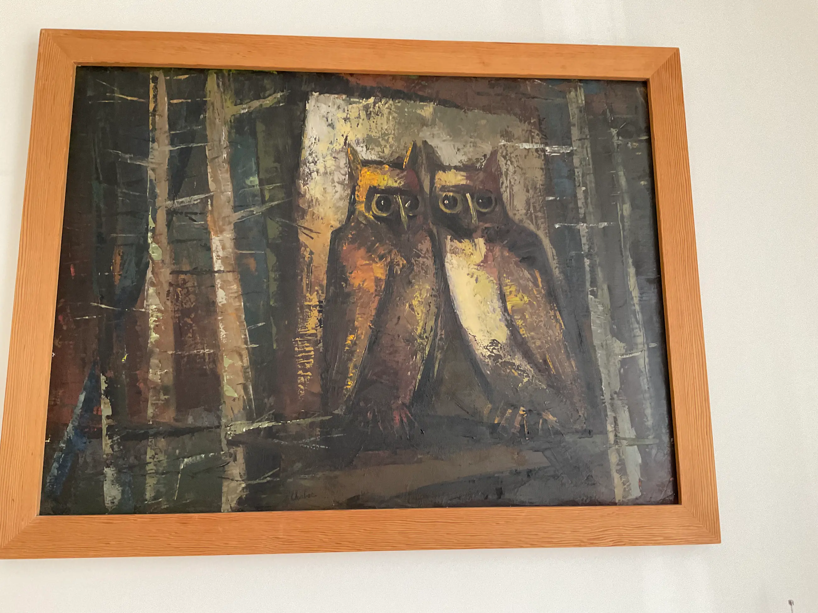 Een mooi stukje werk van Willem Chabot Rustende uilen Mooi ingelijst in een houten eiken lijst De hoogte is 68 cm Breed 86 cm Het schilderij is in mooie staat
