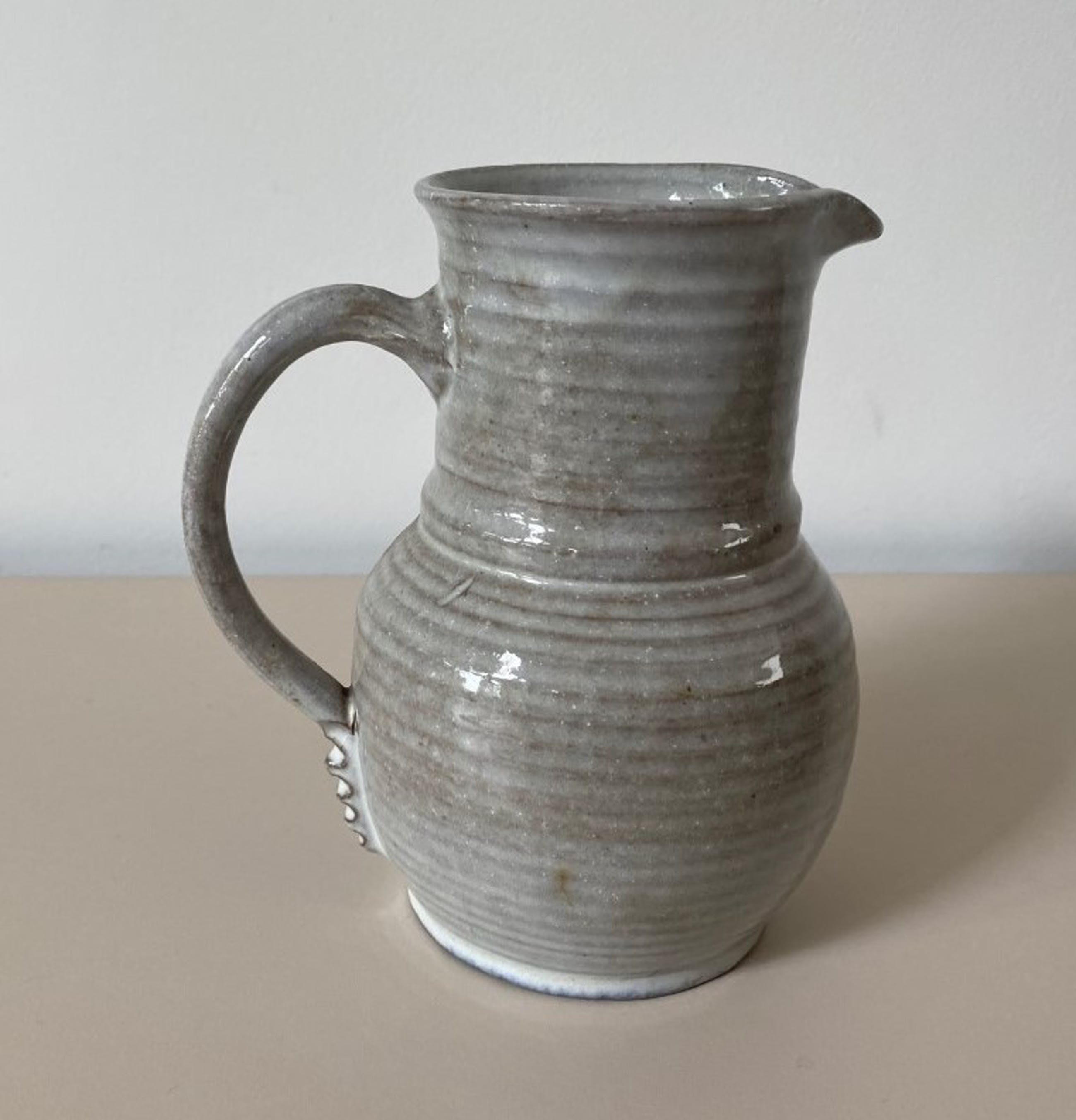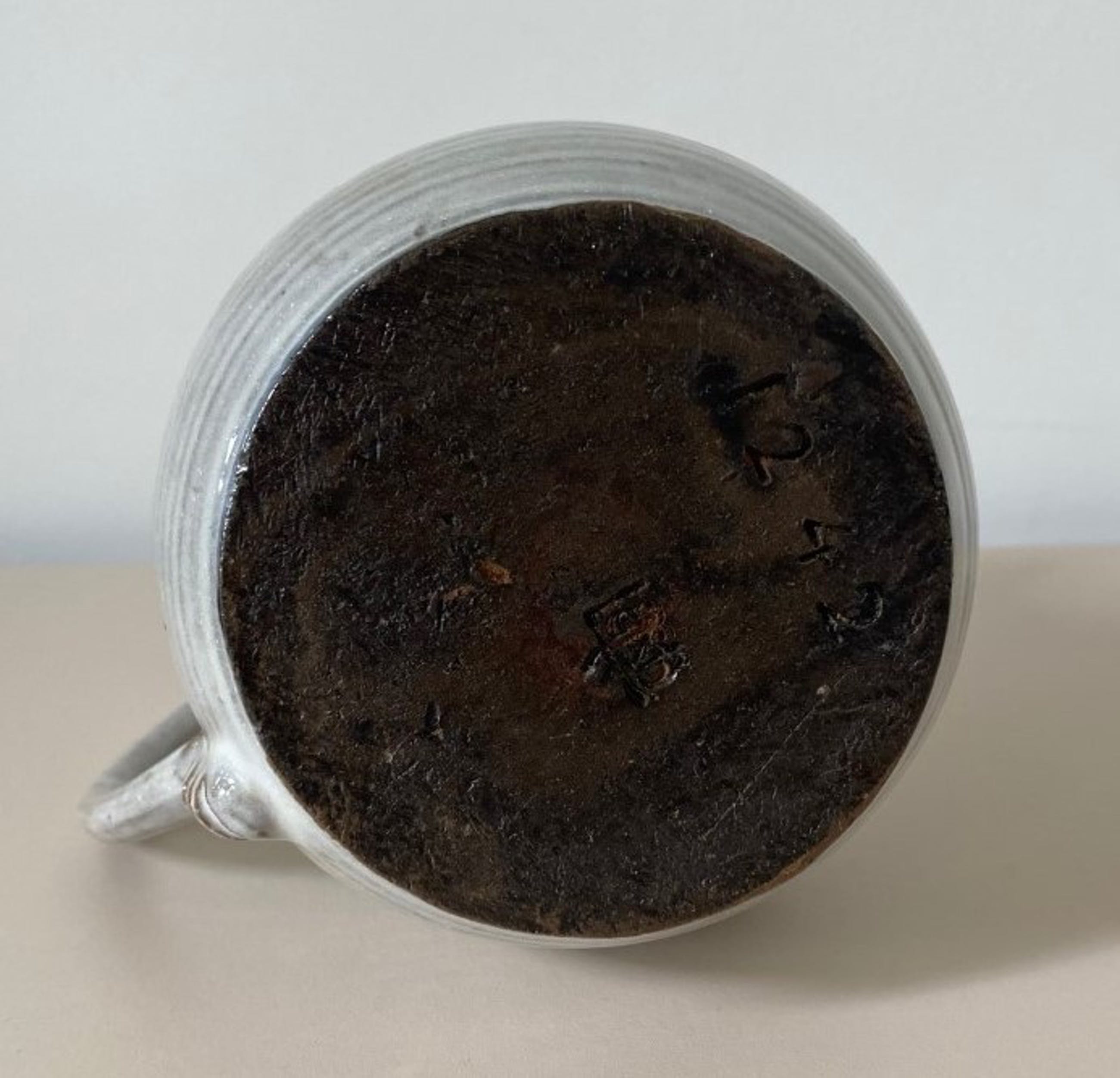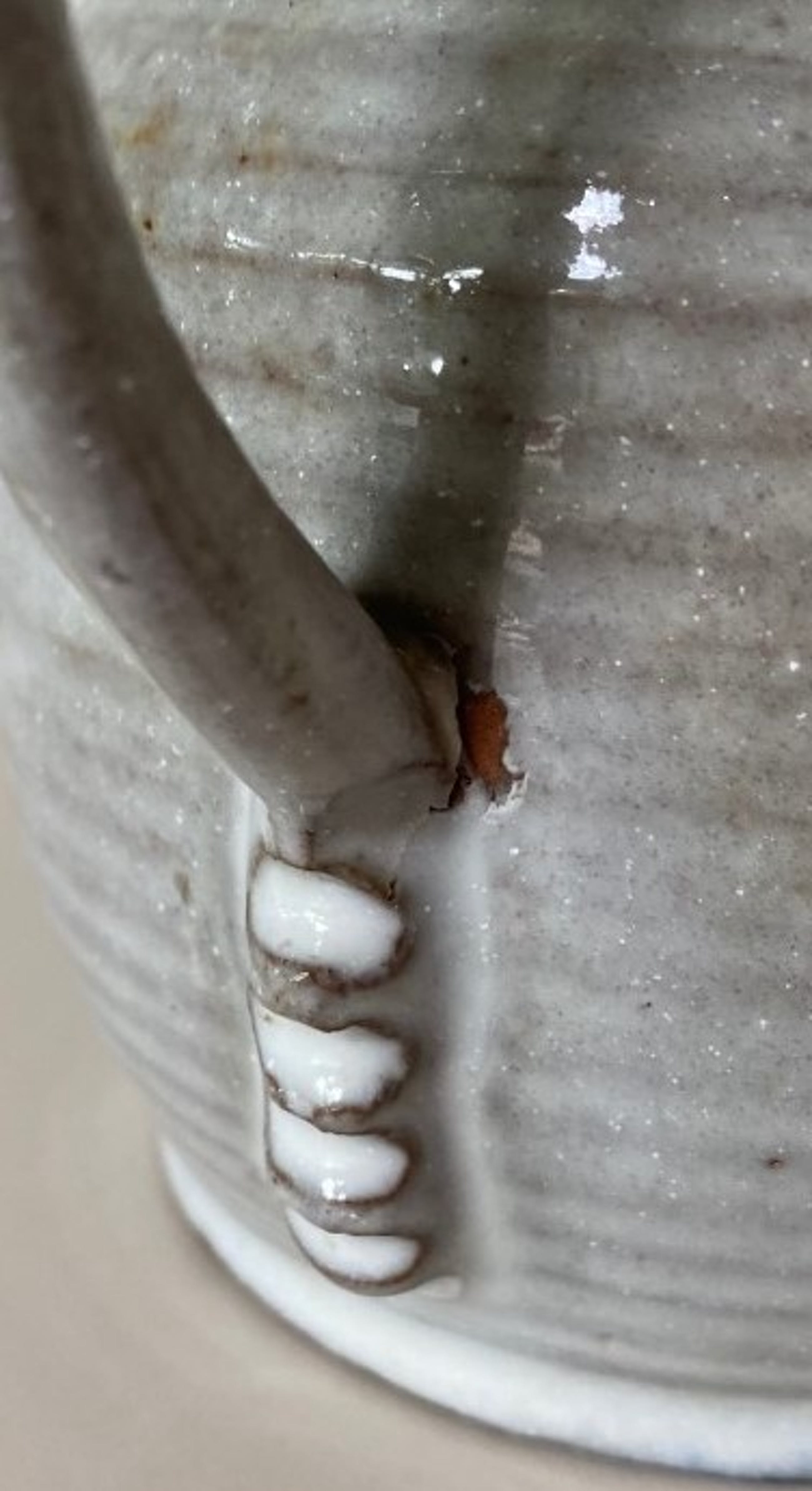 De kan heeft aan de achterzijde bij het handvat een chipje en een flinter aan de onderzijde.