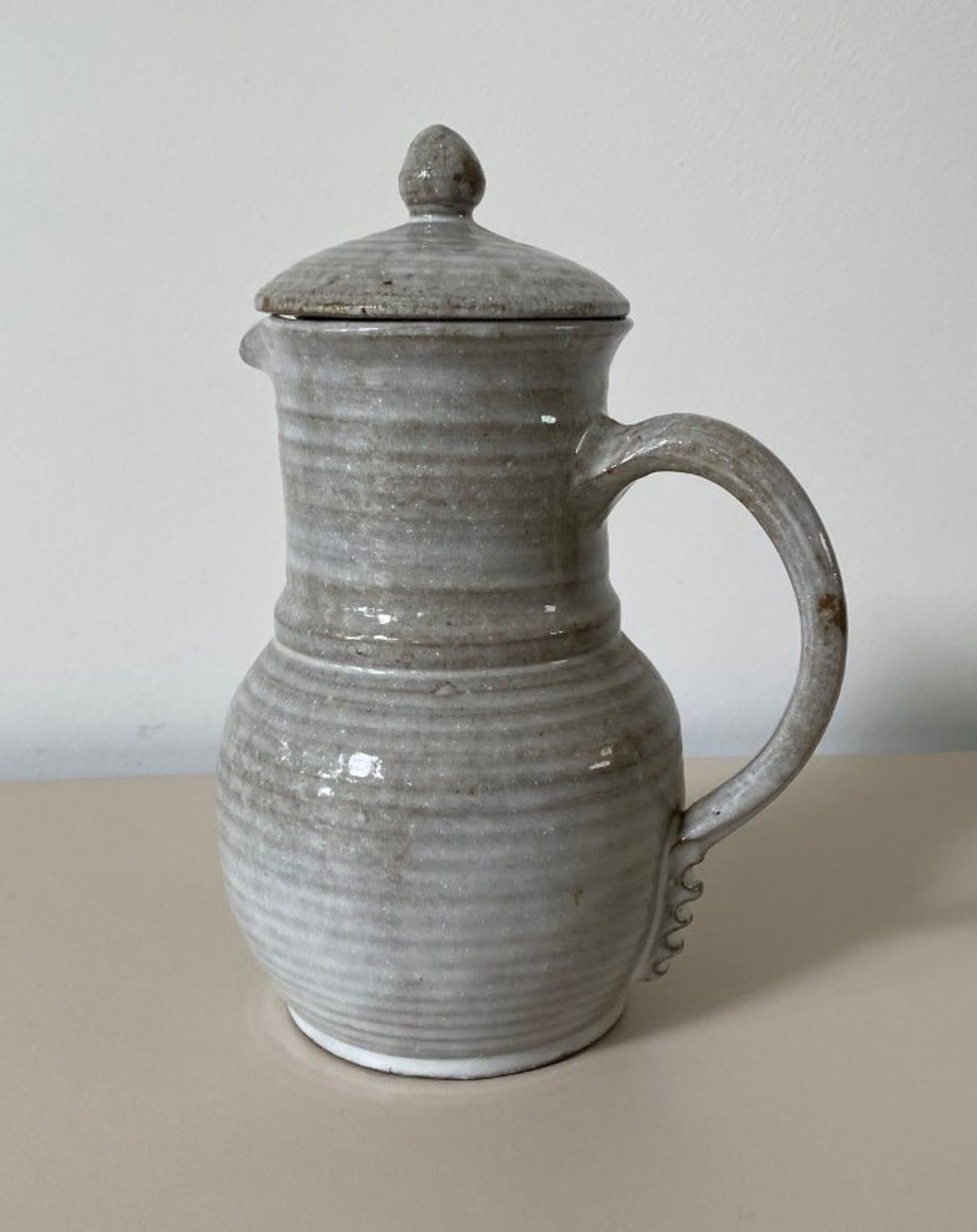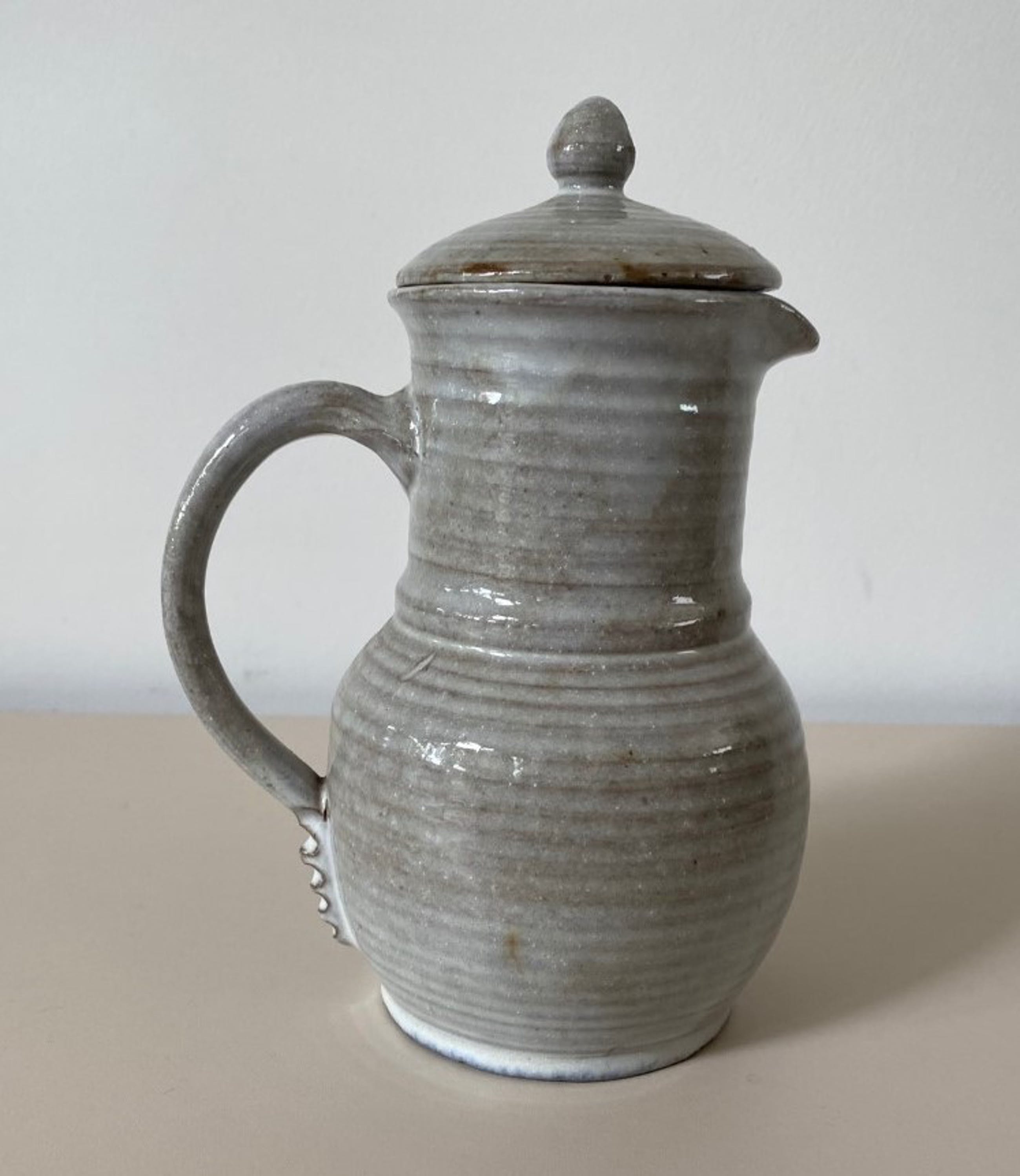 art deco aardewerken chocolade kannetje voorzien witgrijs glazuur van Willem Coenraad Brouwers uitgevoerd in eigen atelier. Voorzien van monogram en modelnummer aan de onderzijde.