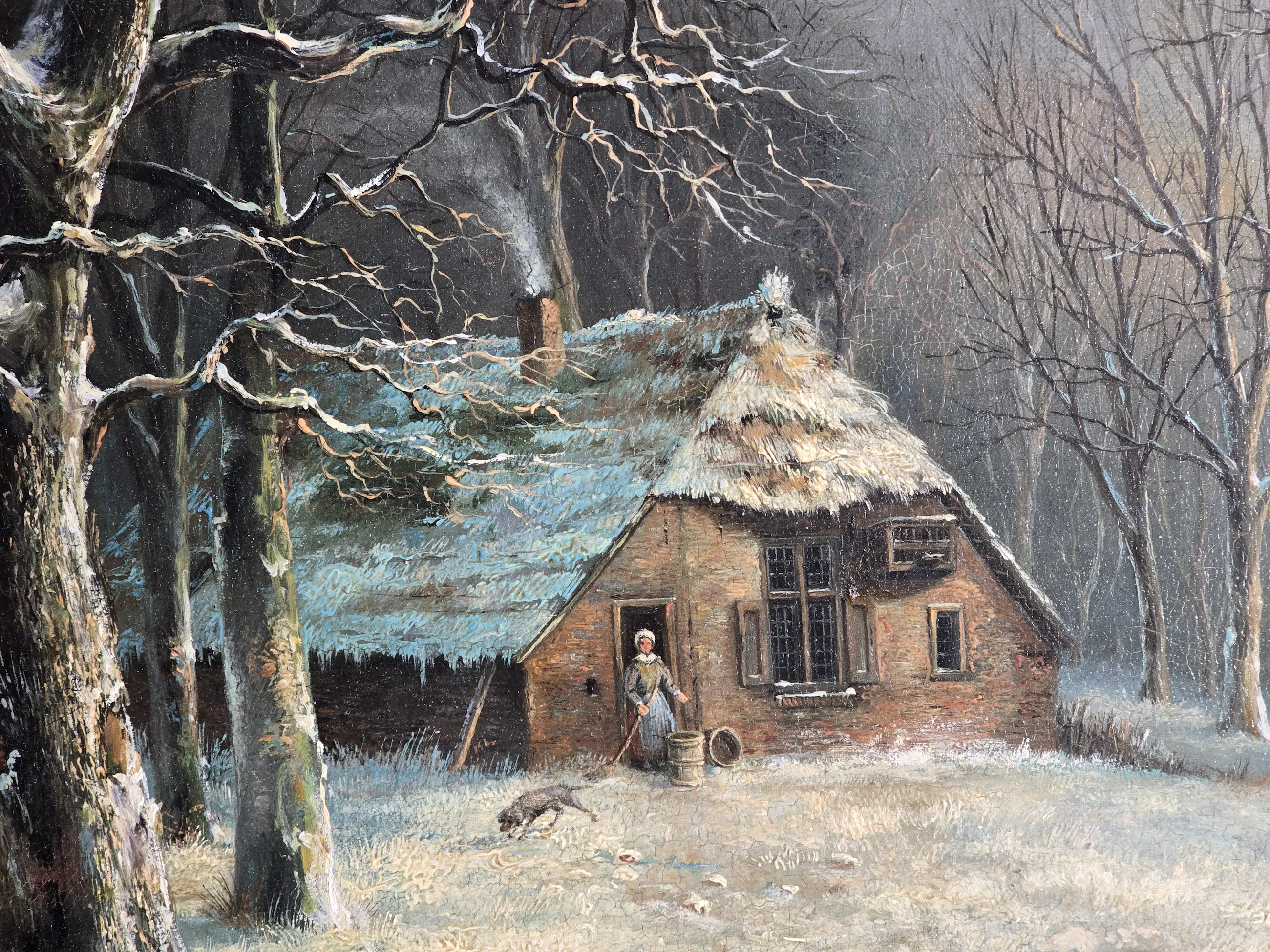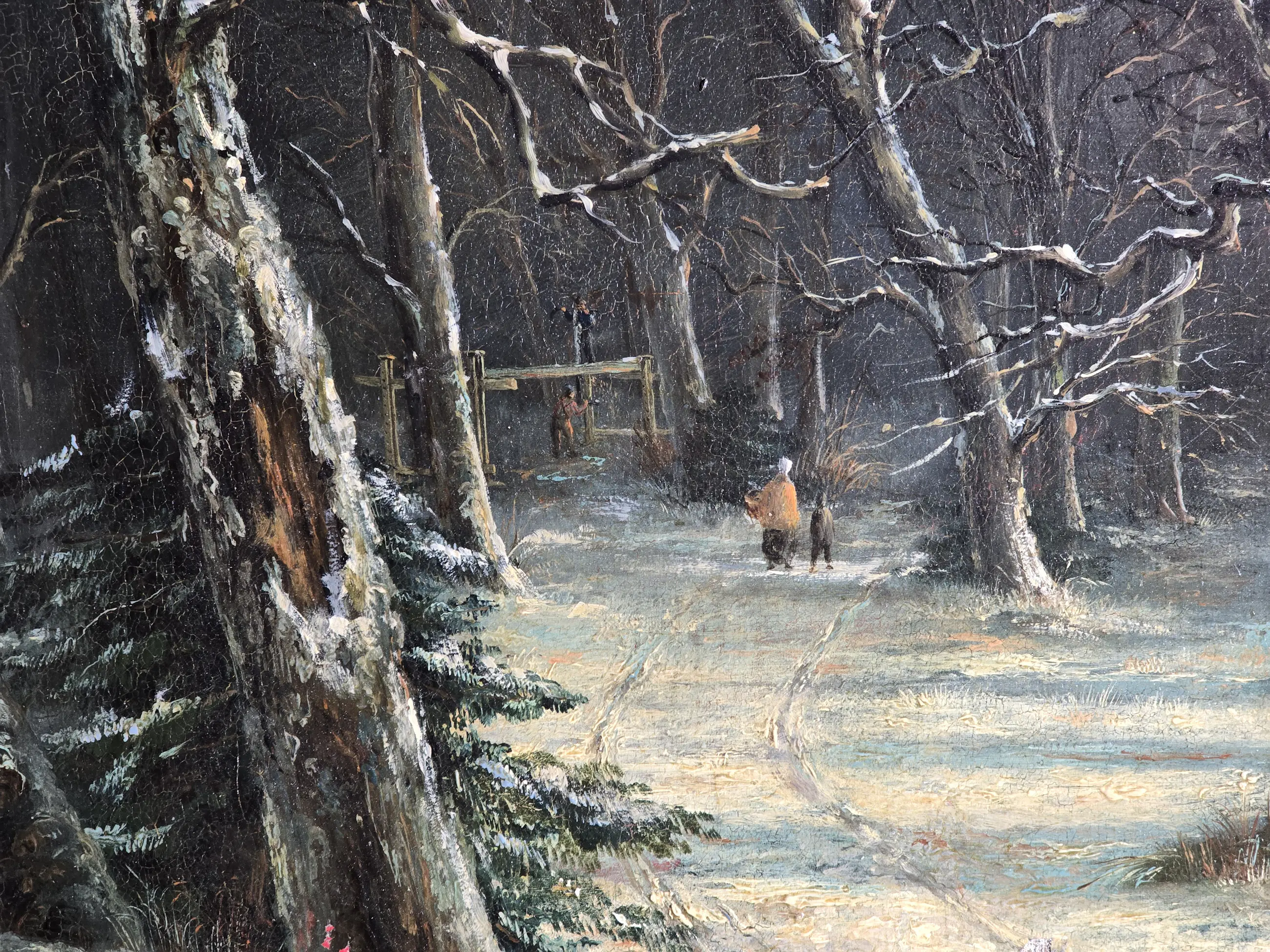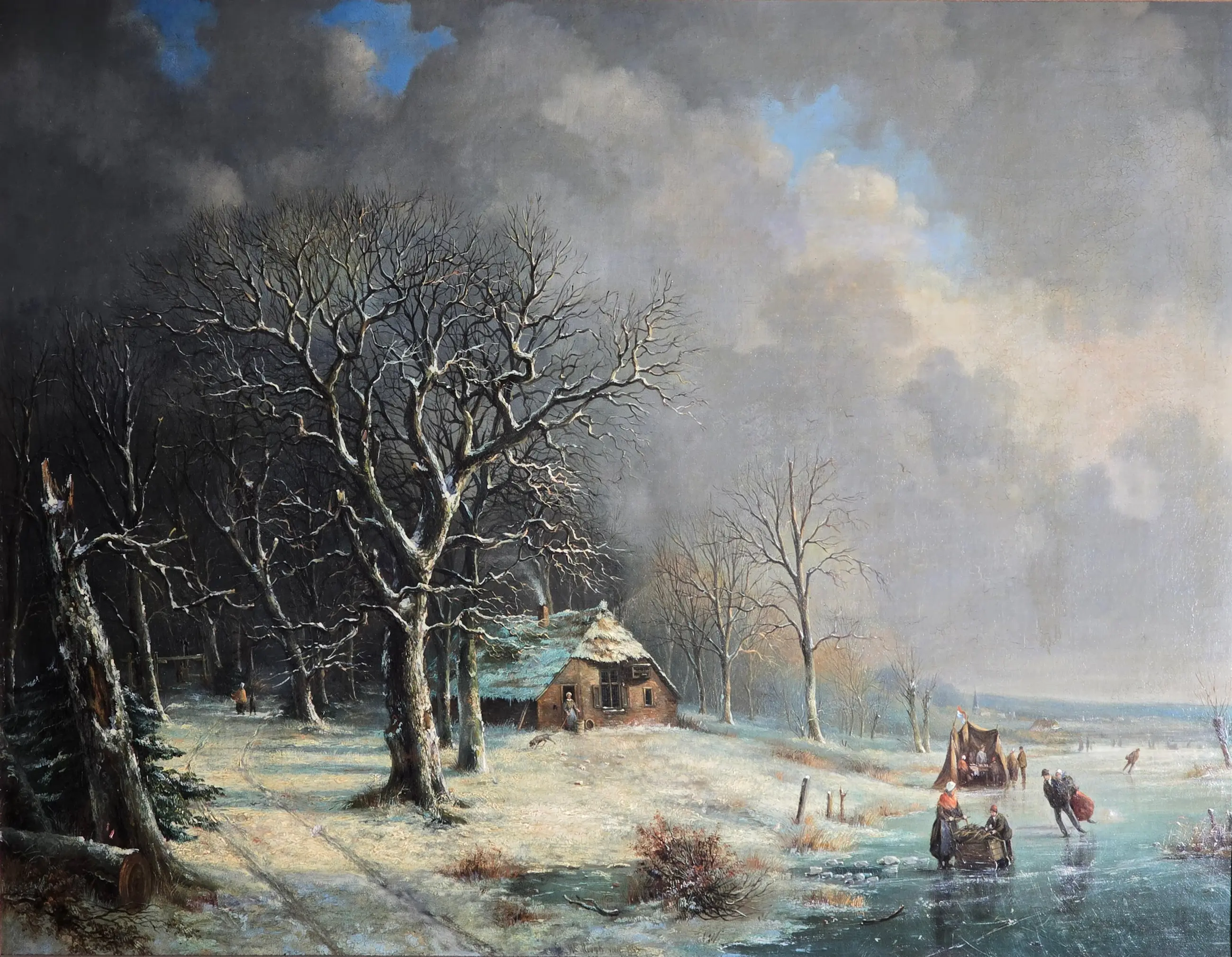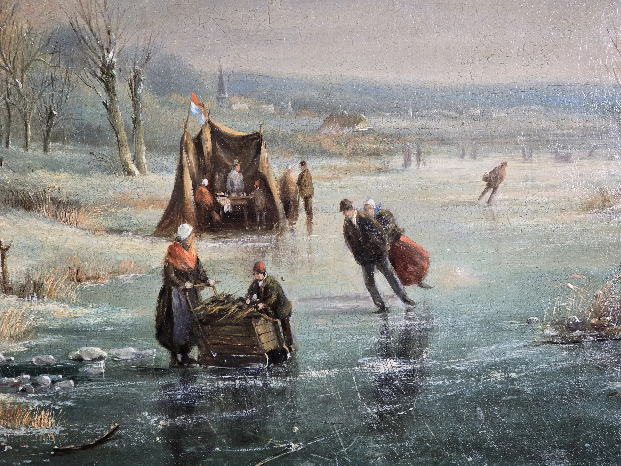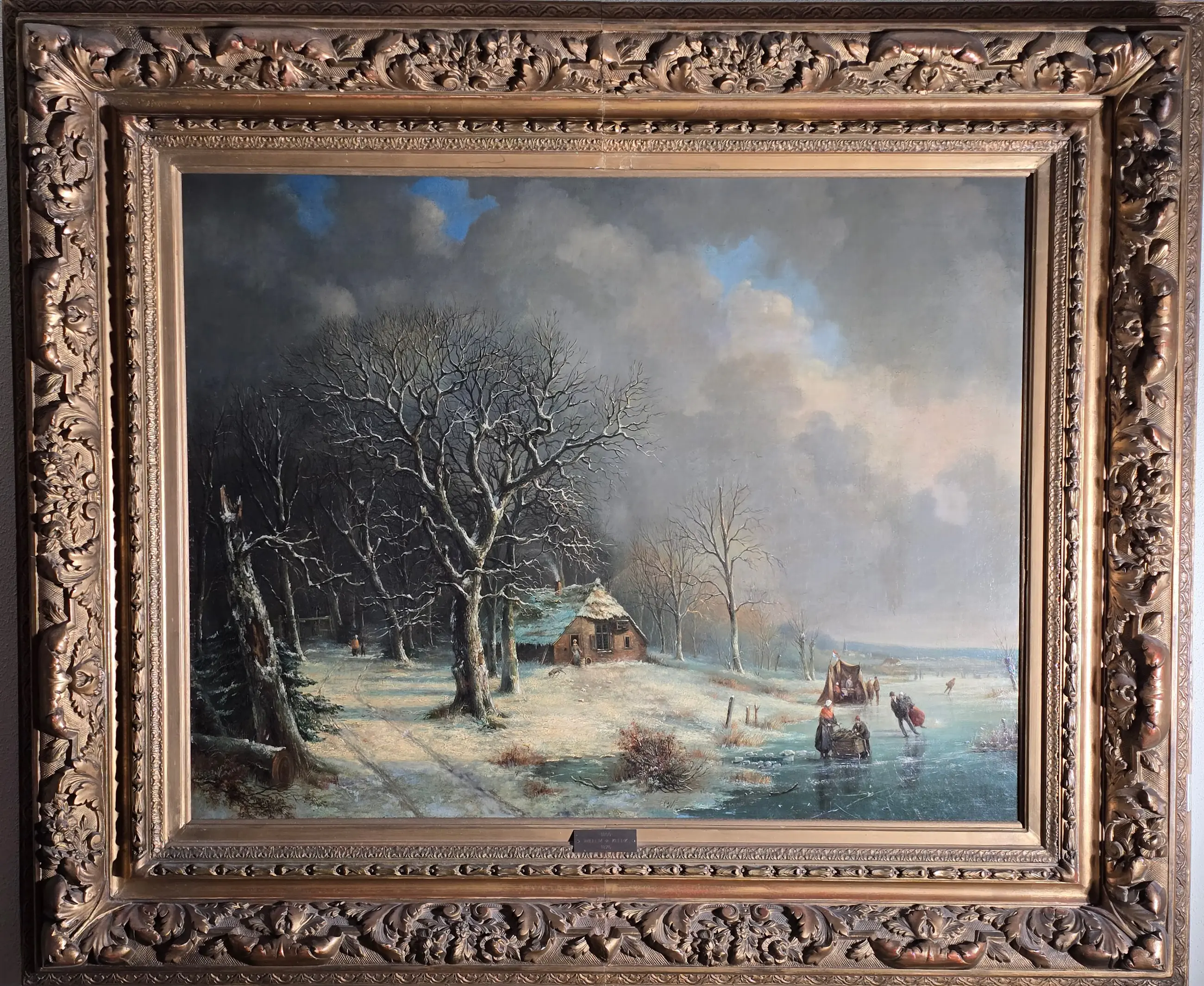 Een groot ijsgezicht van de Dordtse meester Willem de Klerk. Op het schilderij zijn leuke details te zien als een koek en zopie tent en twee mannen in het bos die planken zagen uit een boomstam. Het werk is gesigneerd en gedateerd 1833.