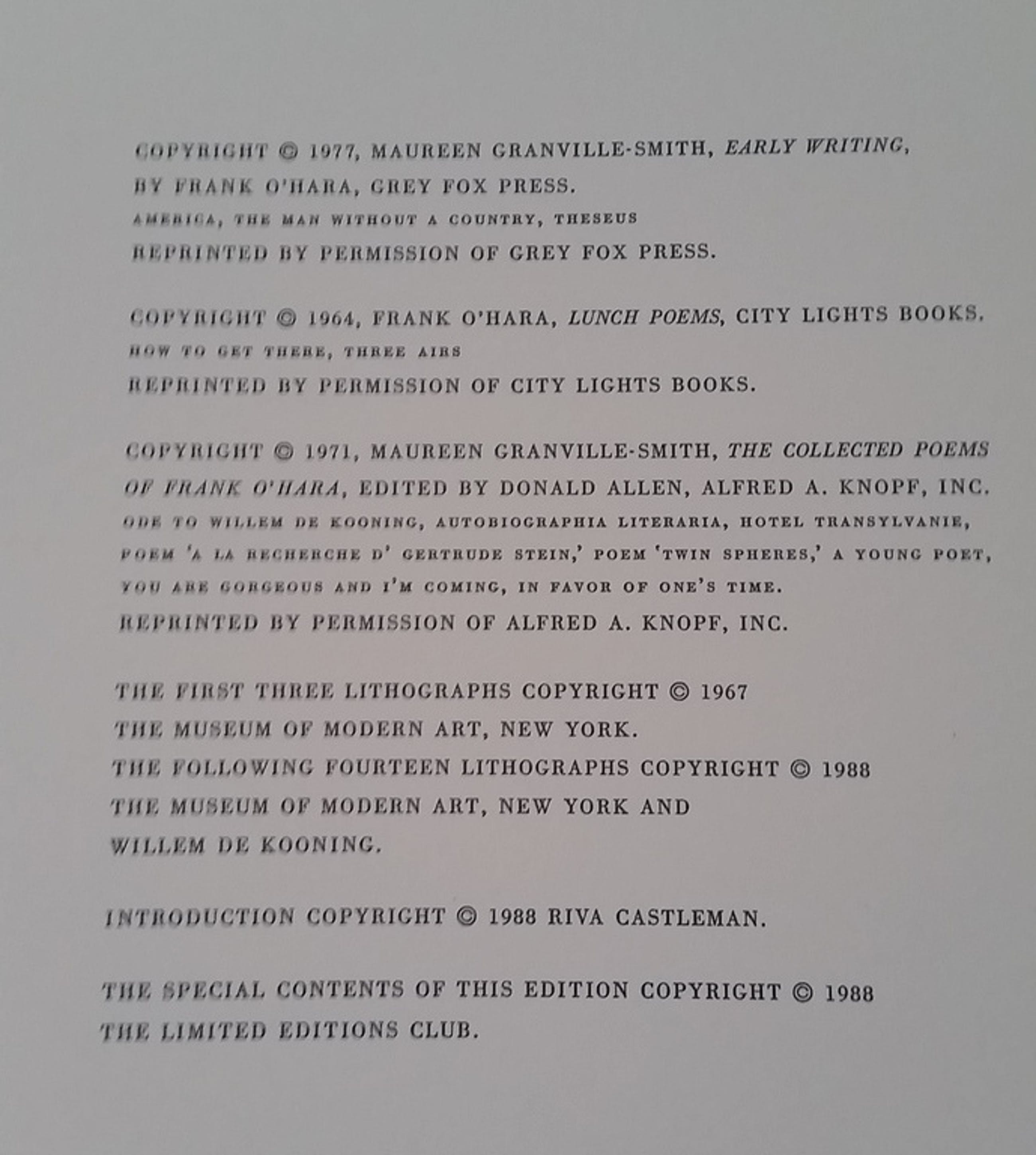 A quarter of a century later, the mylar drawings were transferred to lithographic plates and printed under the supervision of the artist and the Museum of Modern Art solely in order to illustrate the Club’s edition of those O’Hara poems that had so moved de Kooning.