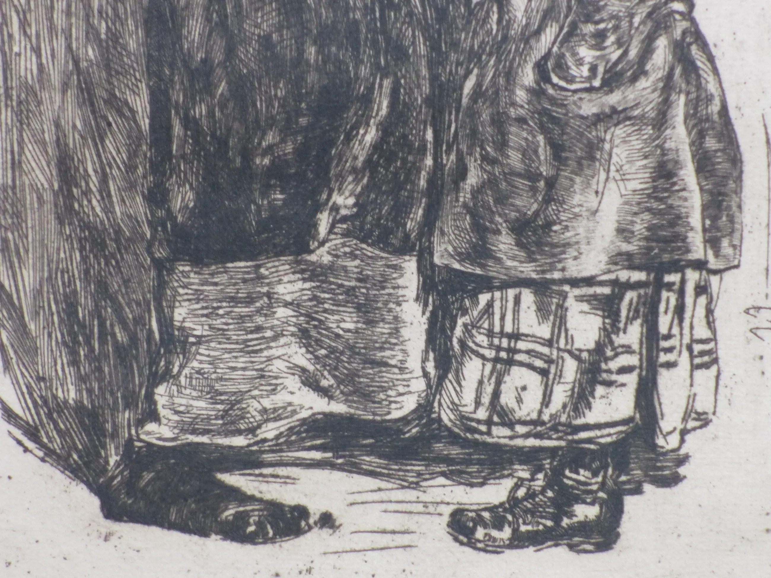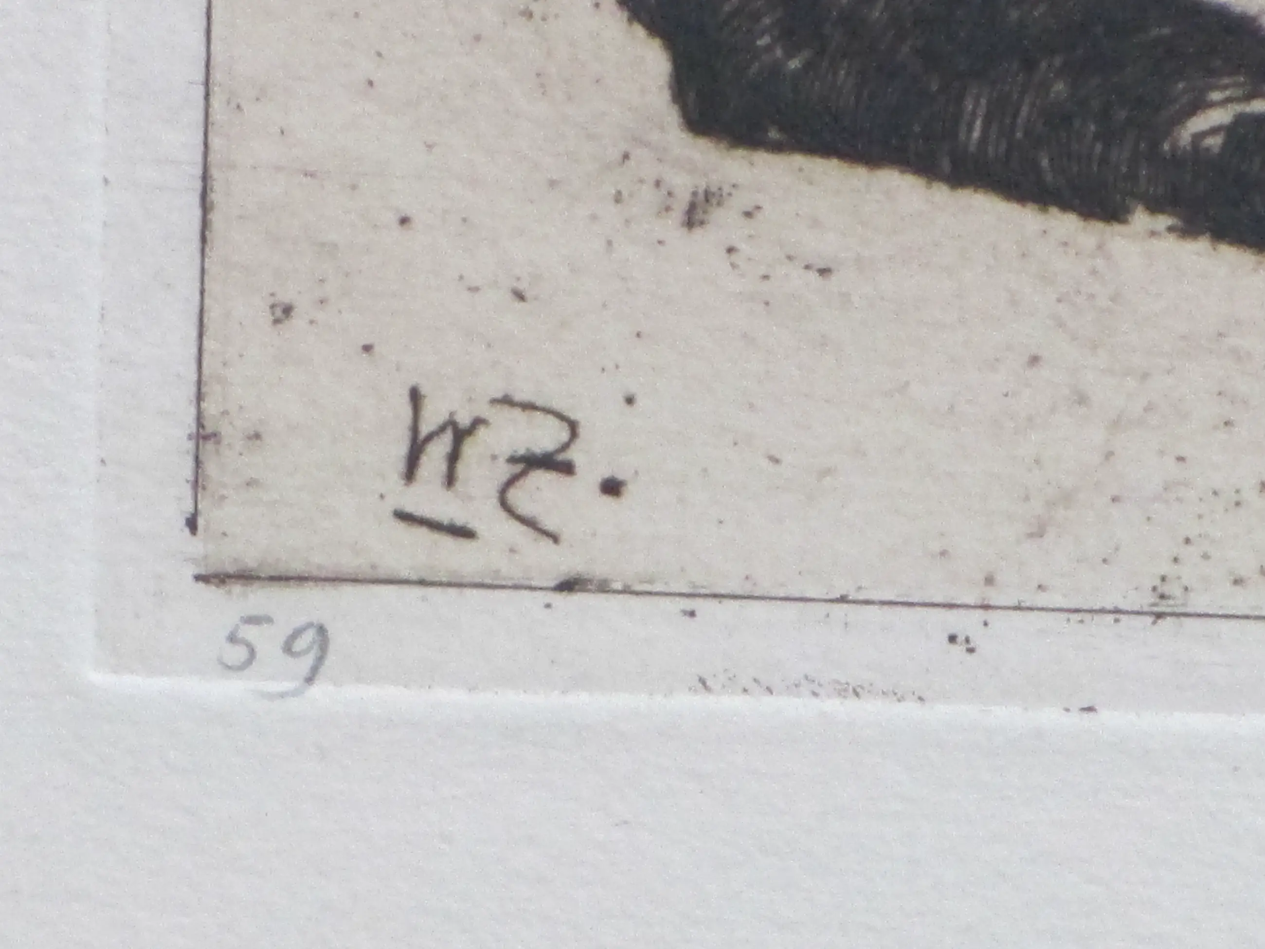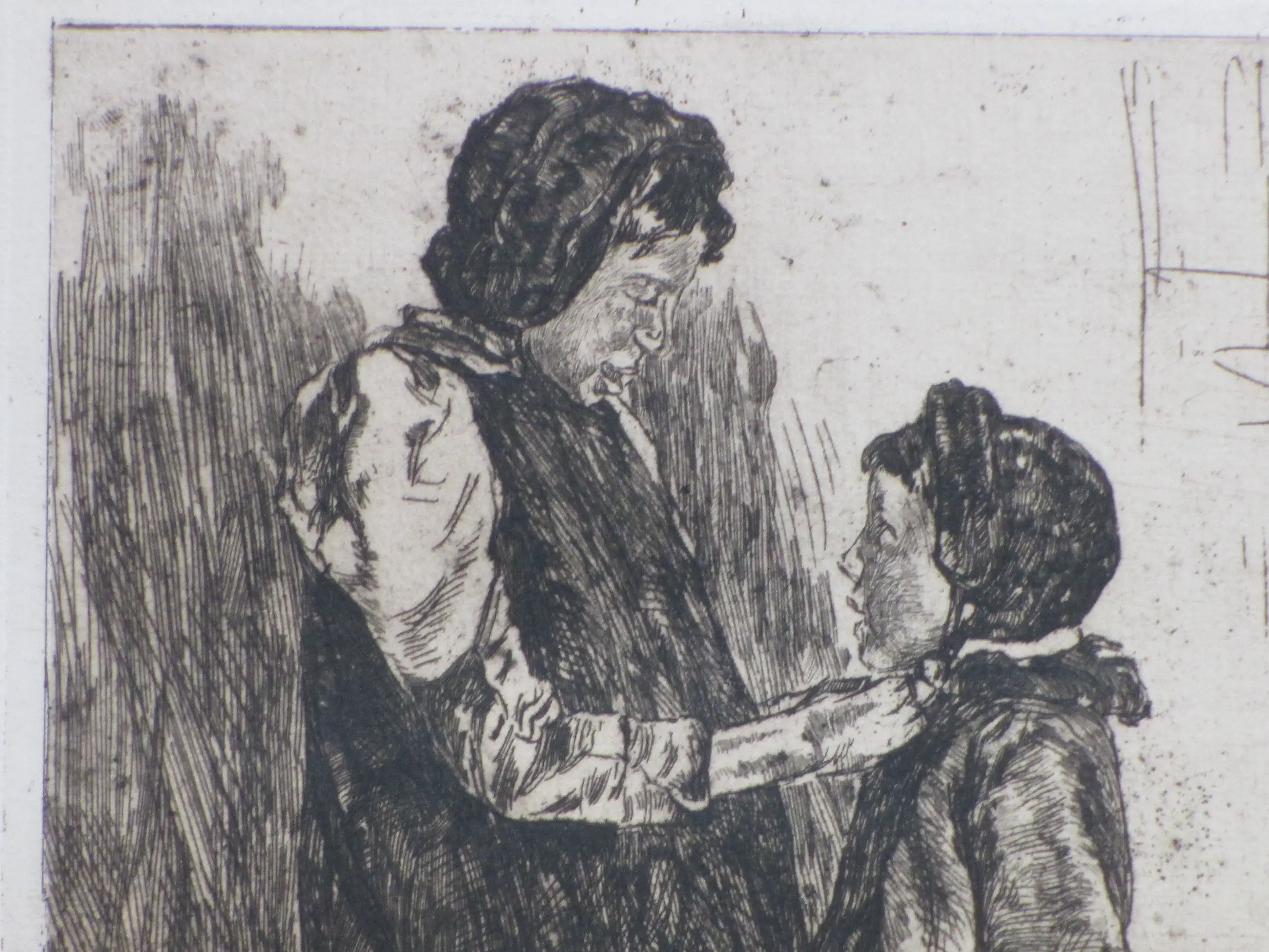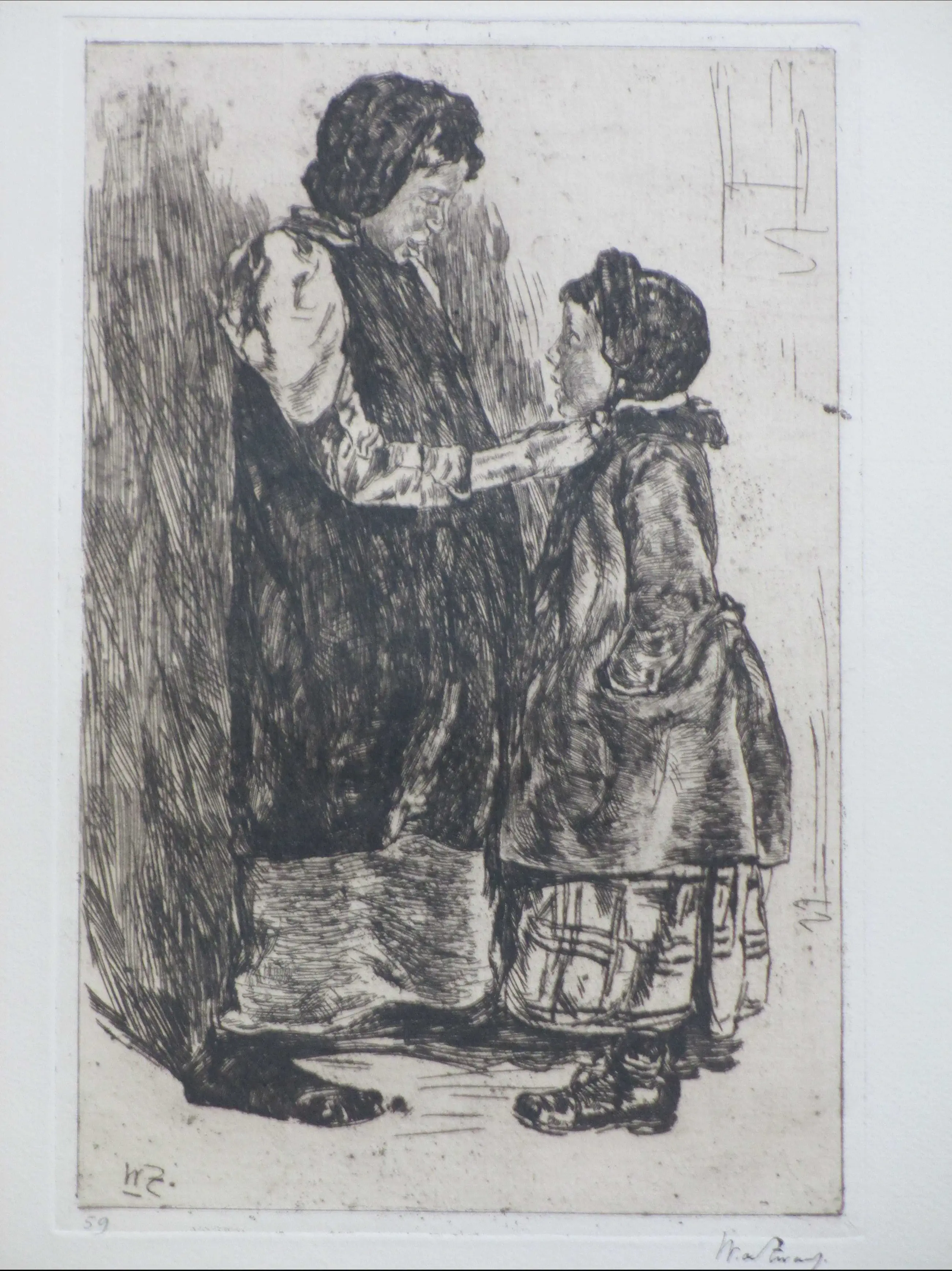 Ets door Willem de Zwart. Voorstelling van een moeder en een meisje. Losbladig, beeldmaat 25x16, bladmaat 45x32 Gesigneerd in inkt r.o. : 'W de Zwart' Genummerd in potlood l.o.: '59' en gemonogrammeerd l.o. in de druk: 'WZ' Literatuur: Bionda, nr 69 'Aakleden' en De Vries 1943 afb 47