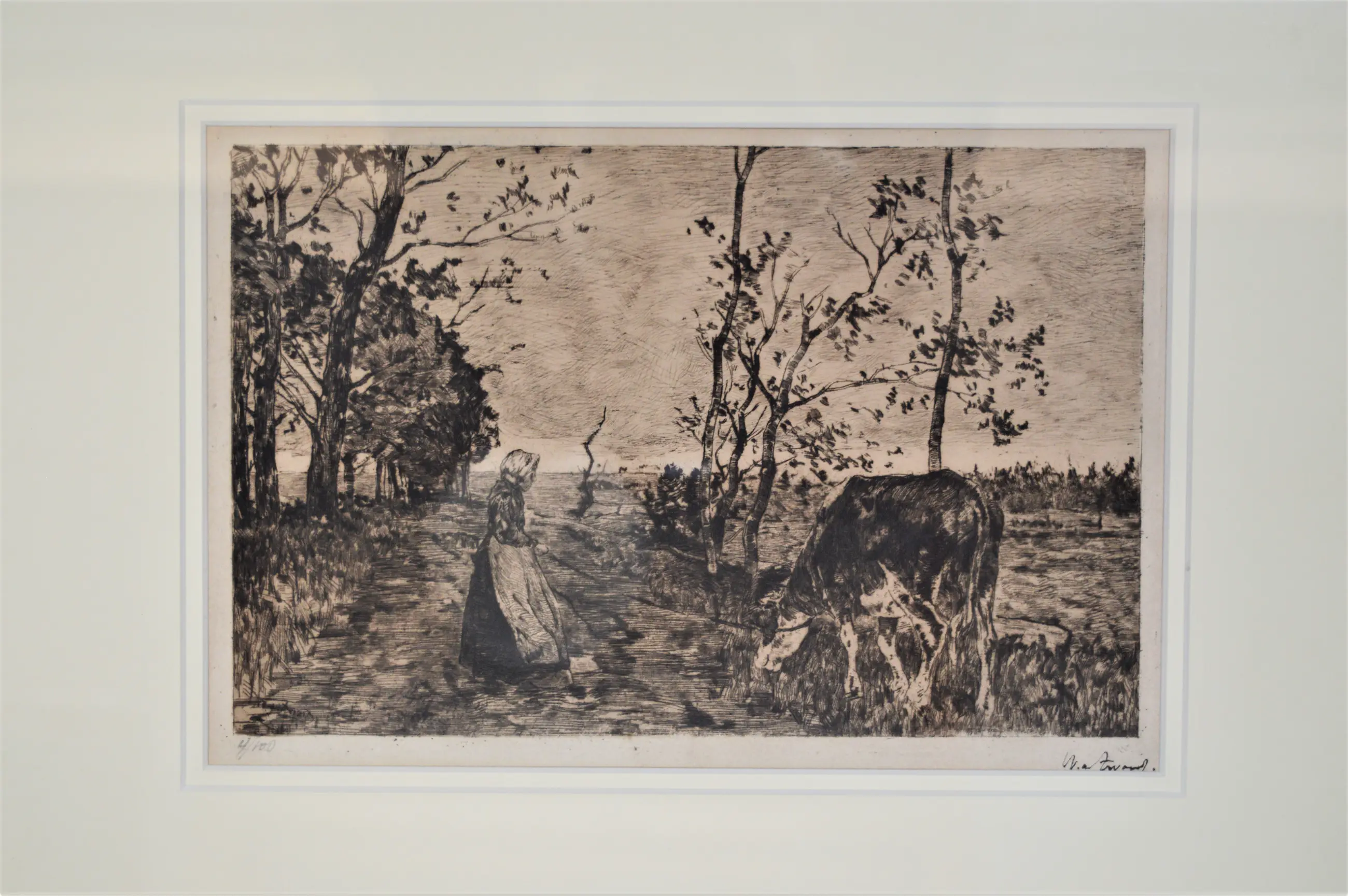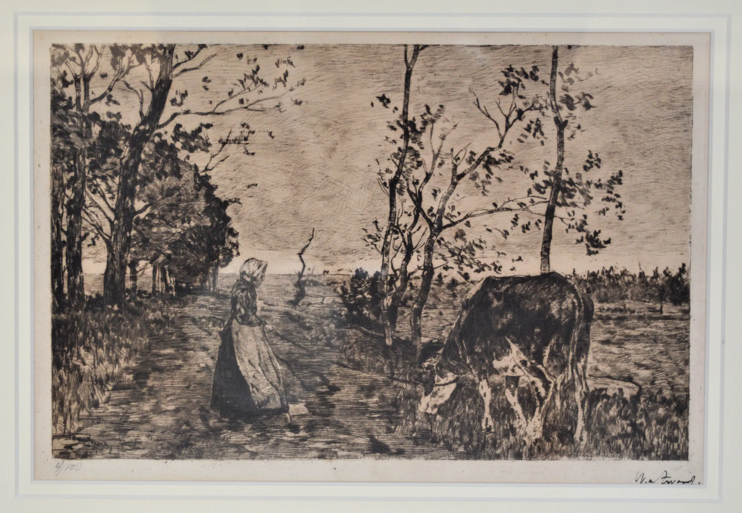 Een mooi ingelijste ets, geplaatst achter zuurvrij passe-partout. Uitgegeven door Van Wisselingh & Co. Rechtsonder gesigneerd met inkt. Linksonder met potlood genummerd 4/100. Na de druk werden de etsplaten vernietigd. Beschreven in het boek "Willem de Zwart" van Richard Bionda blz. 103 - no. 75.